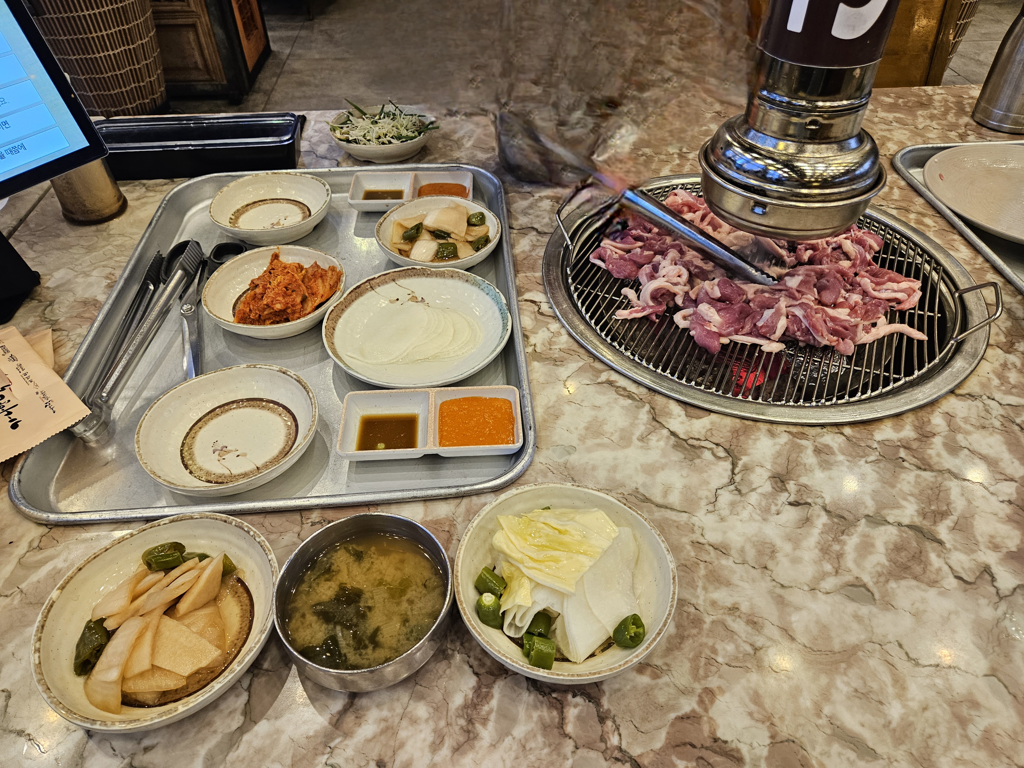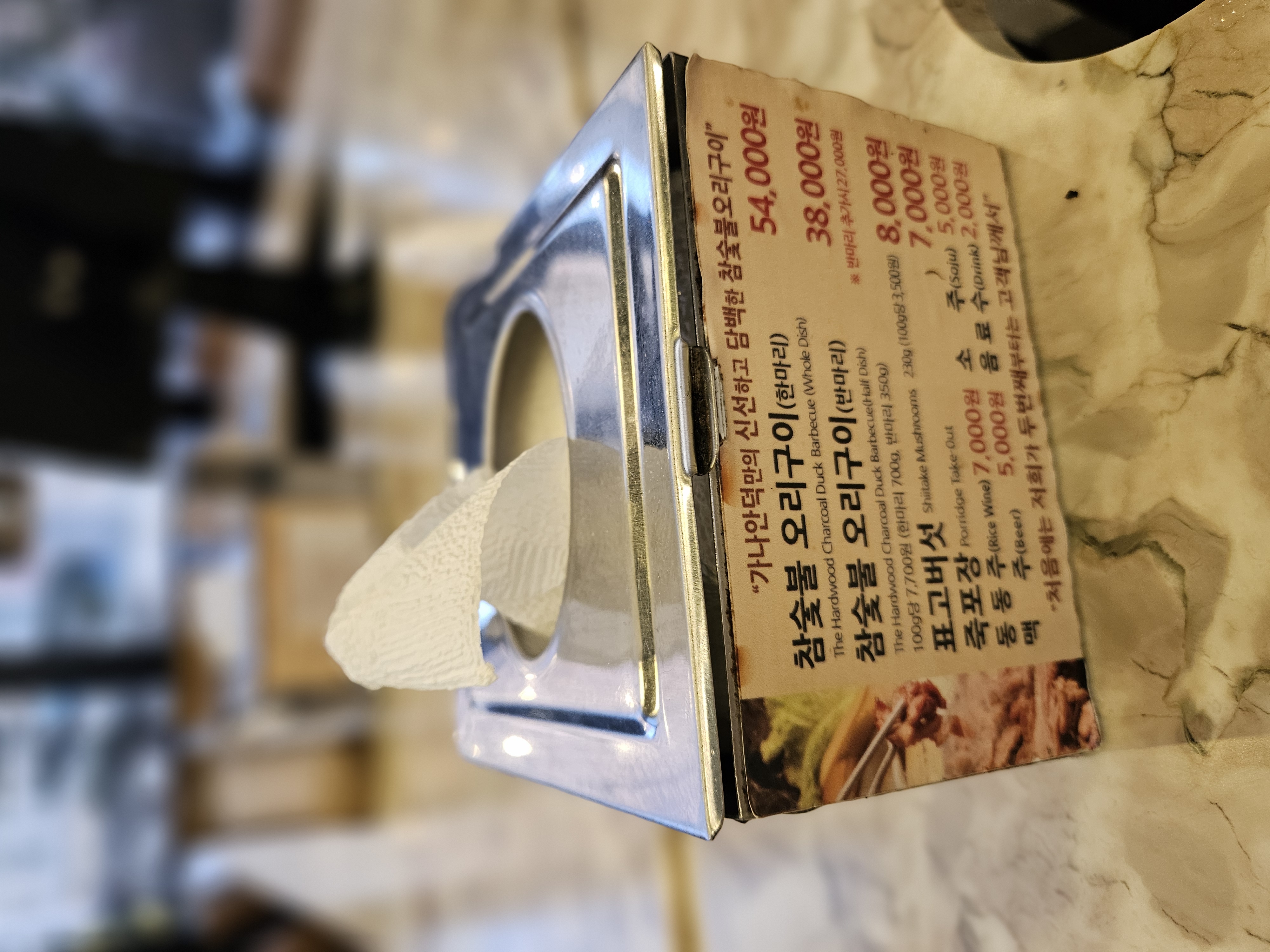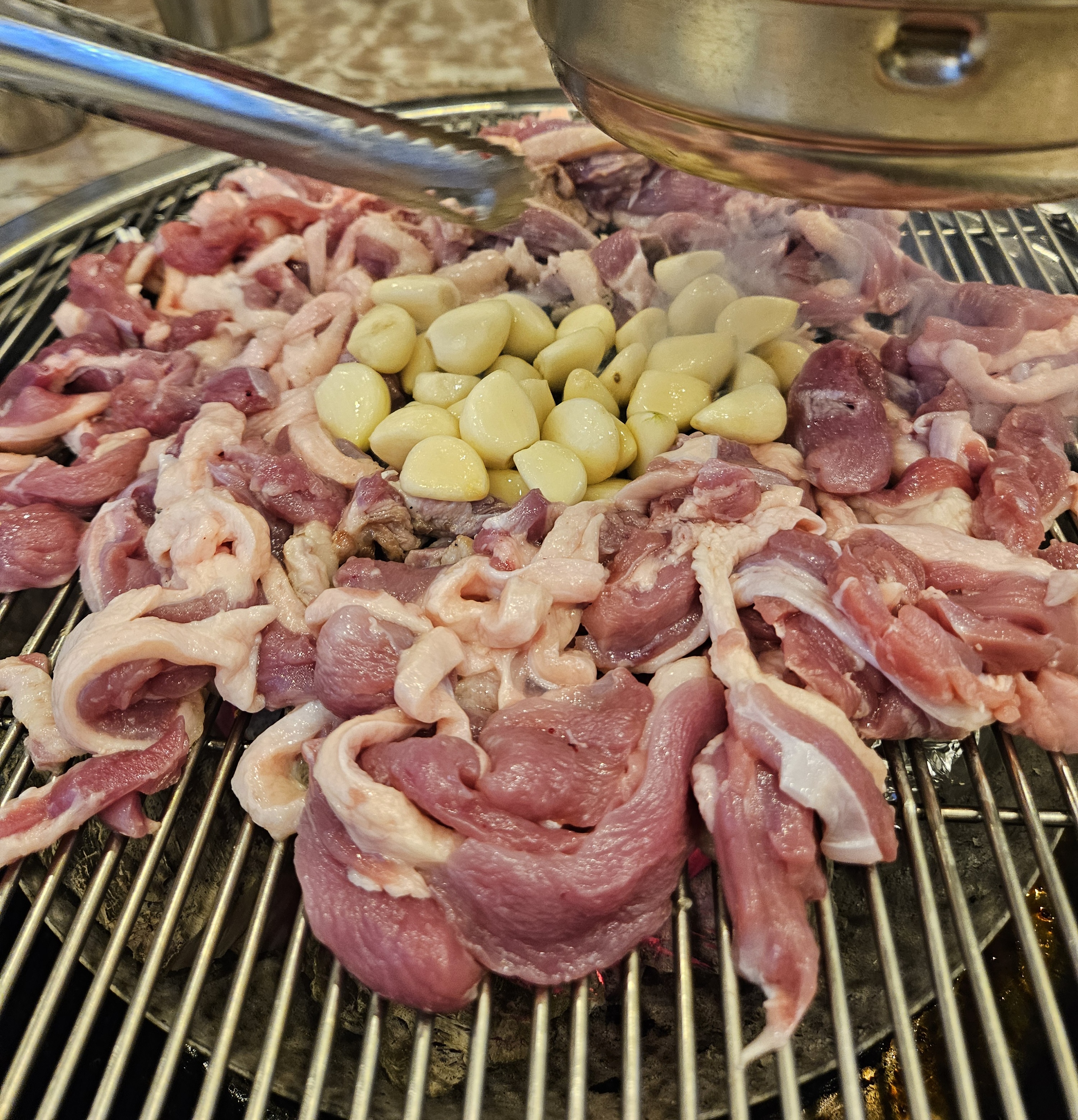 생 오리고기는 질이 좋아보이는데 덜궈진 불판에 1마리 모두와 생마늘 얹어 굽기 시작. 양념육이 아닌 생오리라 쉽게 타지 않았으나 계속 두고 먹으니 타서 불판 교체가 필요했음.