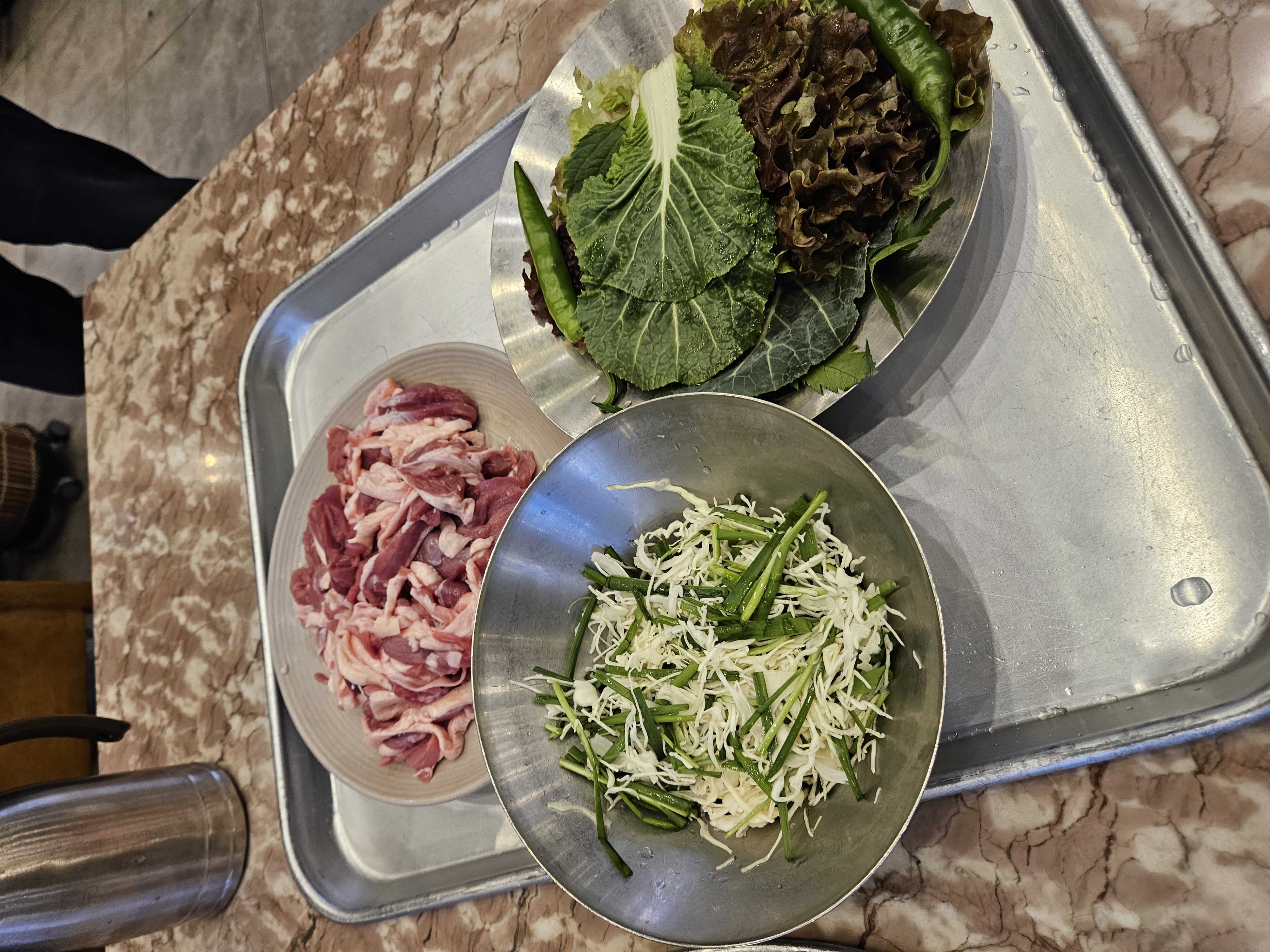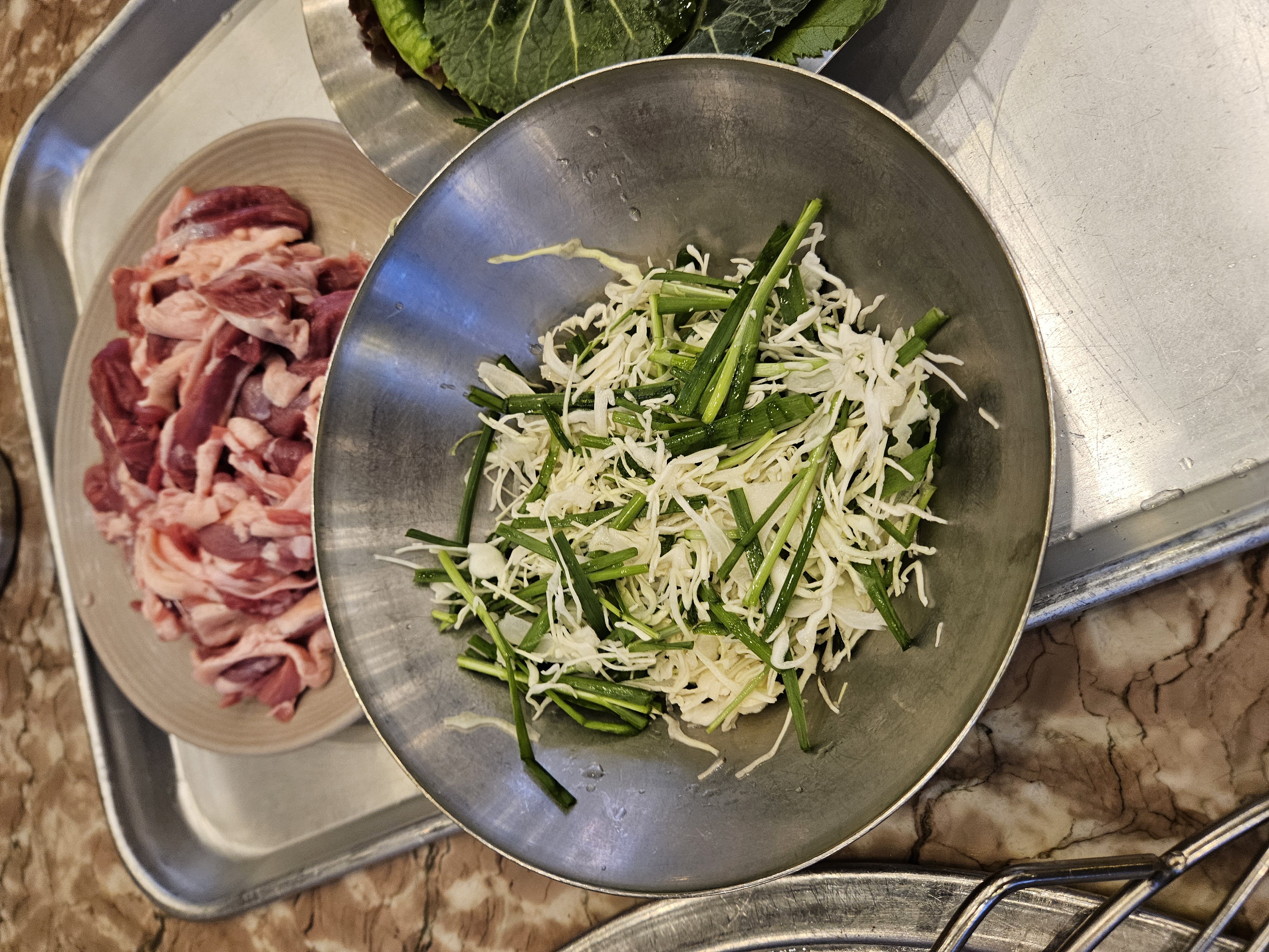 기본 찬으로 쌈채소, 피클, 배추김치, 양배추채 부추, 양념장과 간장, 쌈무가 고루 나왔다.