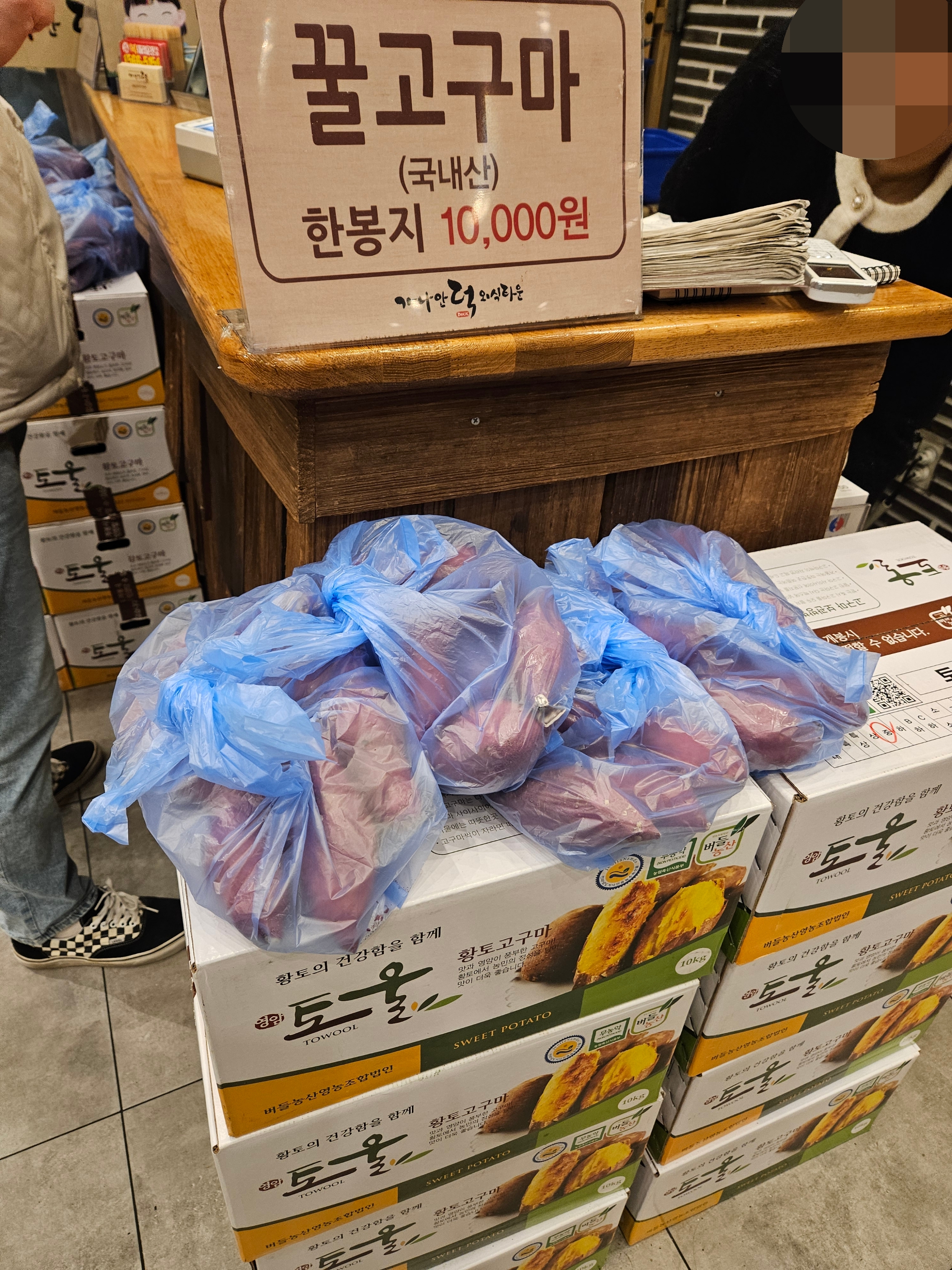 매장에서 구워주는 고구마는 황토 고구마라고 하는데 꿀고구마 한 봉지 만 원에 판매한다.