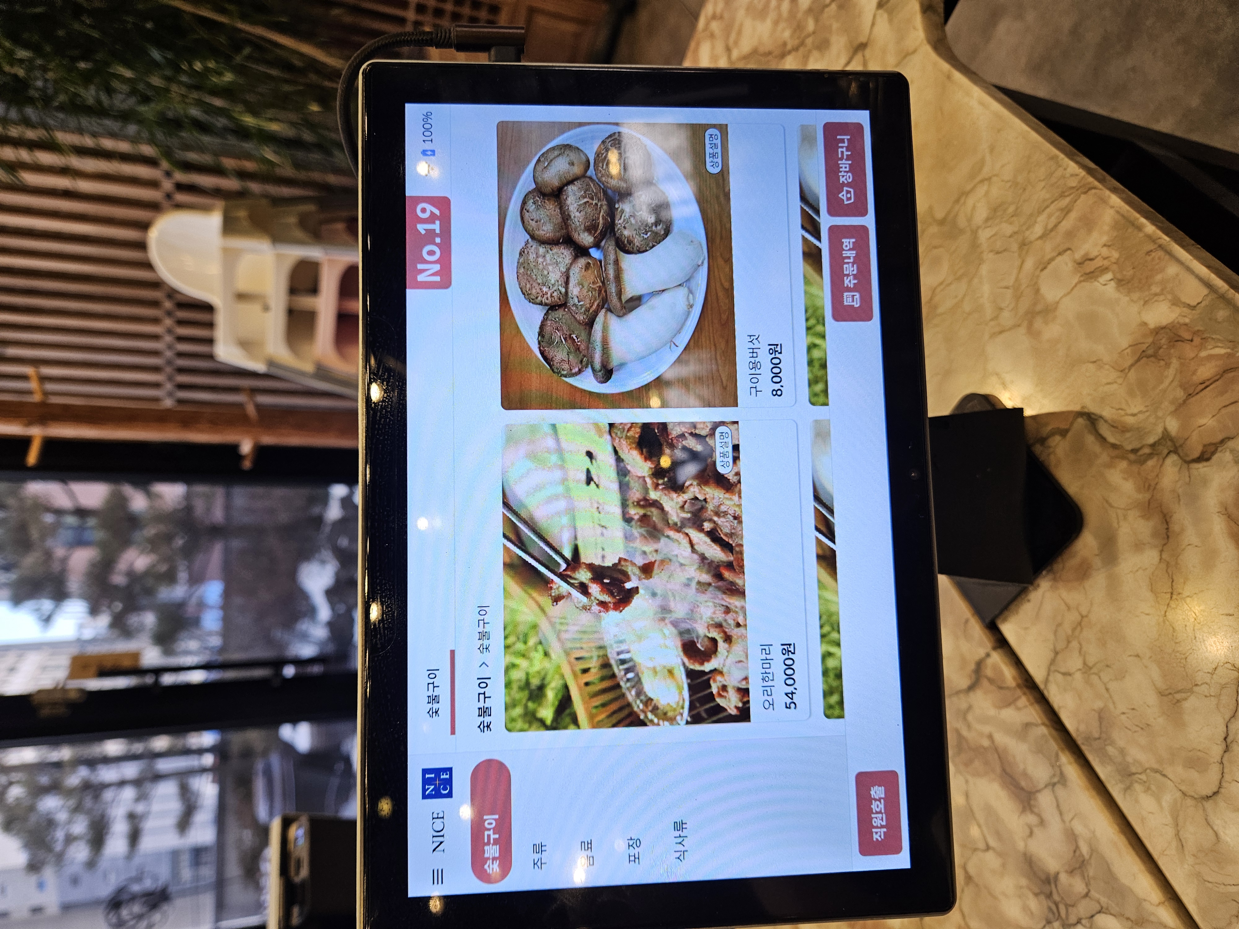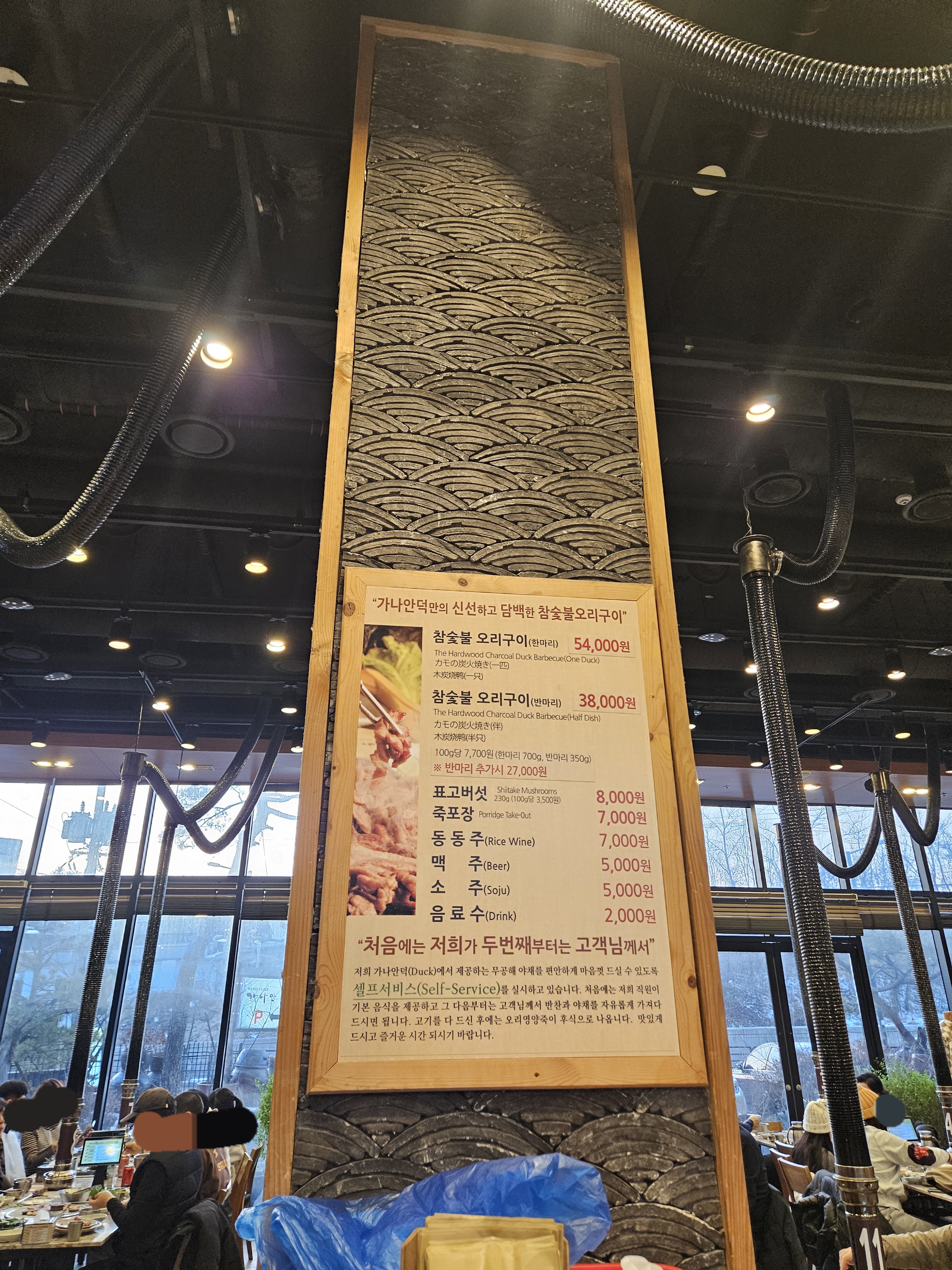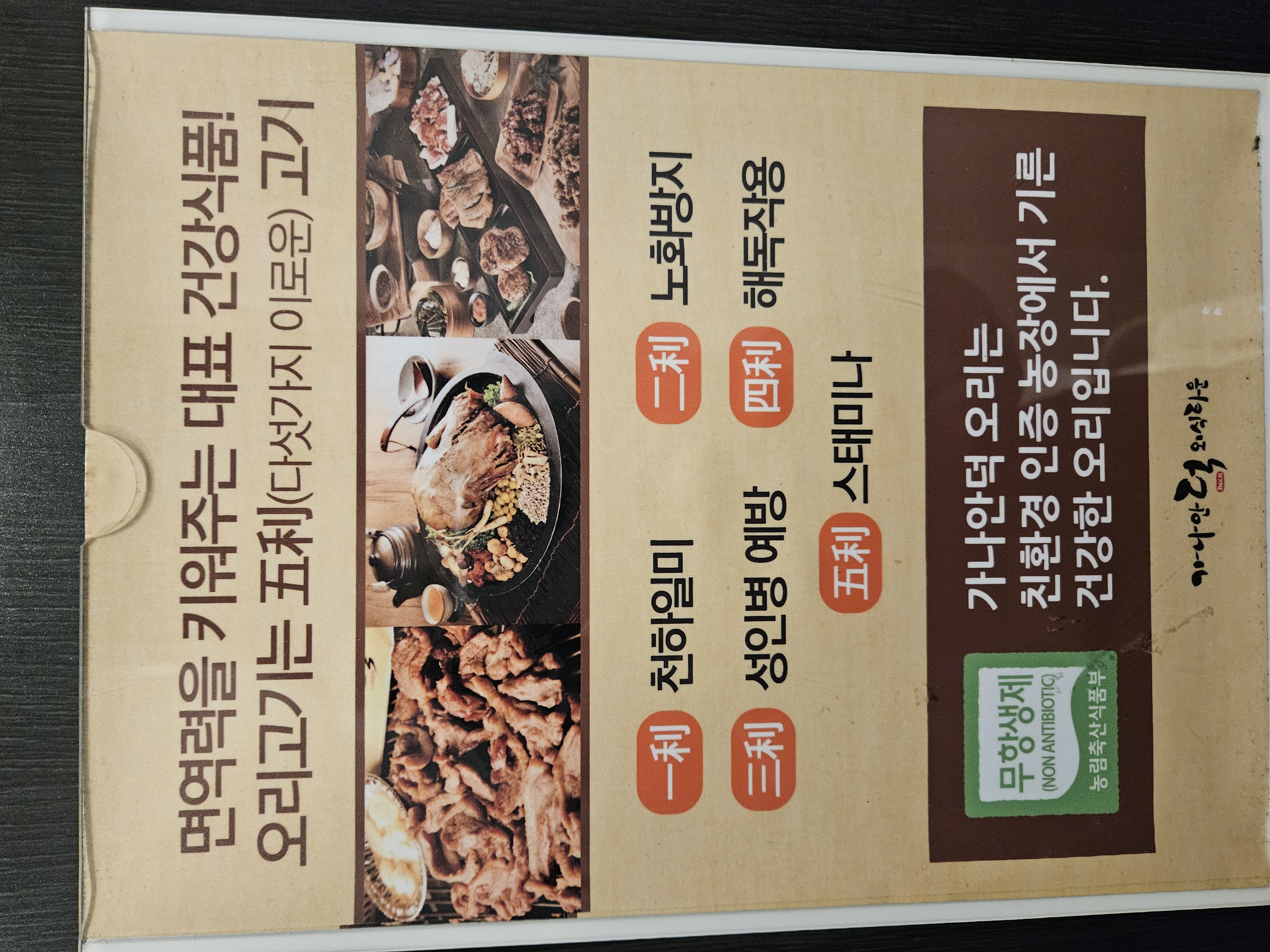 메뉴는 참숯불 오리구이 한 마리(700g. 54,0)와 반 마리(360g, 38,0). 구이용 표고버섯(230g, 8,0)과 죽포장(7,0).