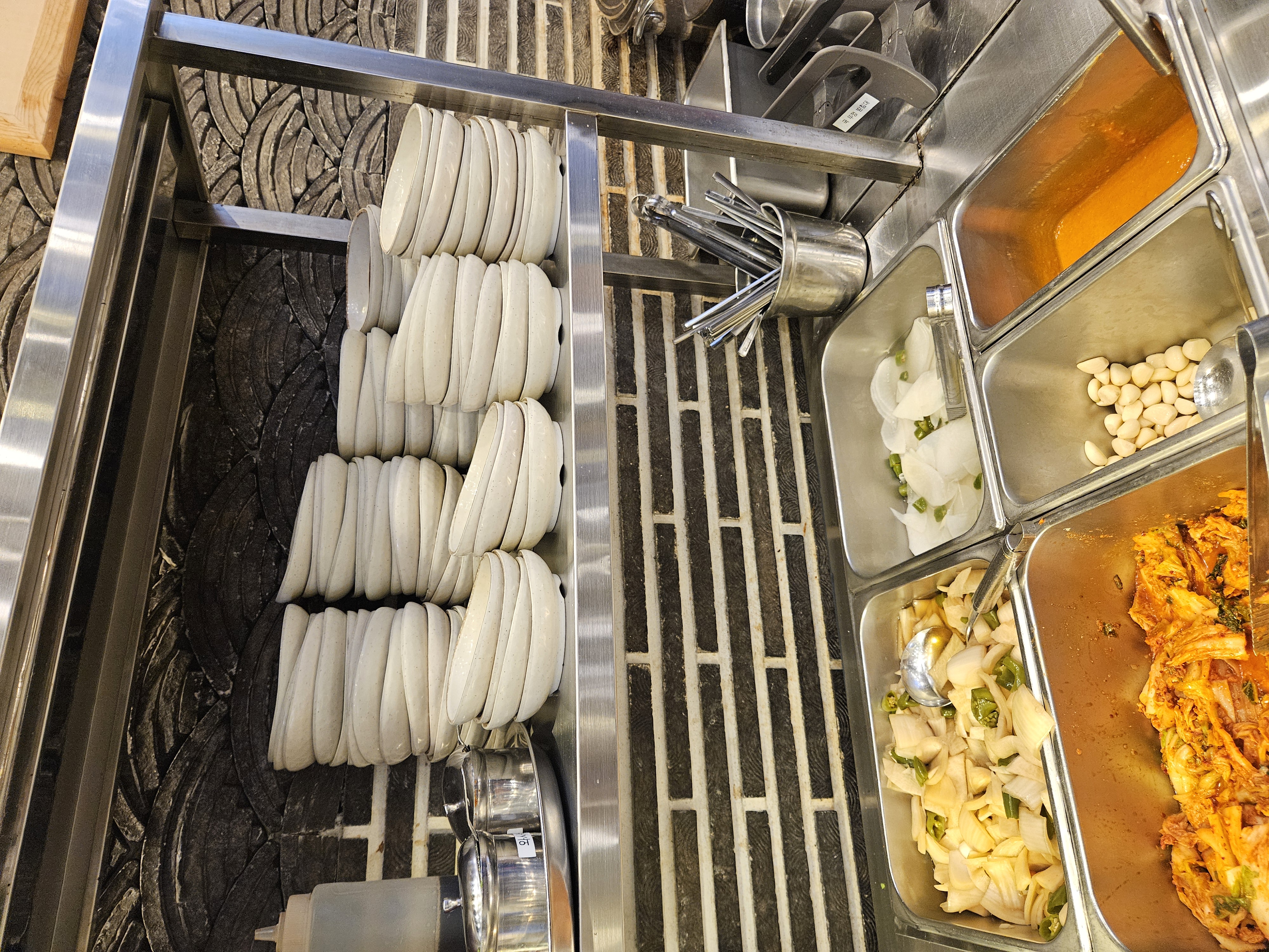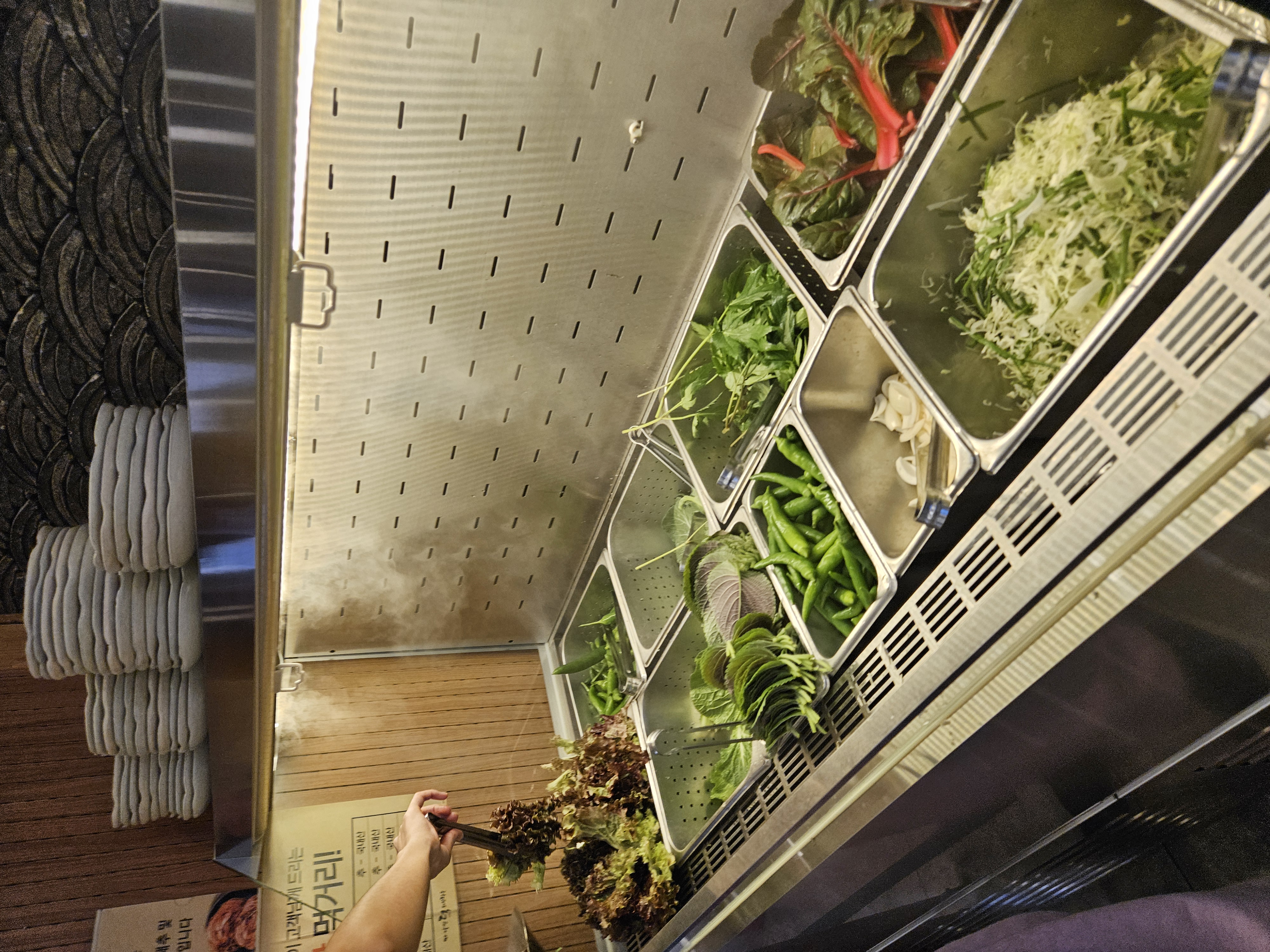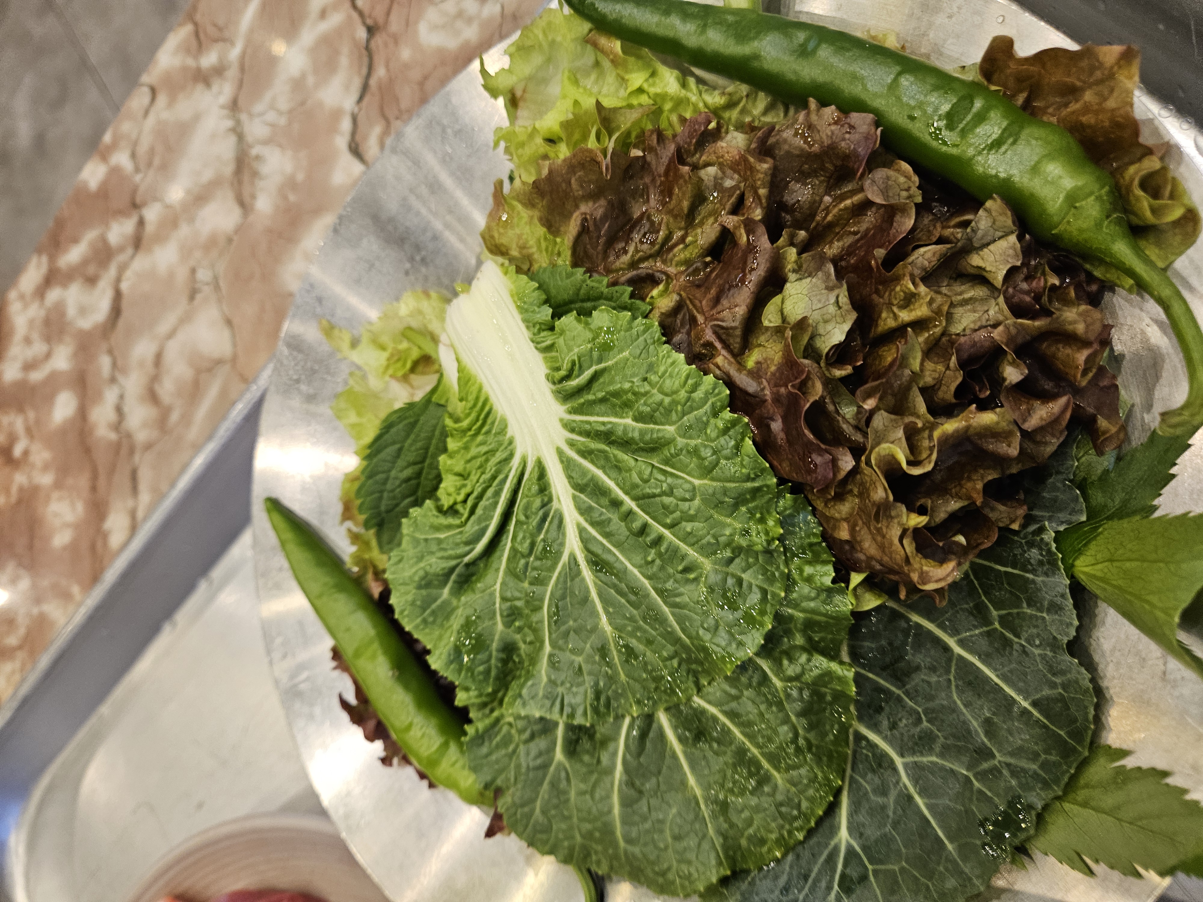 처음 기본 찬은 제공되고 이후 셀프바에서 다양한 쌈채소 가져다 먹을 수 있는데 가나안 덕 장점이라 양질의 단백질과 비타민 무기질 가득한 다양한 채소 맛볼 수 있어서 좋다.