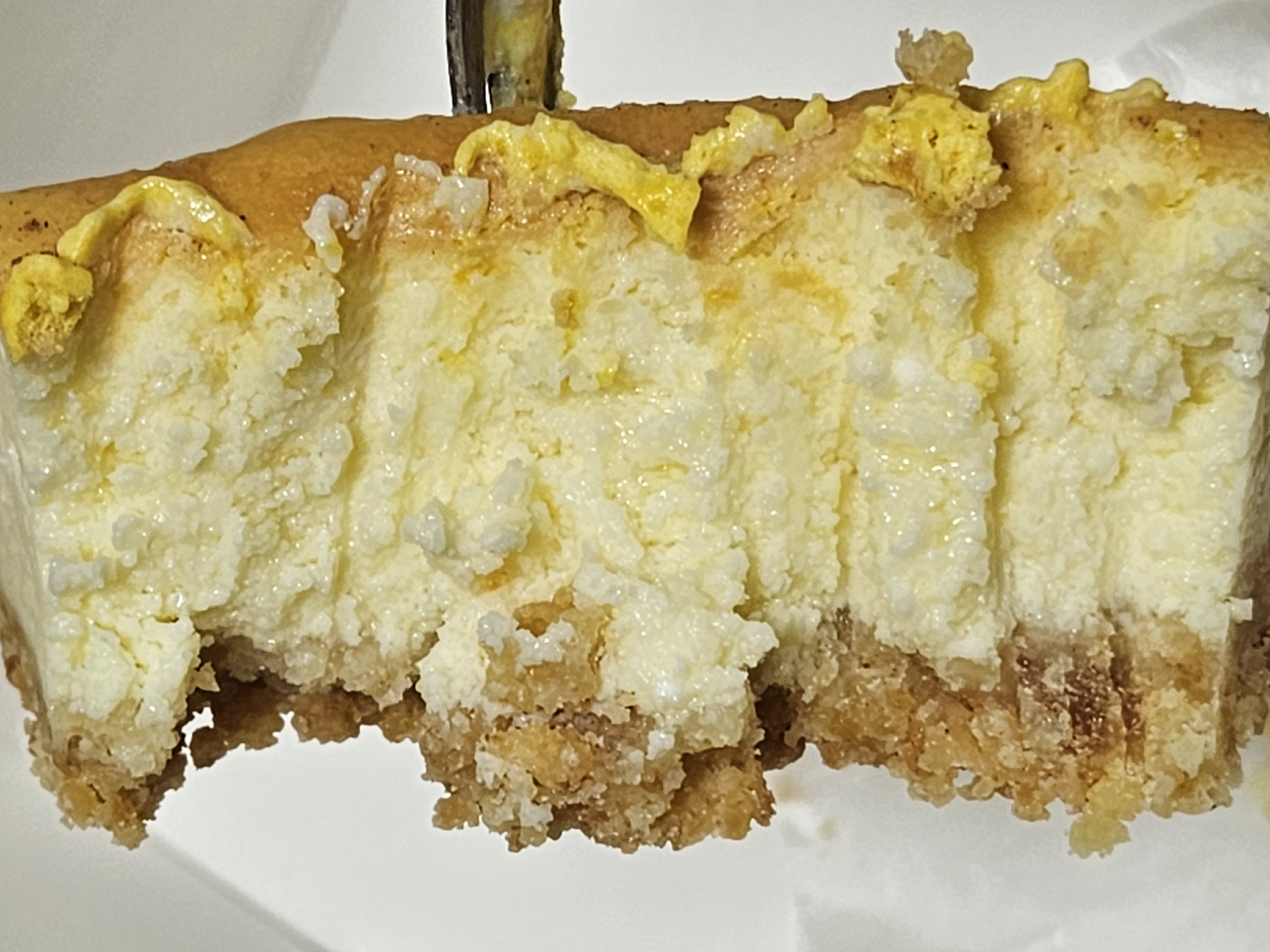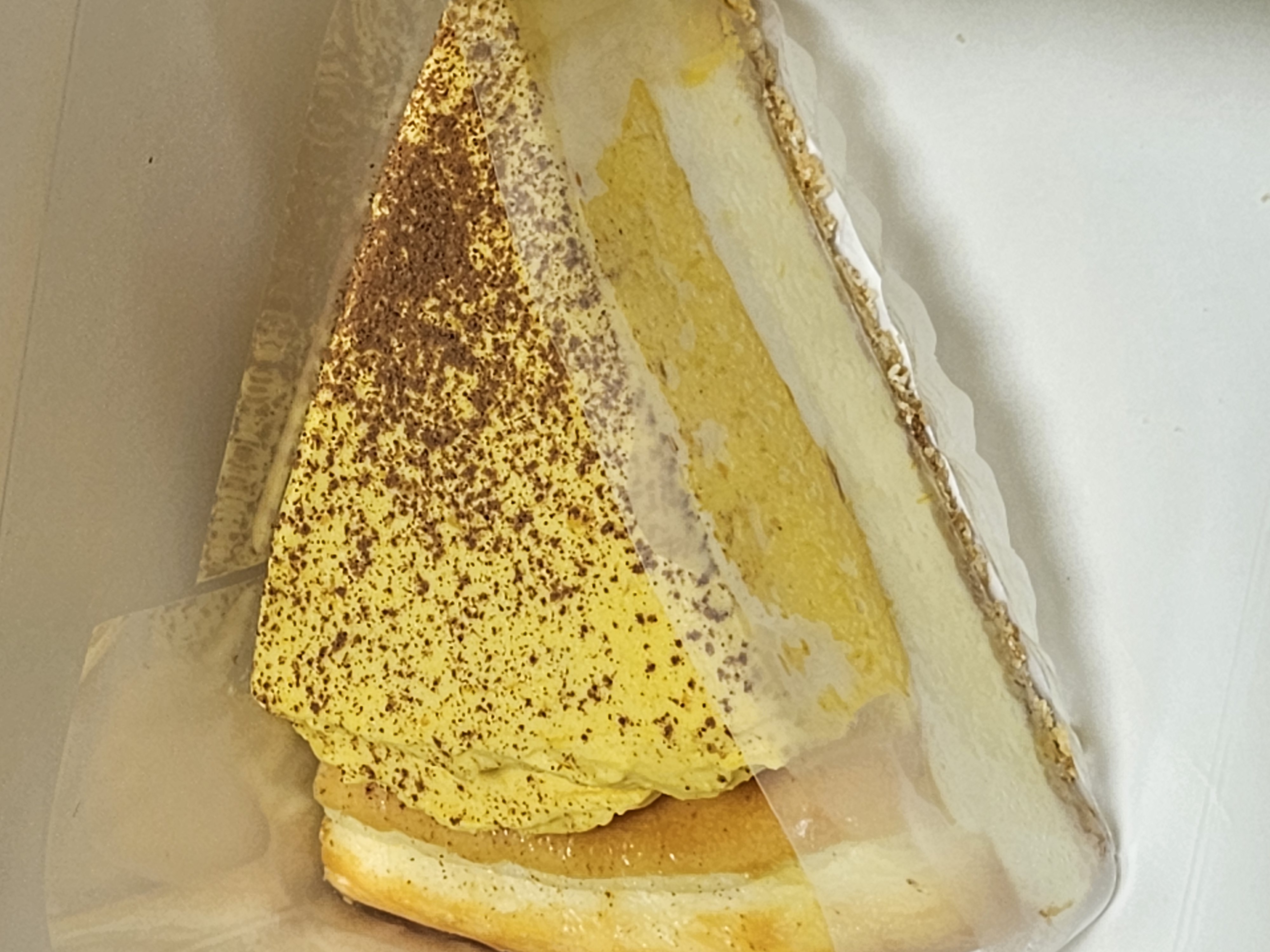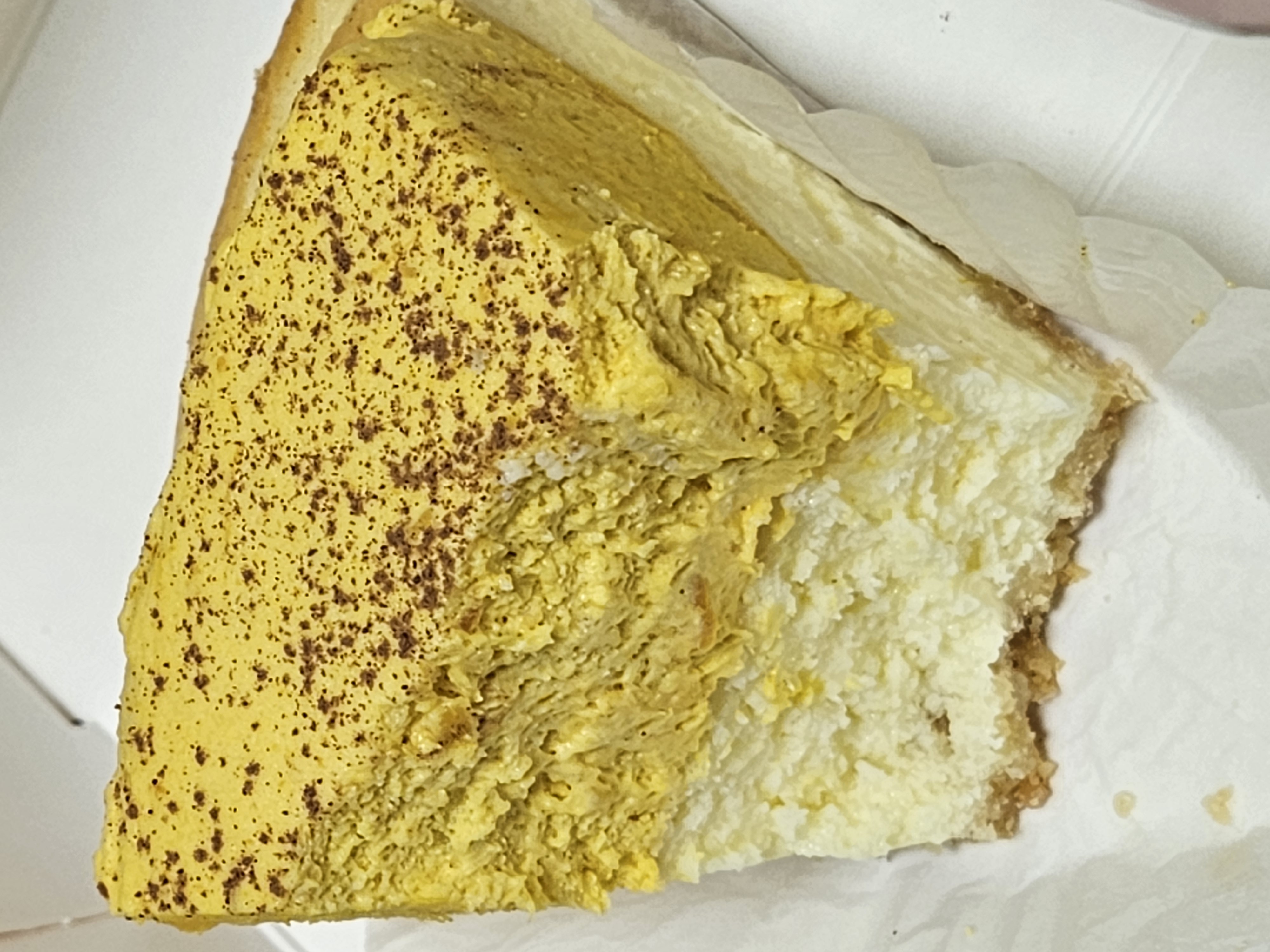오리지널 베이크드 치즈케이크에 단호박 무스, 수제 쌀 비스킷으로 레이어한 케이크로 부드럽고 촉촉하며 찰진 느낌. 시나몬 파우더로 계피의 향긋함을 더했고 달지 않아서 혼자서 두 조각 까지 거뜬히 먹을 수 있는 케이크.