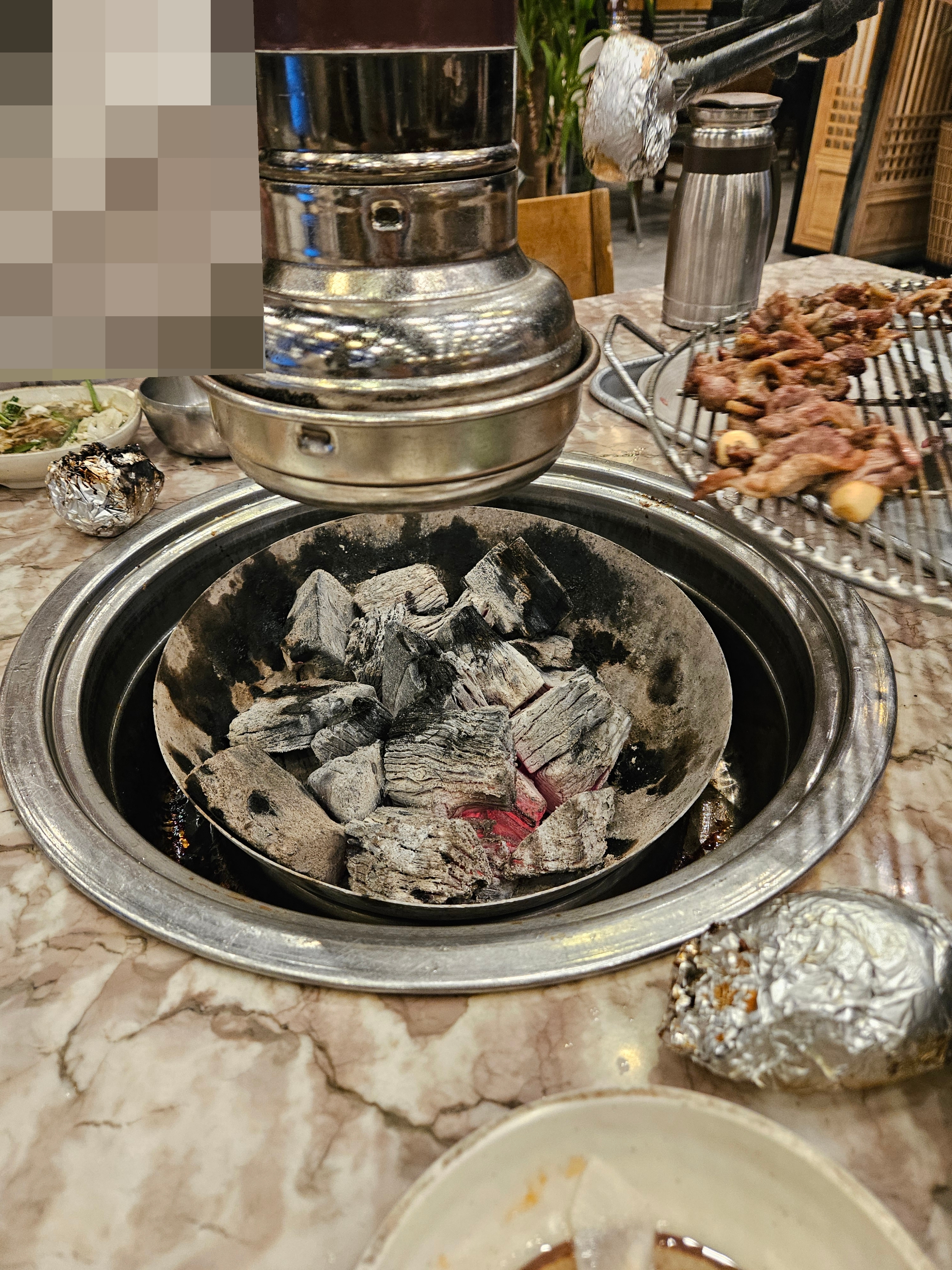 숯불 안에는 호일로 싼 고구마도 같이 구워줌.