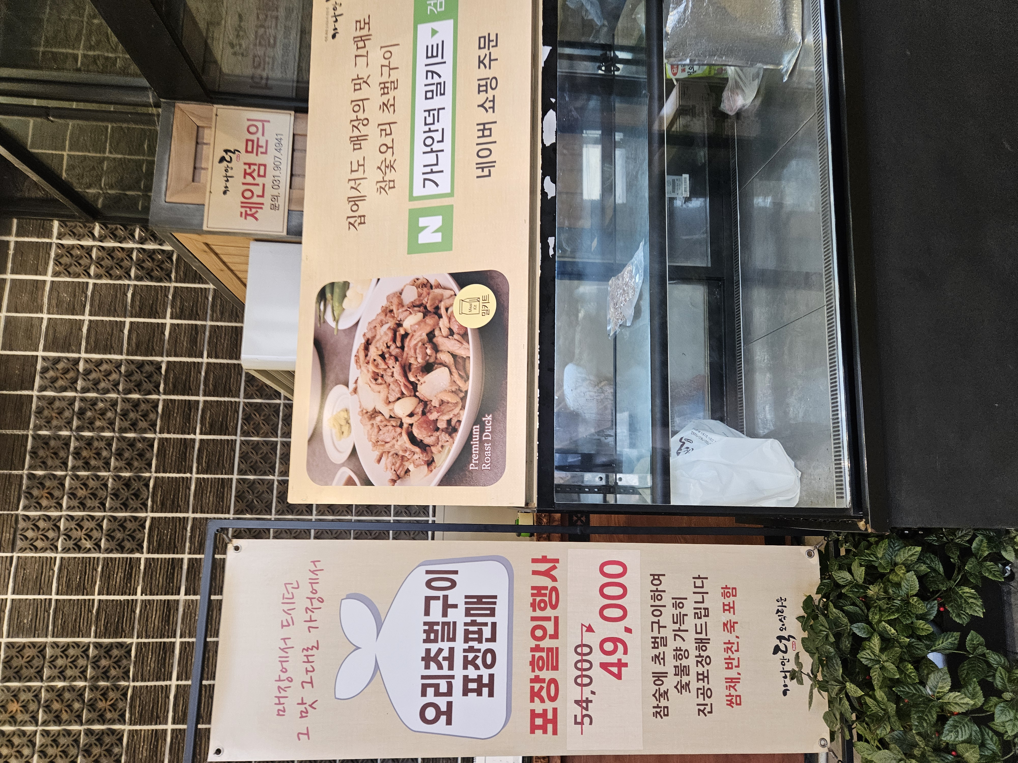 멀어서 방문이 어렵다면 네이버 쇼핑으로도 가나안덕 밀키트 주문이 가능하다고 하며, 오리초벌구이 포장 할 경우 5천 원 할인가(49,0)에 진공포장(쌈채, 반찬, 죽 포함)도 가능하다고 하니 참고.