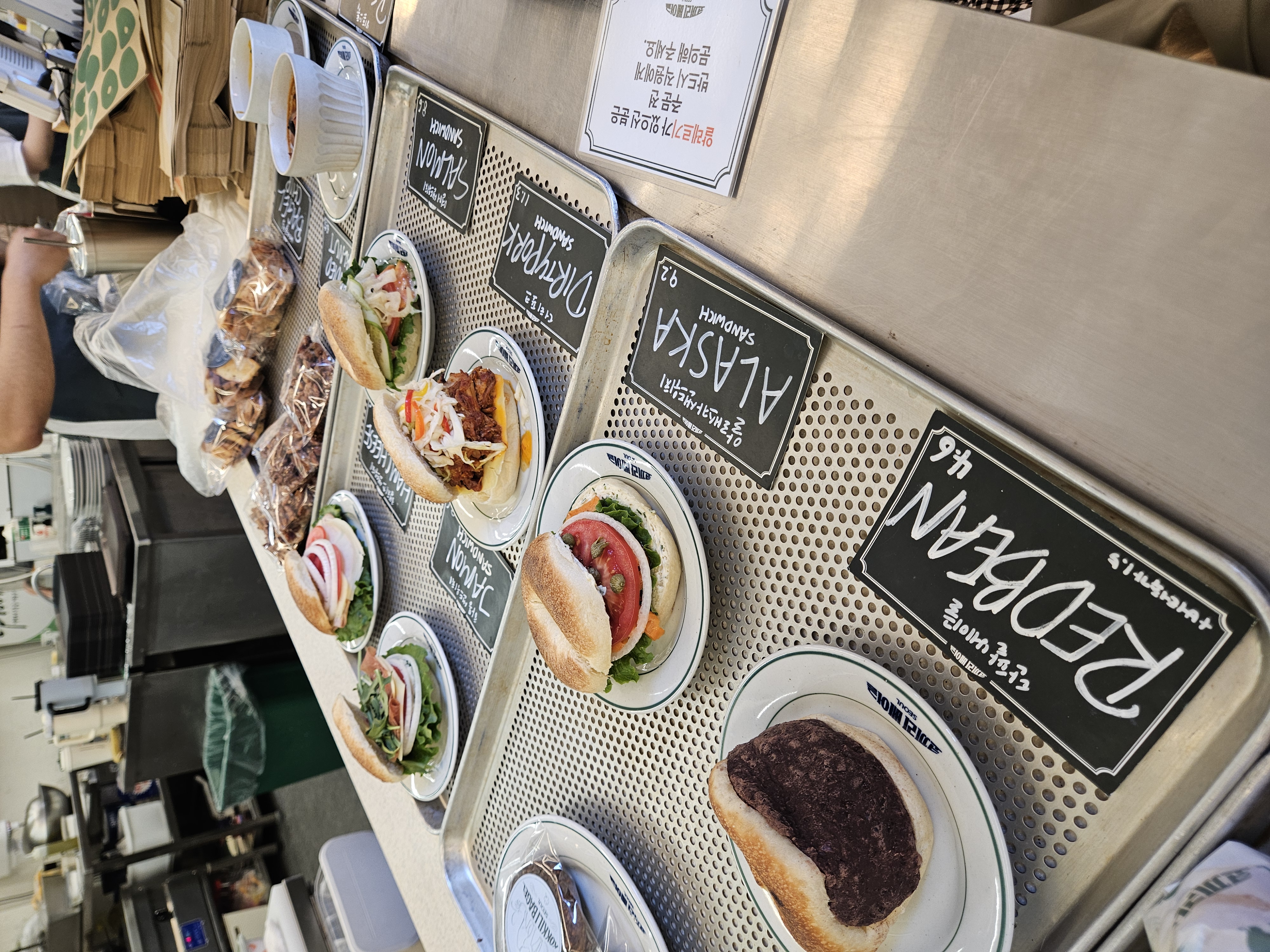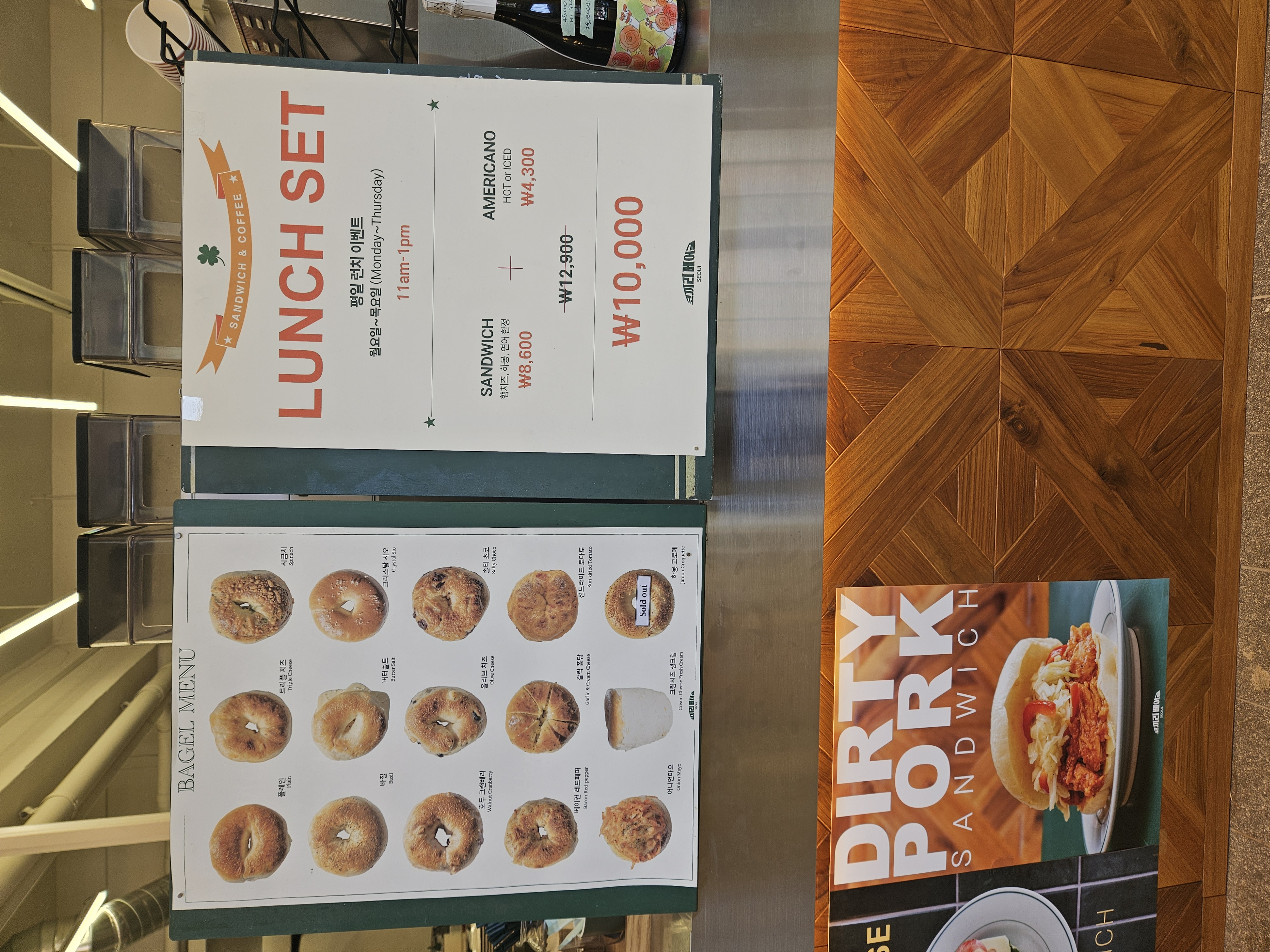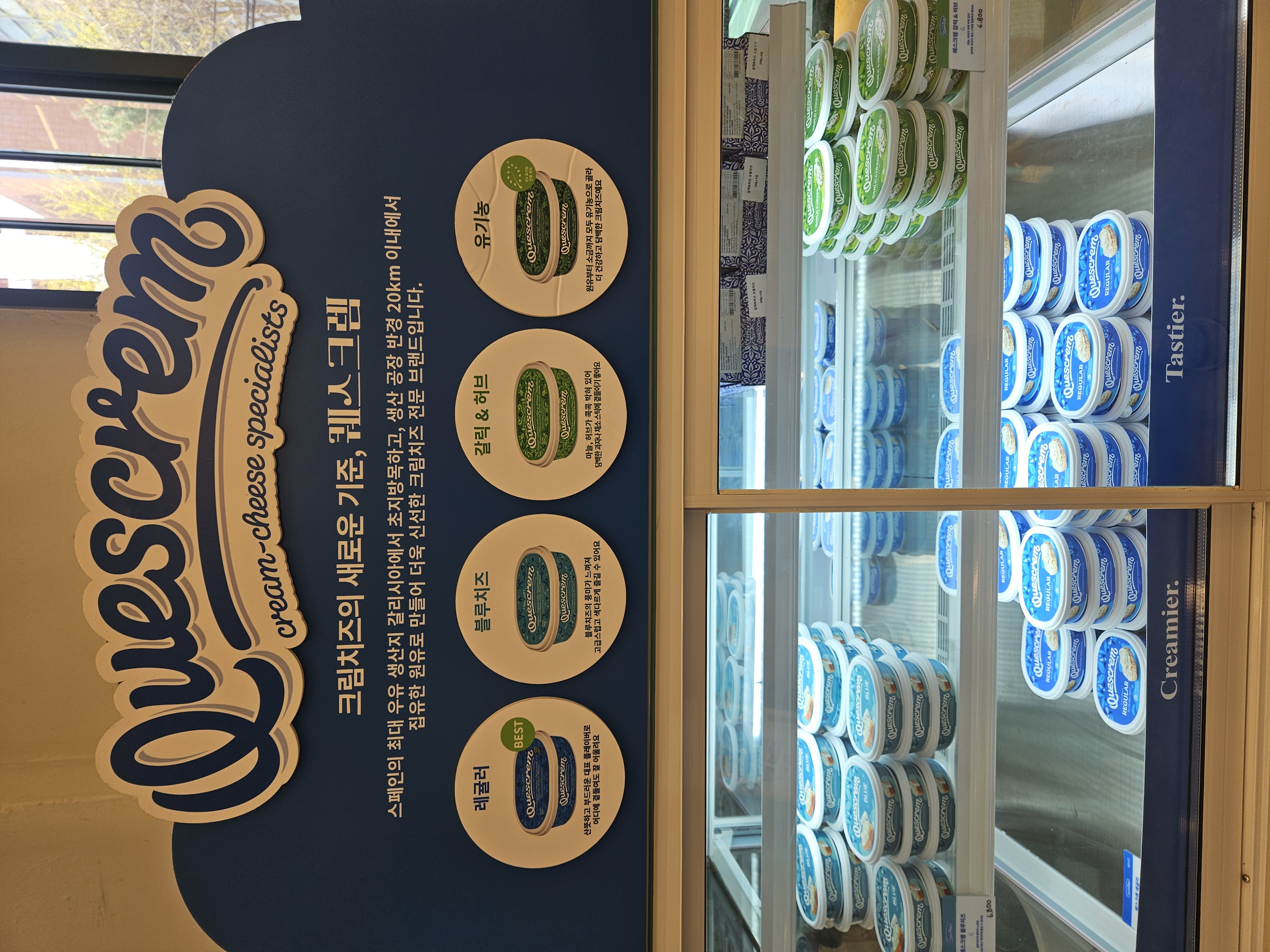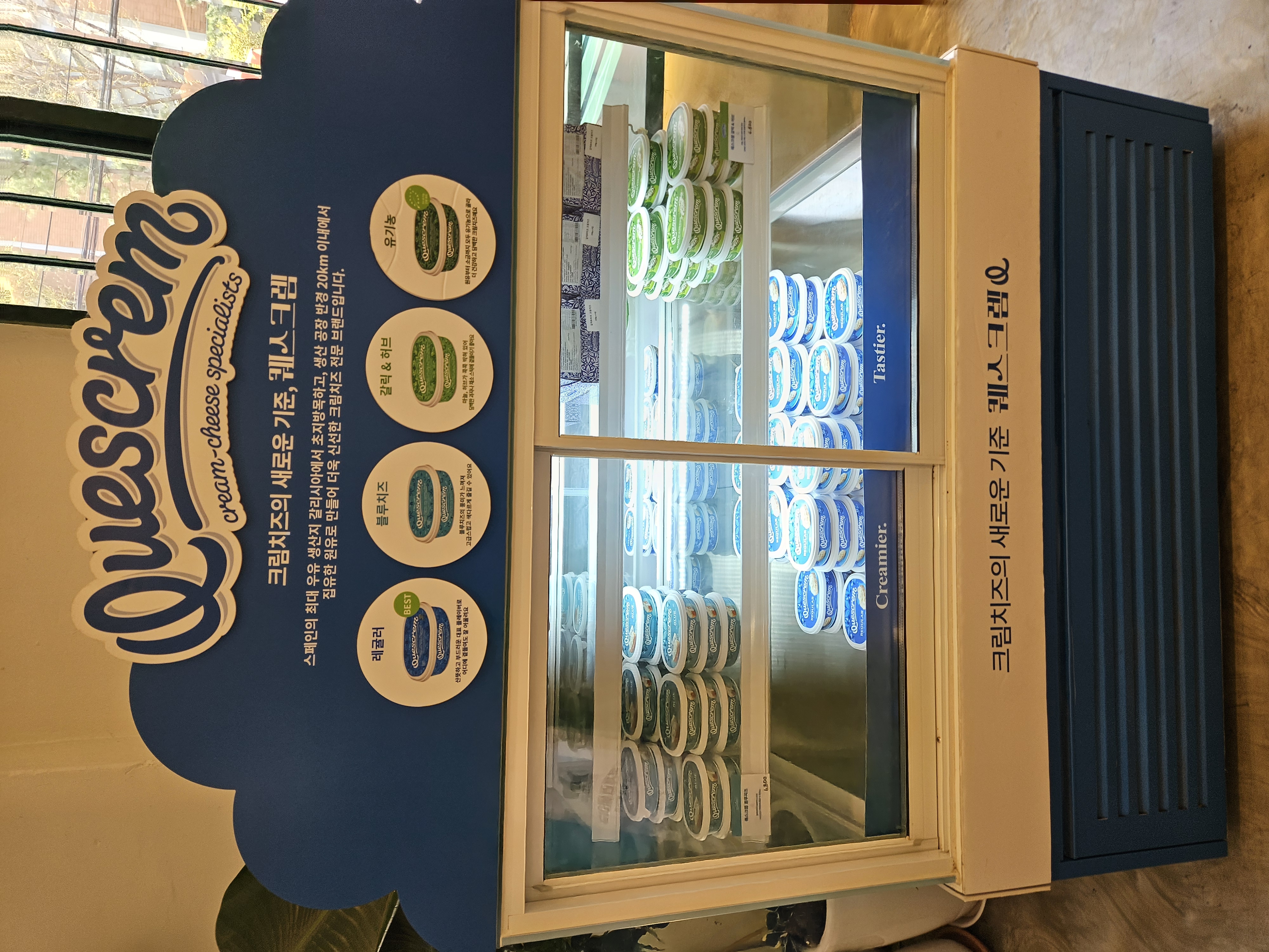 들아가서 왼편에는 스페인산 크림치즈 라고하는 퀘스크렘 전용 냉장고가 있고, 우측 계단 앞 냉장고엔 음료와 병맥주 냉장고가 있어 베이글이나 샌드위치, 브런치, 스튜 등과 같이 마실 음료 및 주류도 구입 가능.