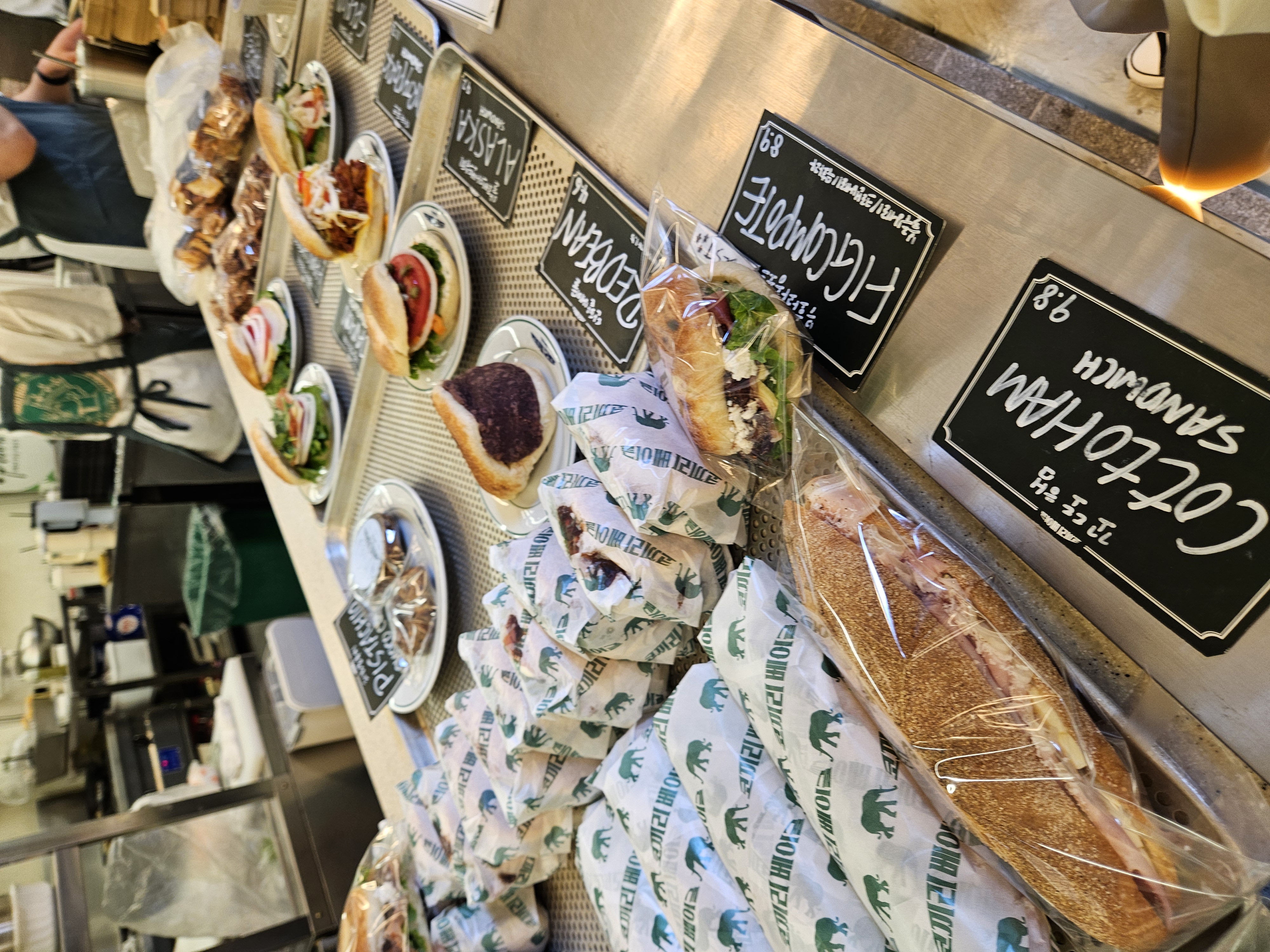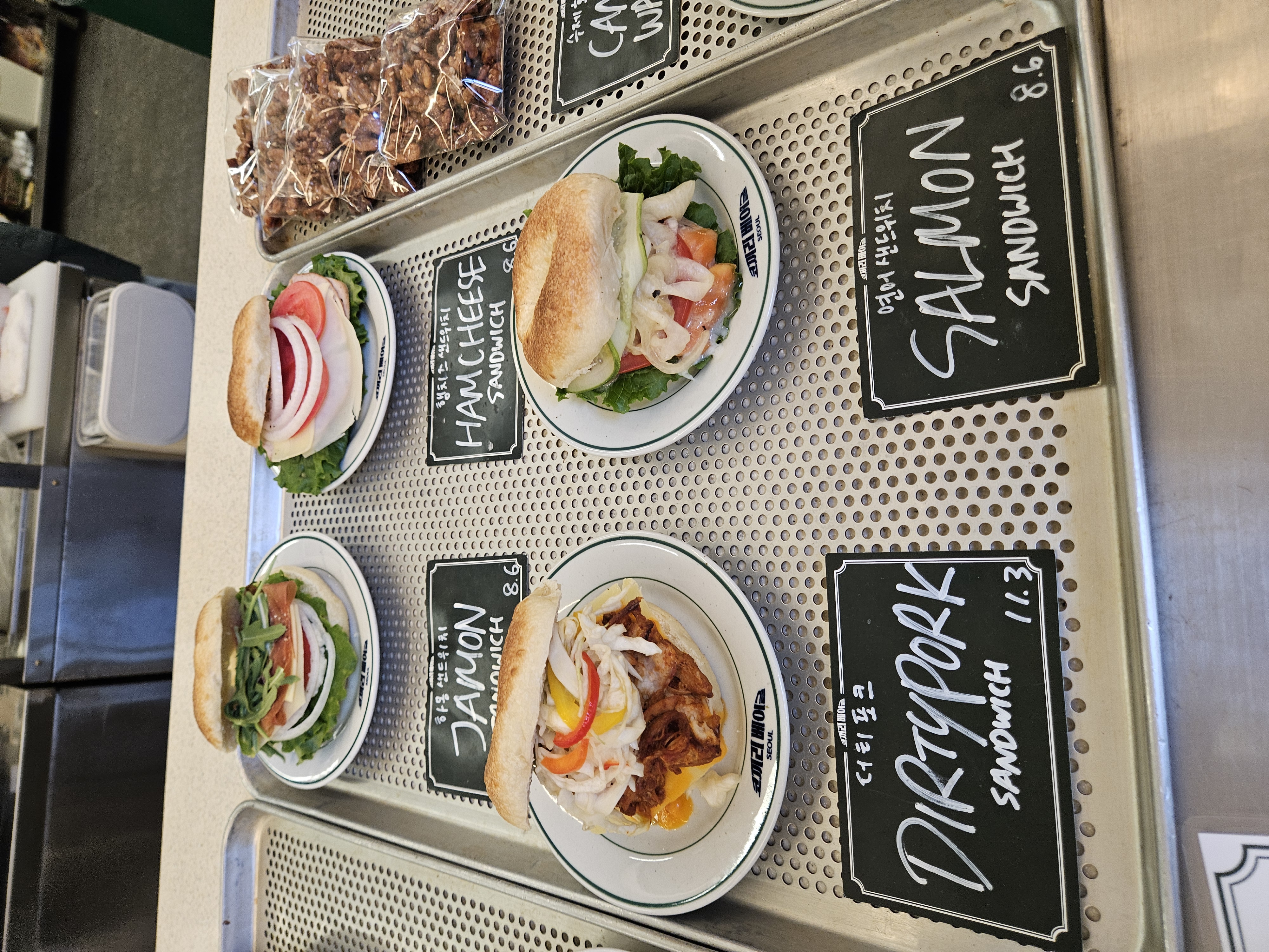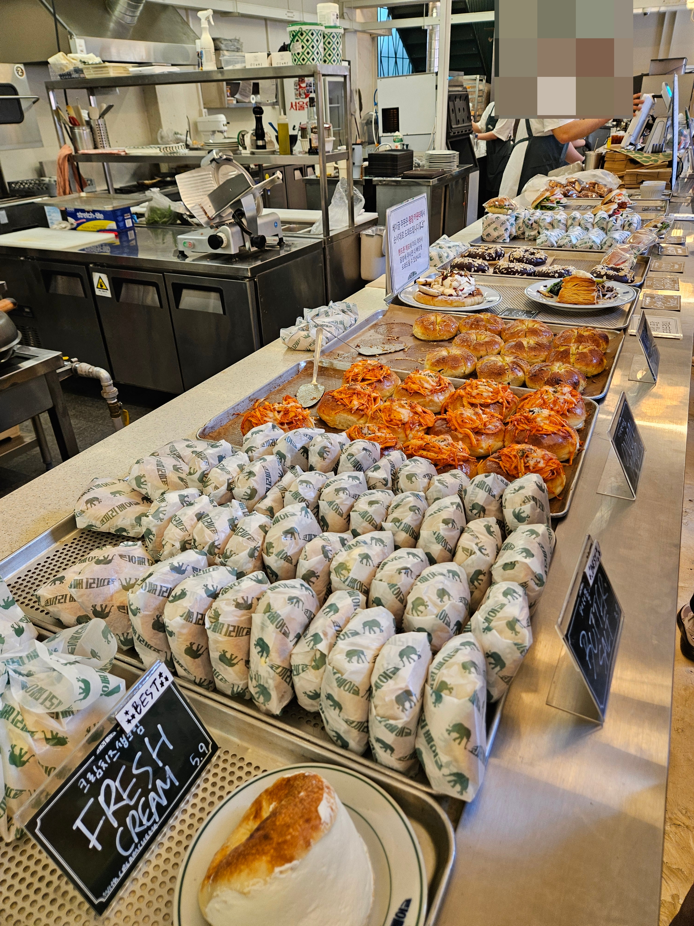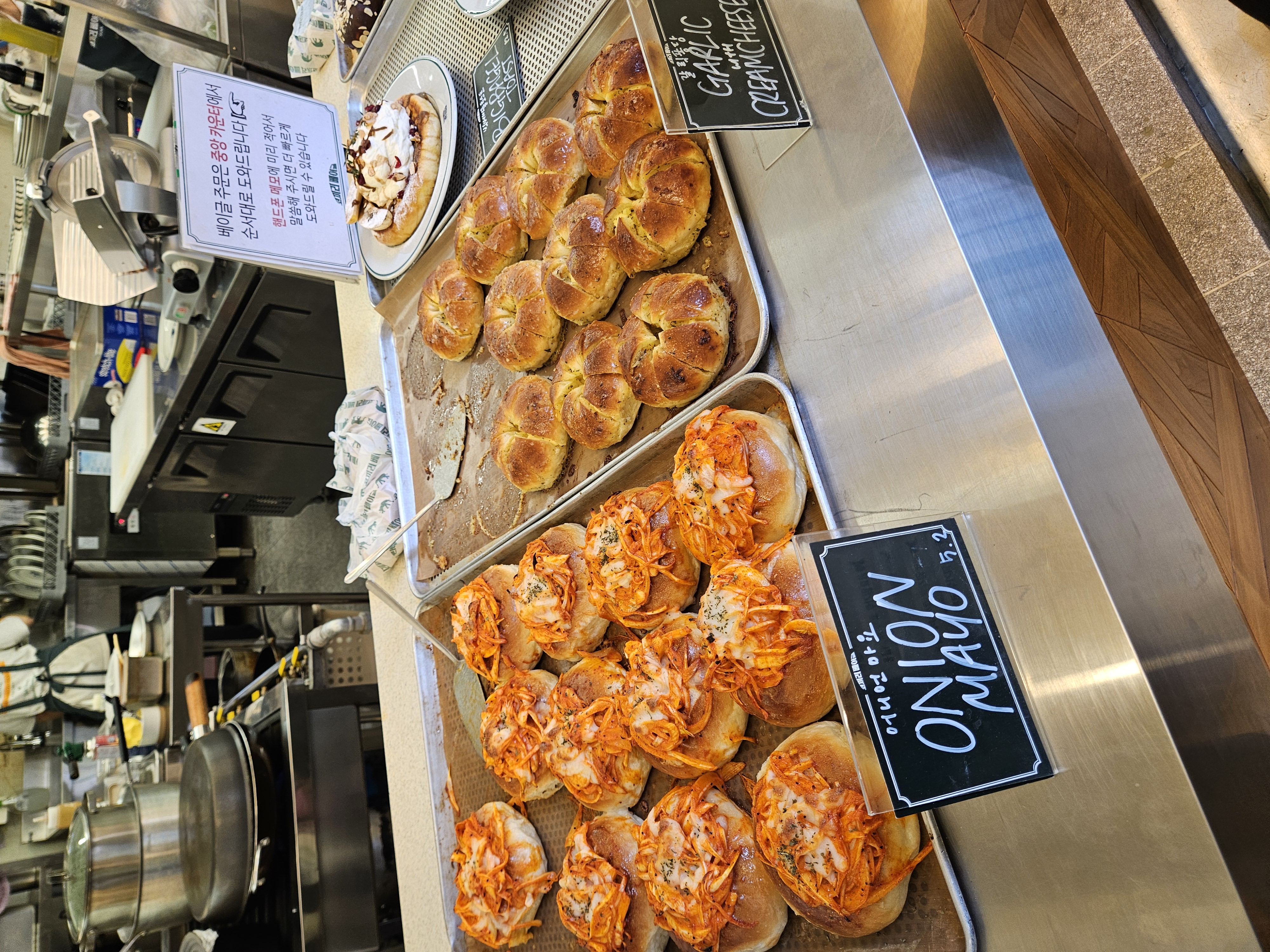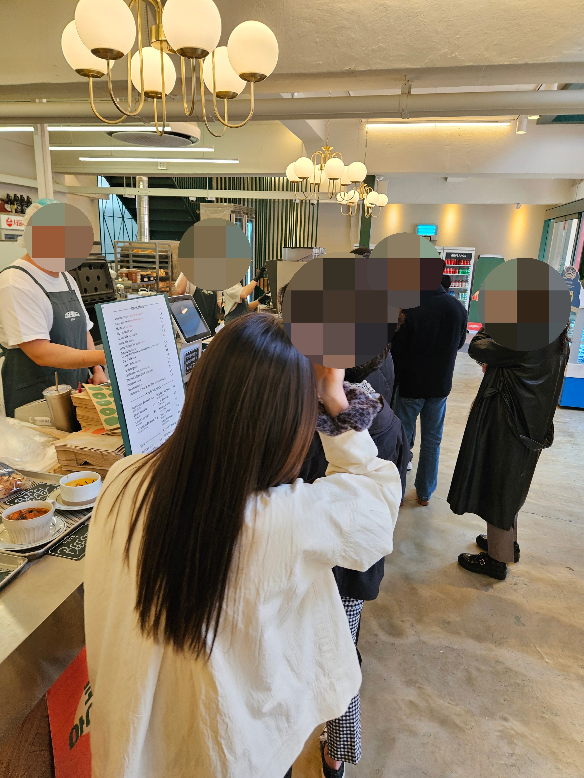 들아가서 왼편에는 스페인산 크림치즈 라고하는 퀘스크렘 전용 냉장고가 있고, 우측 계단 앞 냉장고엔 음료와 병맥주 냉장고가 있어 베이글이나 샌드위치, 브런치, 스튜 등과 같이 마실 음료 및 주류도 구입 가능.
