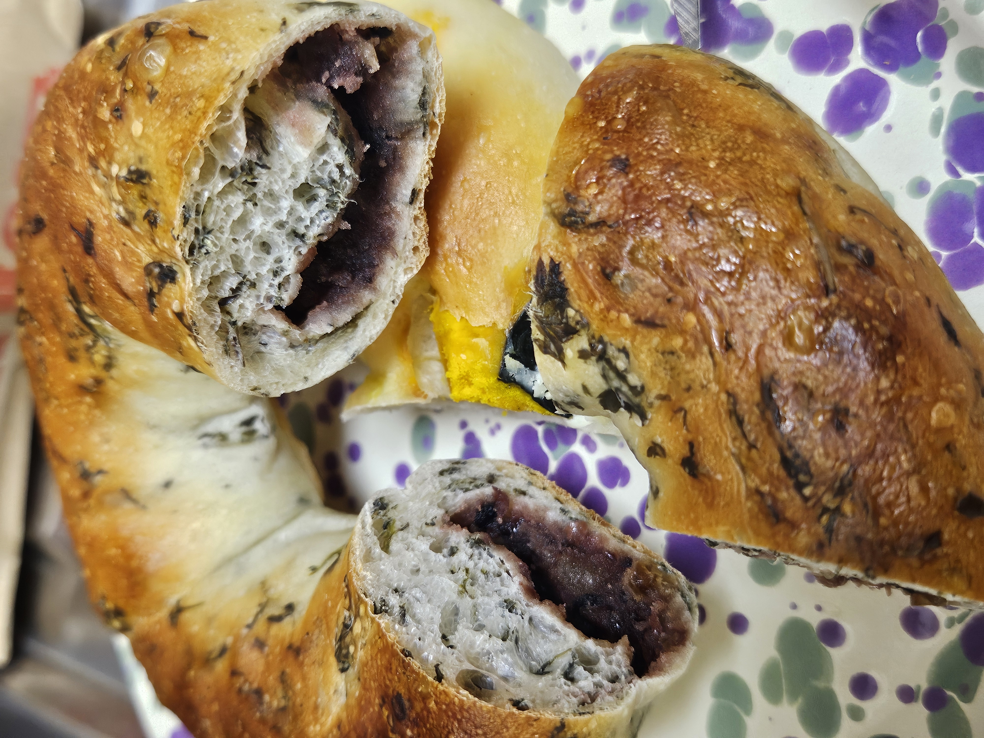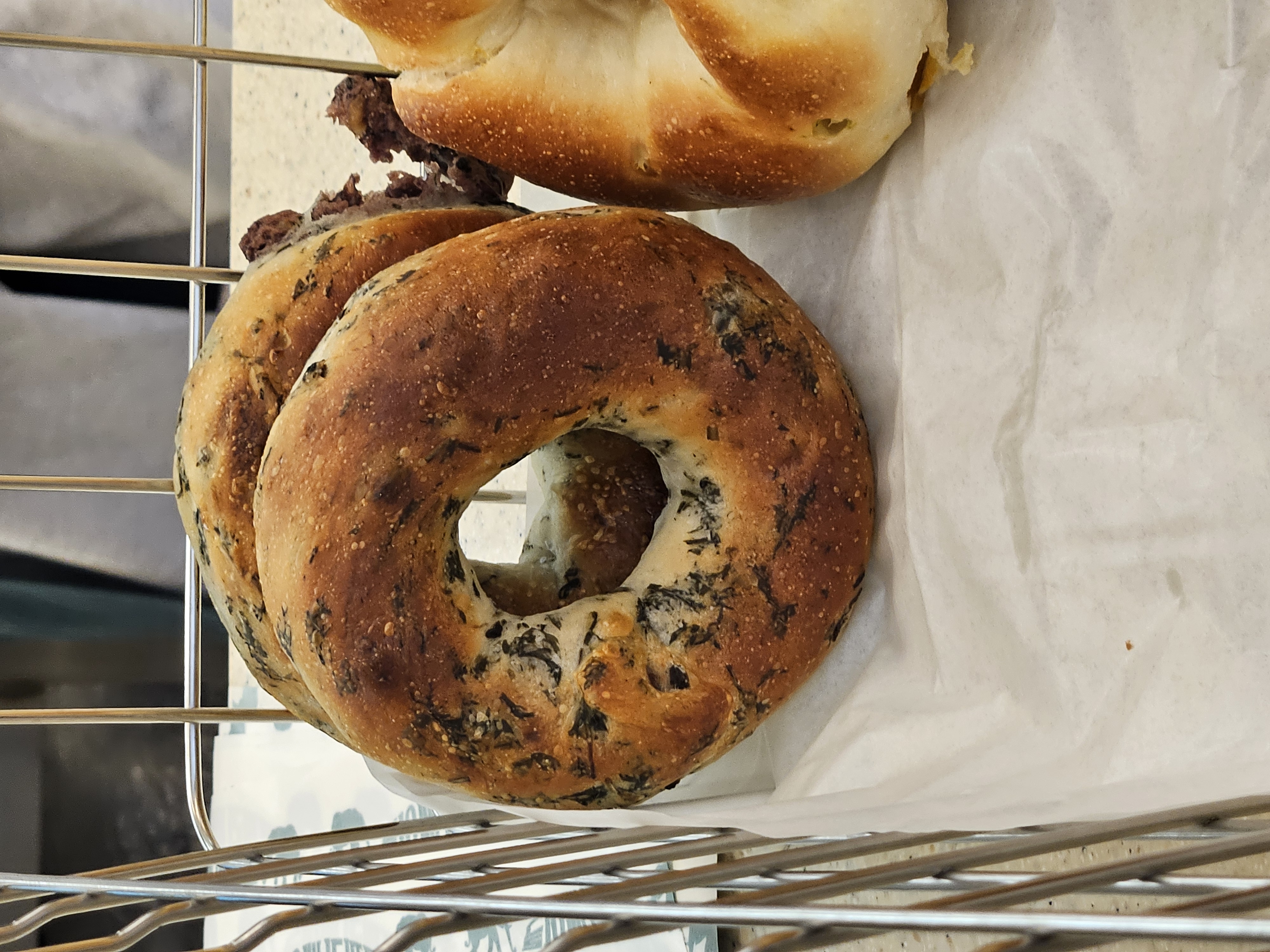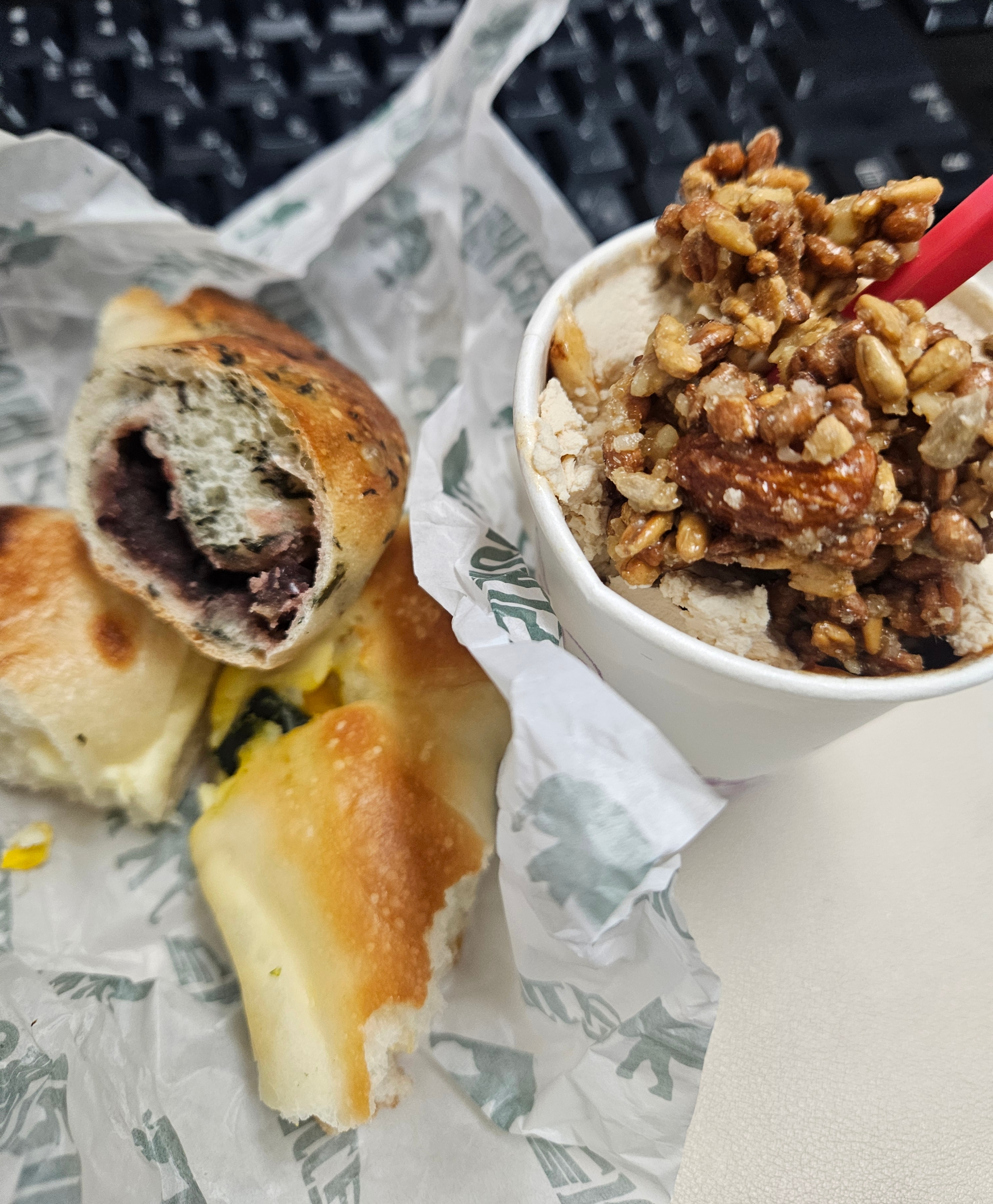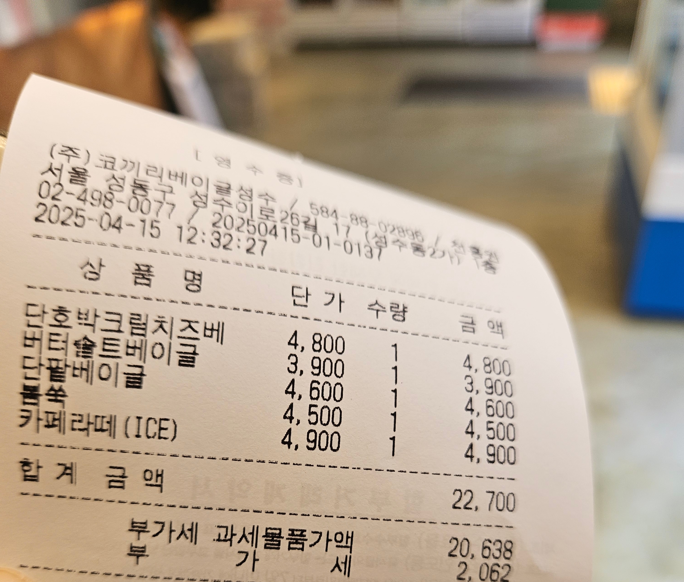 식사하고 갔지만 베이글 욕심이 있어서 4개나 골랐는데 단호박 크림치즈 베이글(4,8), 버터솔트(3,9), 단팥(4,6), 봄쑥(4,5), 아이스 카페라테(4,9) 1잔 골라서 총 22,700원.