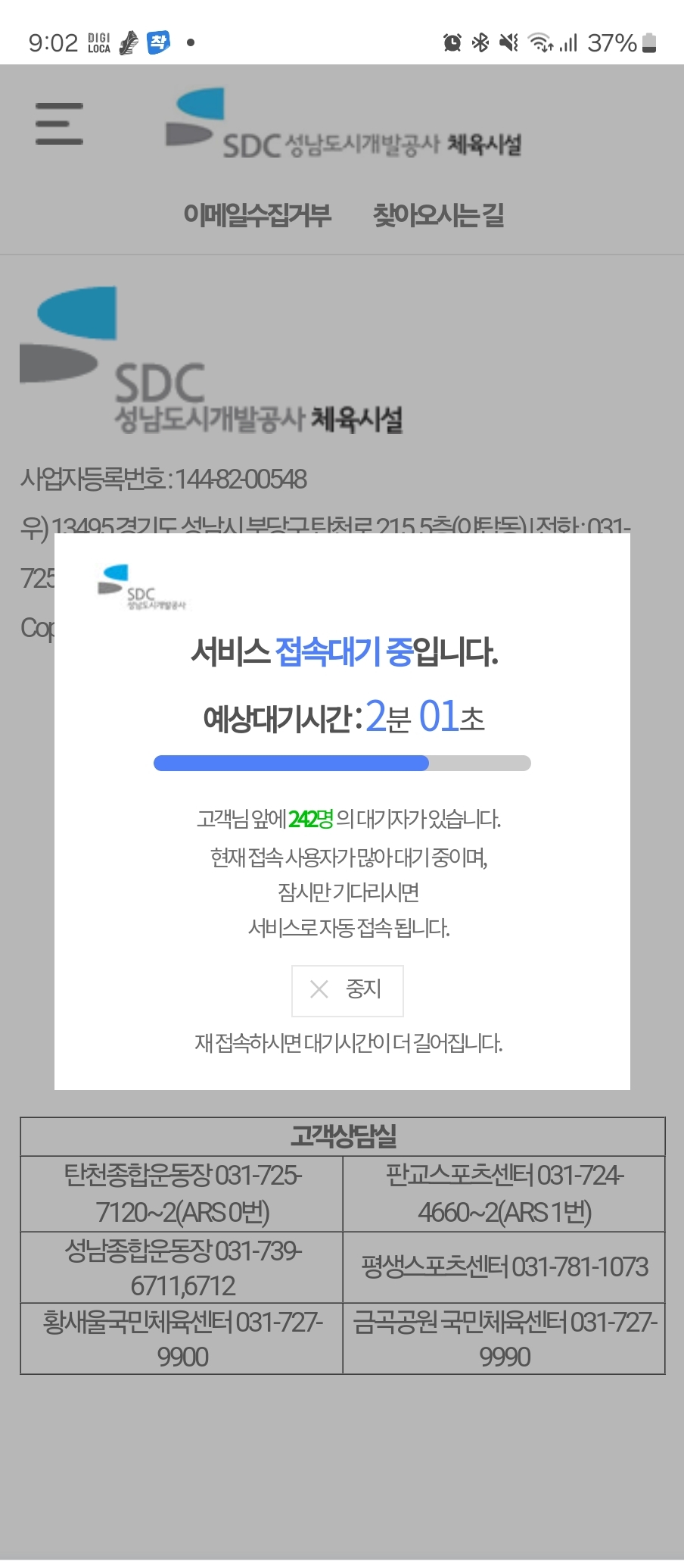 와! 지난달 24일 토요일 9시 금곡공원 국민체육센터 신규 등록 시작일인데 시간 맞춰 접속하니 서버 폭주 ...
