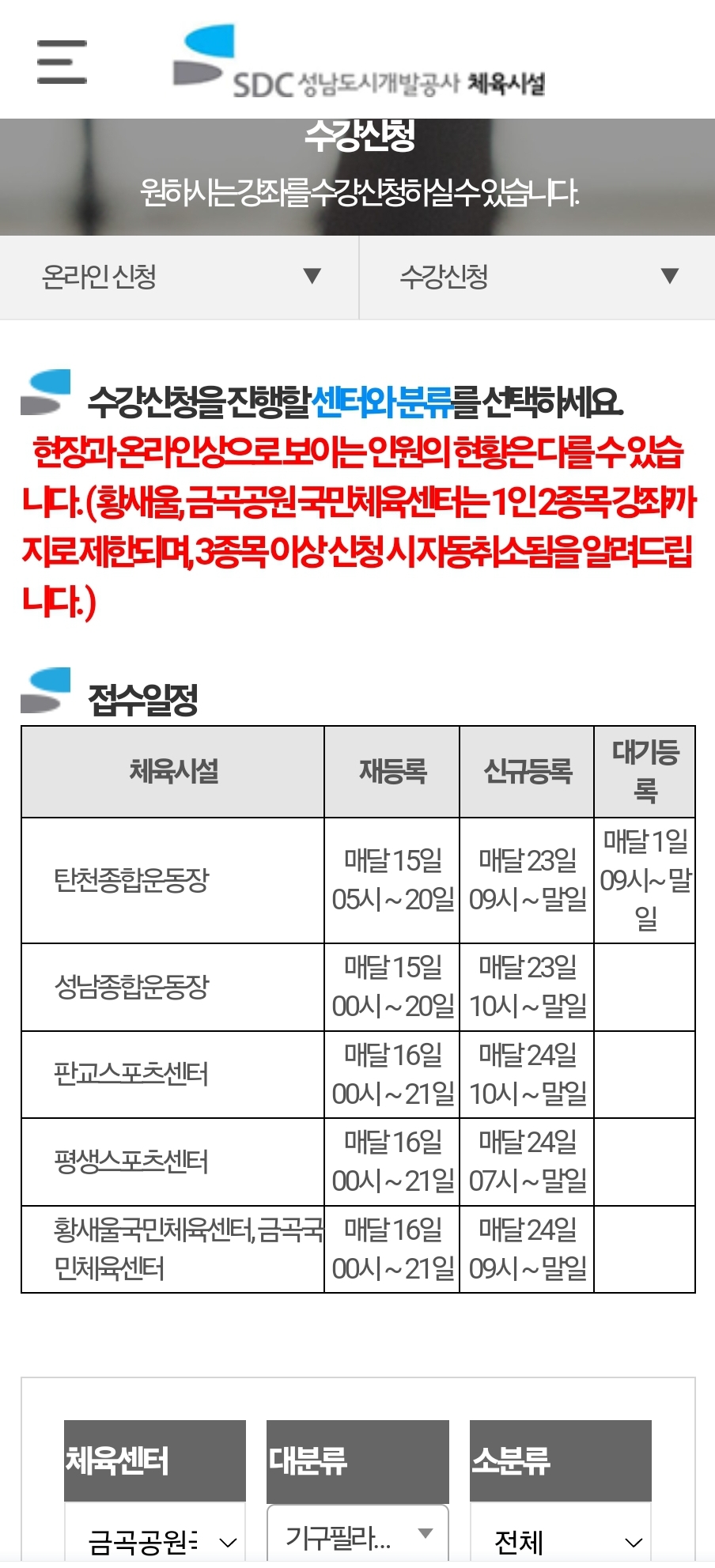 | 판교스포츠센터 | 매달 16일 00시 ~ 21일 | 매달 24일 10시 ~ 말일 | |