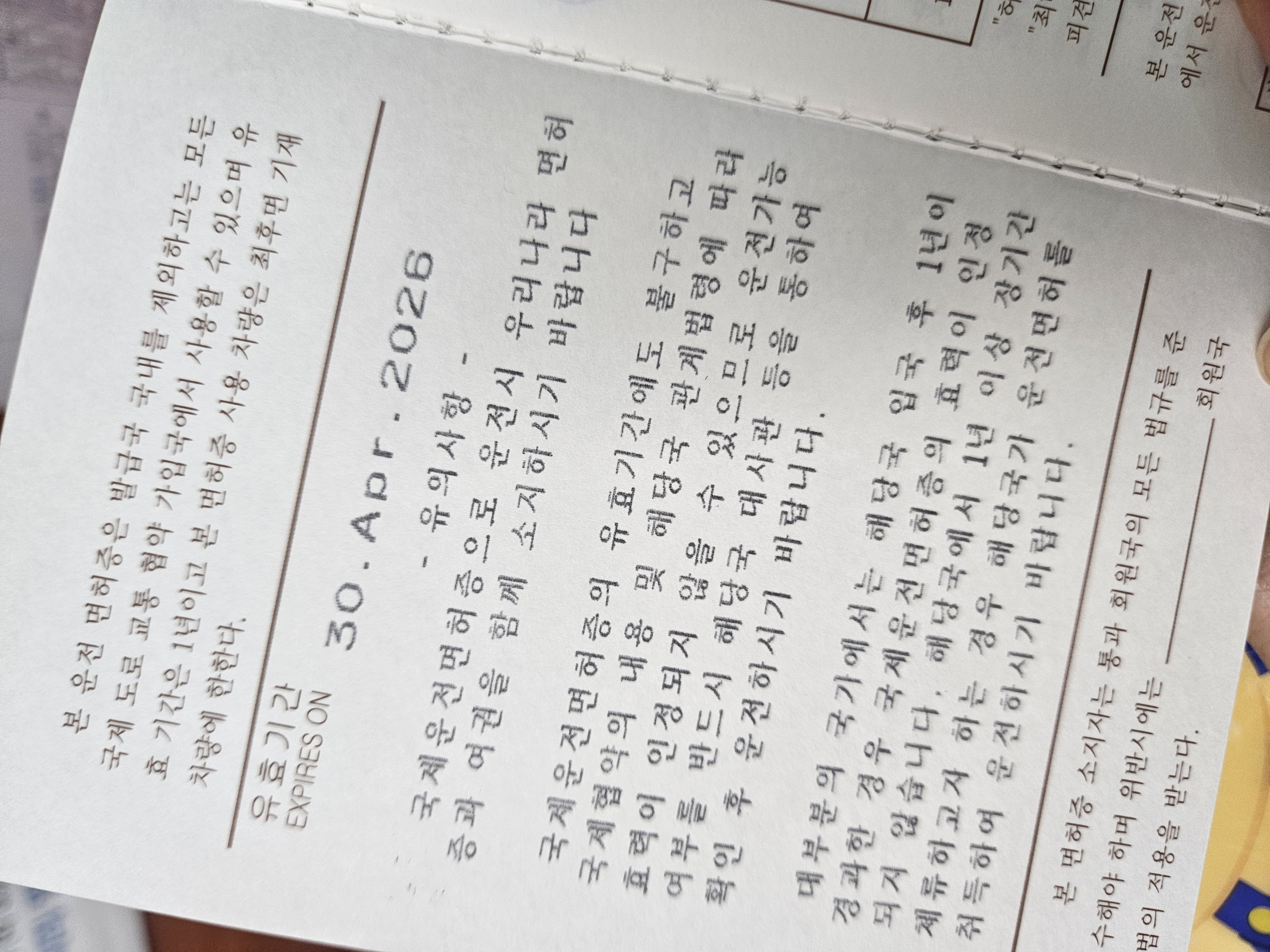 국제면허증은 종이로 된 통장형식인데 유효기간은 발급일로부터 1년까지. 난 오늘 발급(25.04.30) 발급받아 내년 이날까지 유효하다.