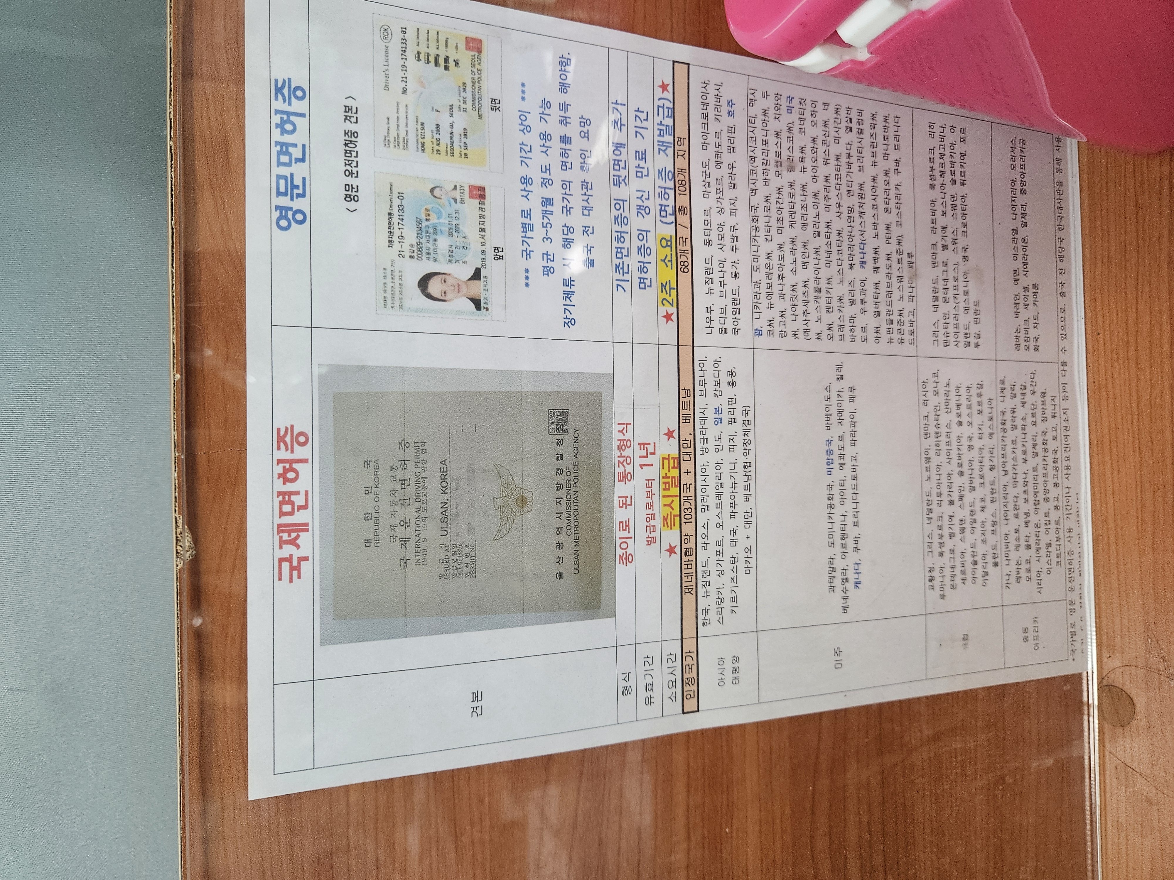 여권과 면허증, 여권사진 1장과 작성한 국제운전면허 신청서 경찰에게 주면 바로 만들어준다.