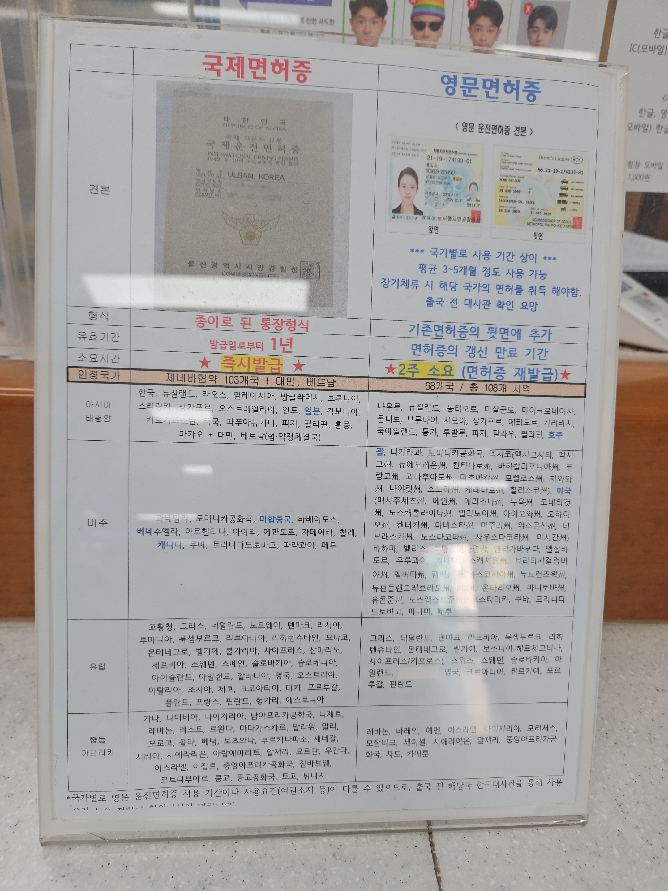 국제면허증과 영문면허증을 동시에 인정하는 국가가 있고 국제면허증만 인정하는 국가가 있으니 경찰서 종합민원실에 있는 내용 참고 후 출국 전 해당국 한국대사관에서 재확인해보는 걸 권장한다.
