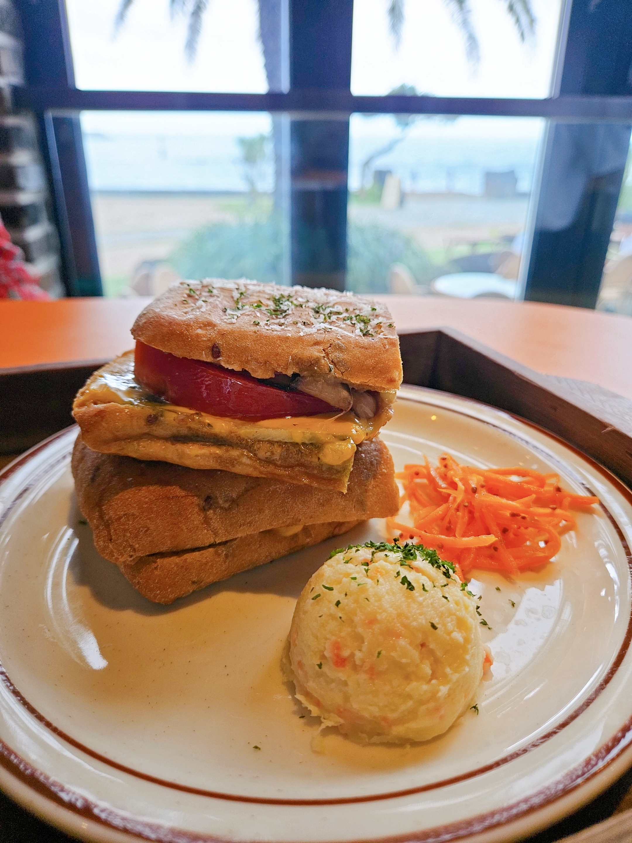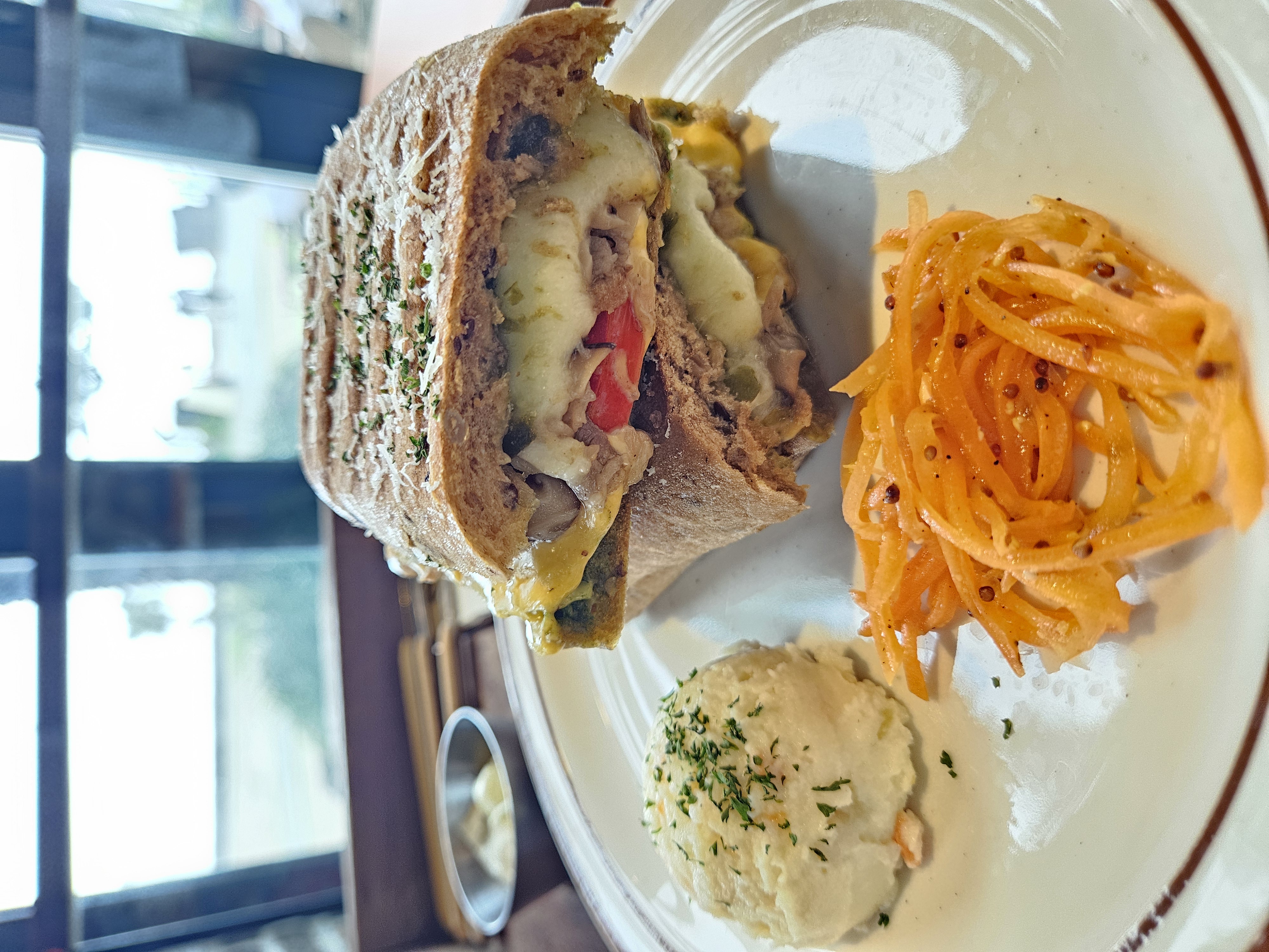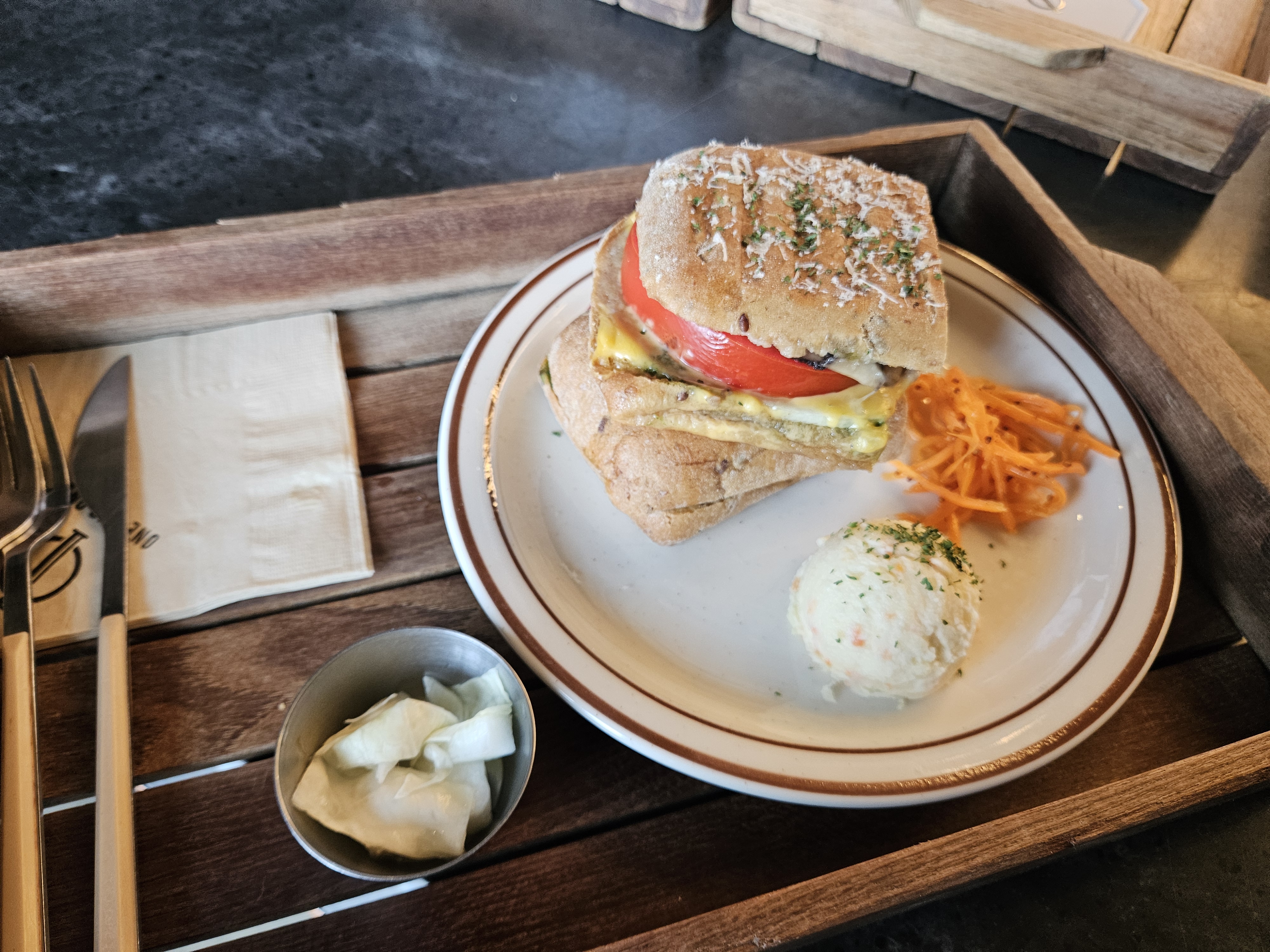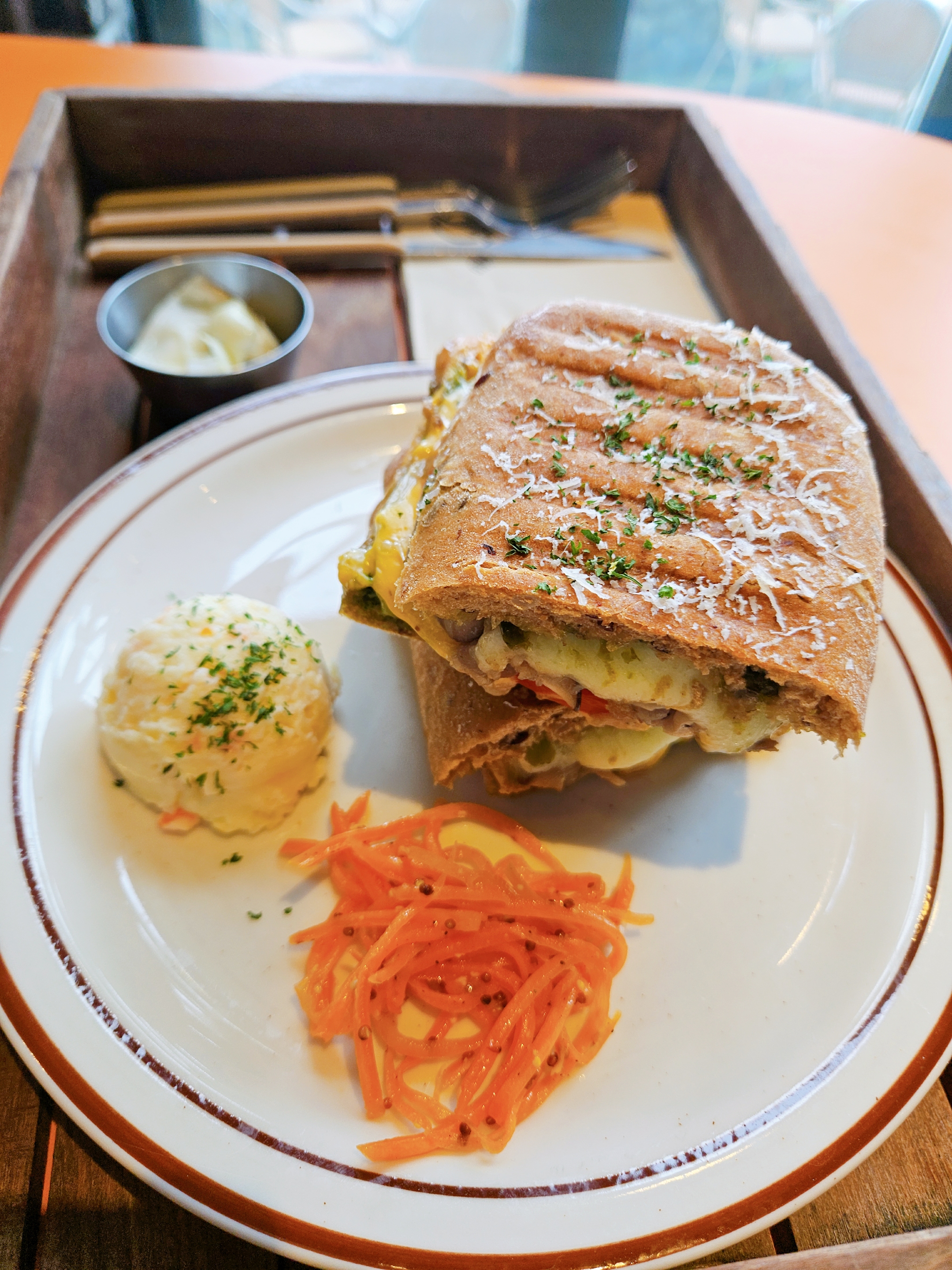 요거트, 커피 맛 모두 괜찮았고 고기, 치즈, 채소 듬뿍 넣어 구운 비프 파니니는 감자 샐러드 1 스쿱과 당근라페가 가니시로 나와 한 끼 식사로도 충분했다.
