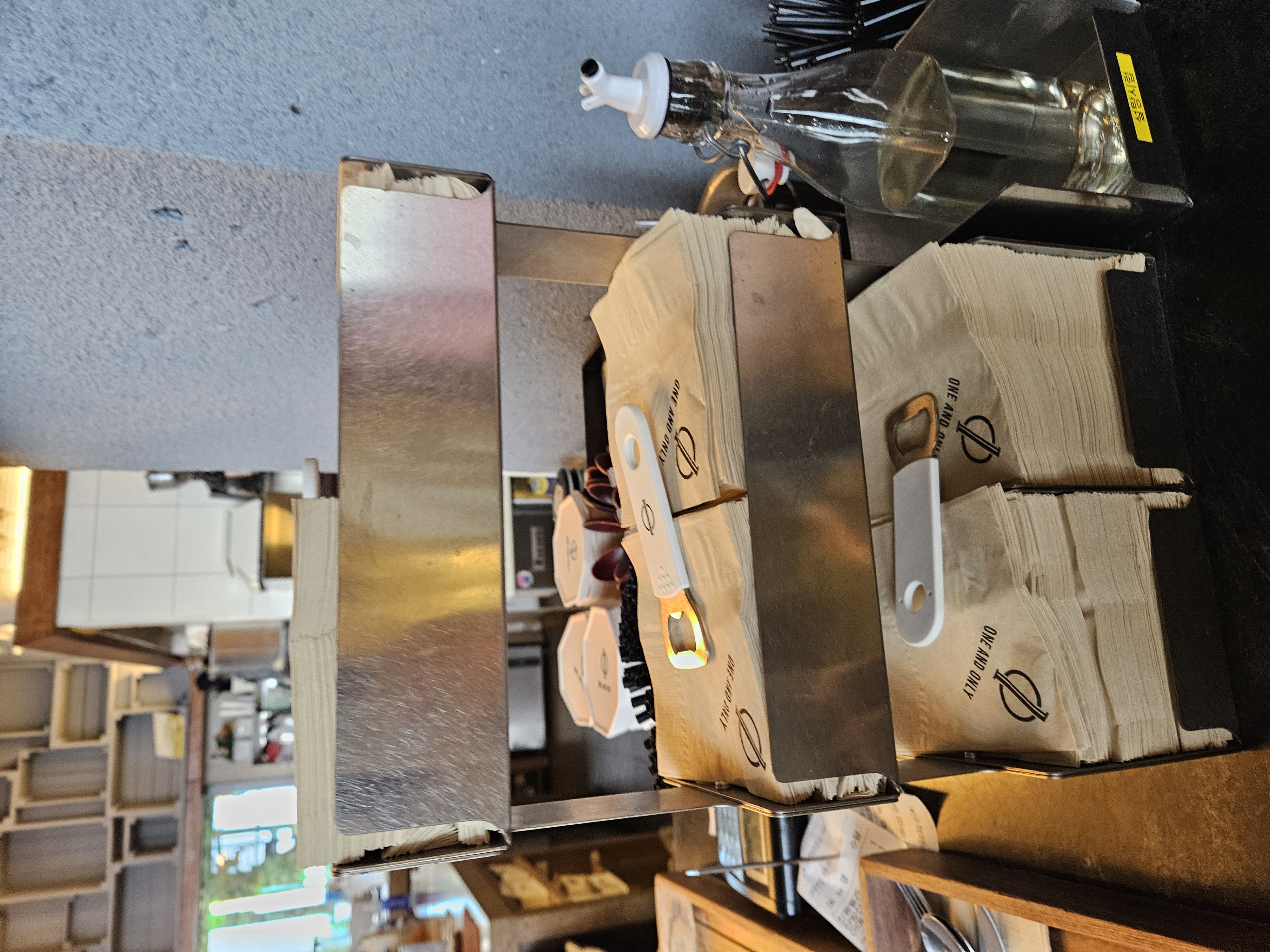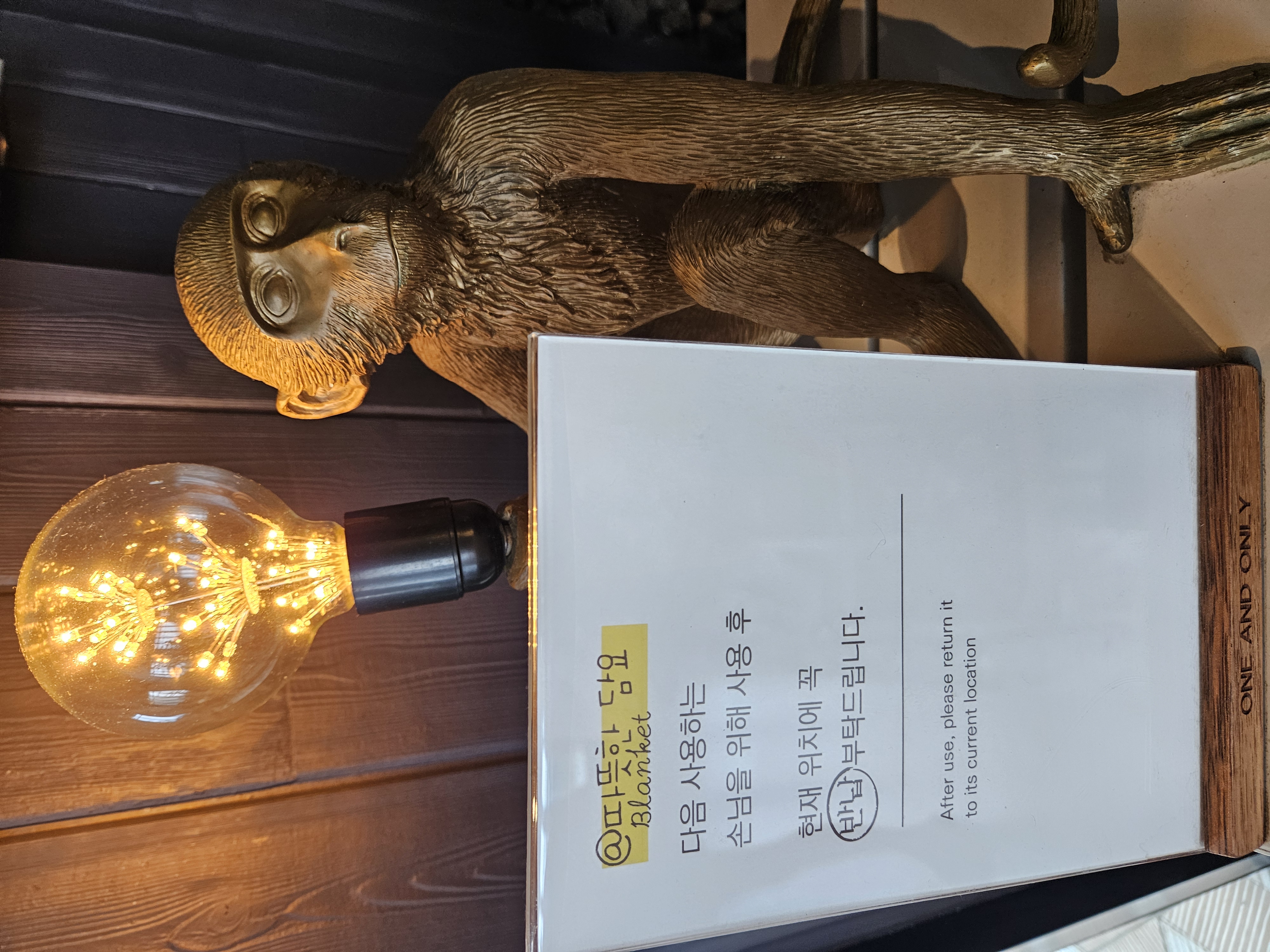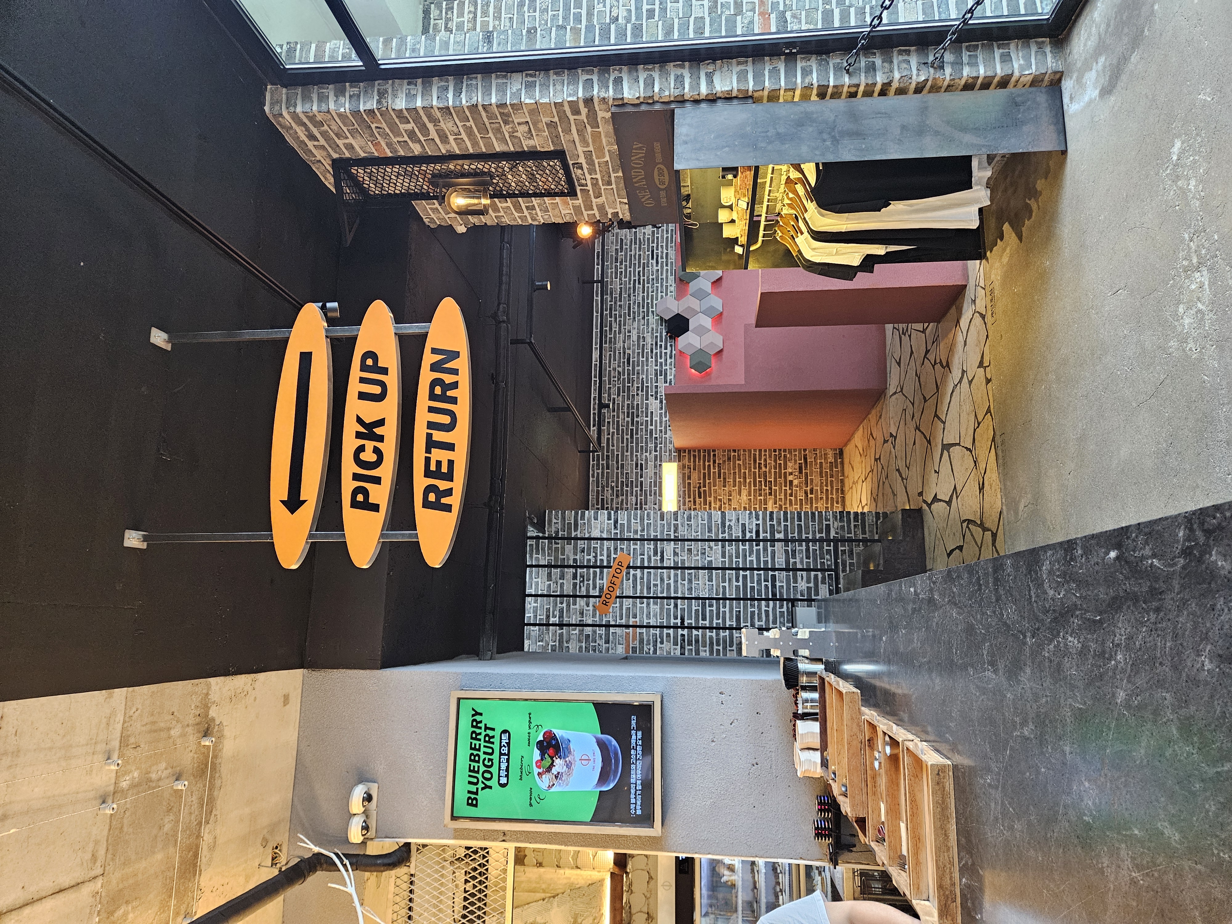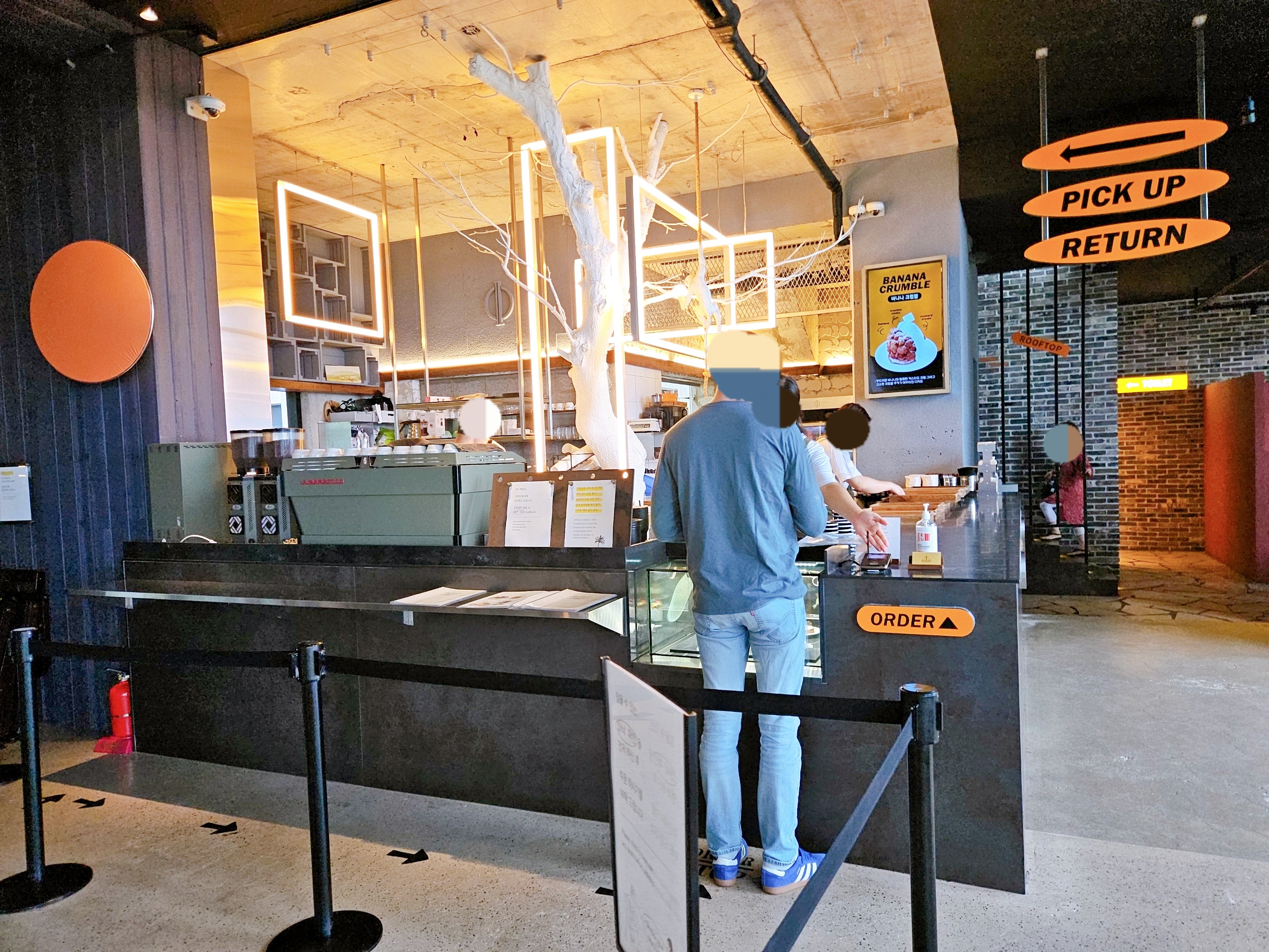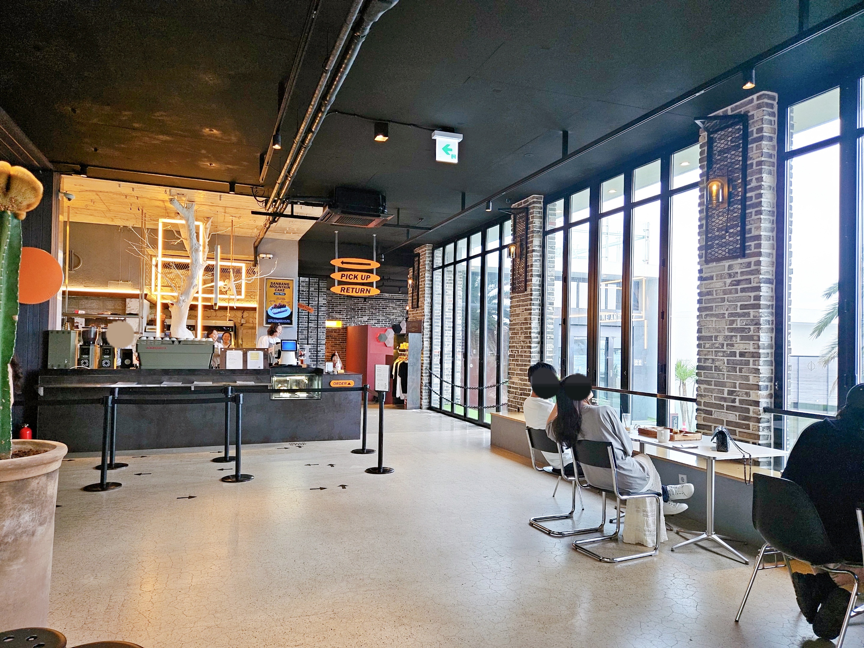 픽업과 반납은 셀프, 셀프바가 있어 냅킨, 병따개, 시럽 등 이용 가능하다. 또 테라스 석이 많아 담요도 구비되어 있어 자유롭게 이용할 수 있음.