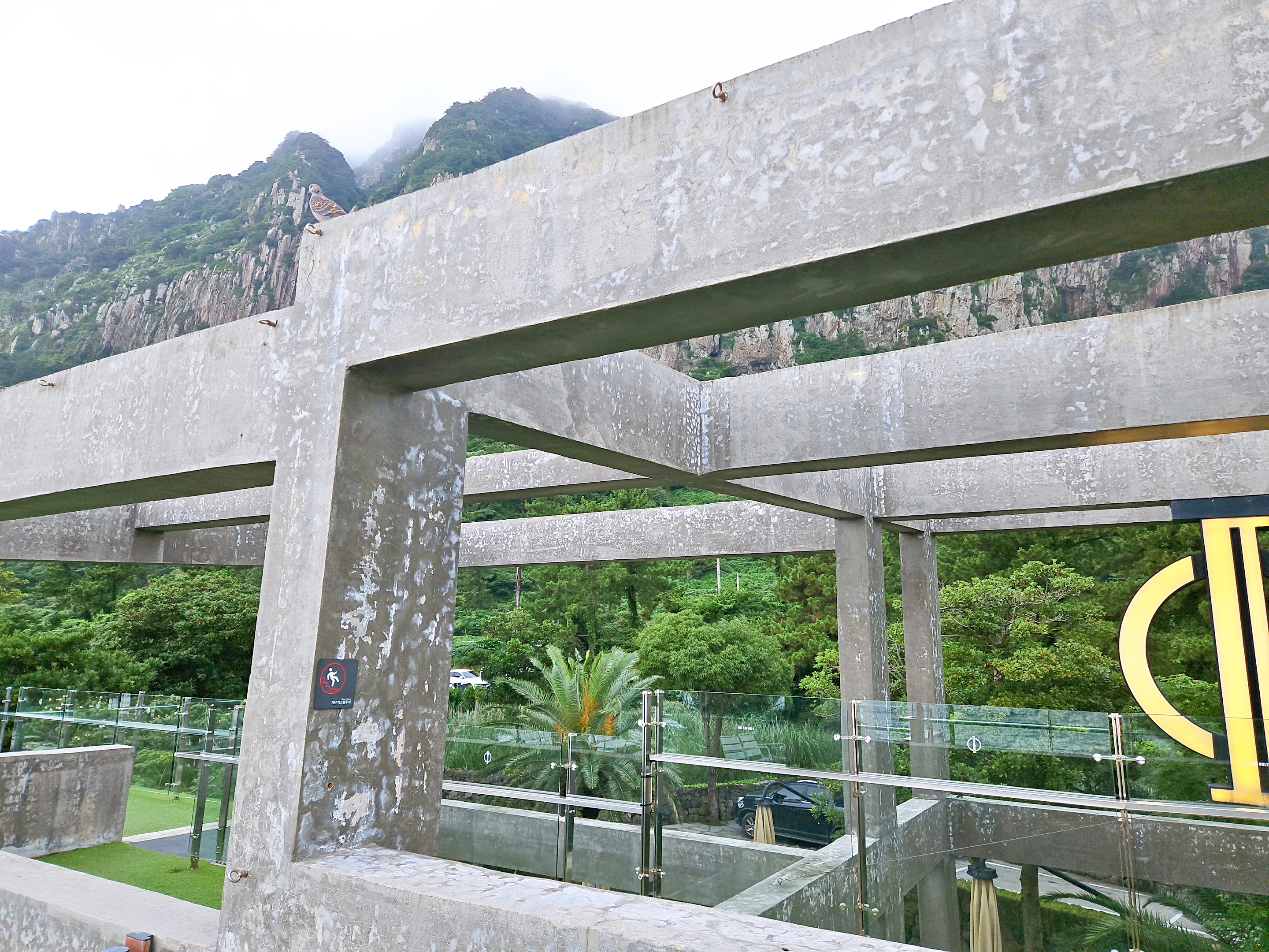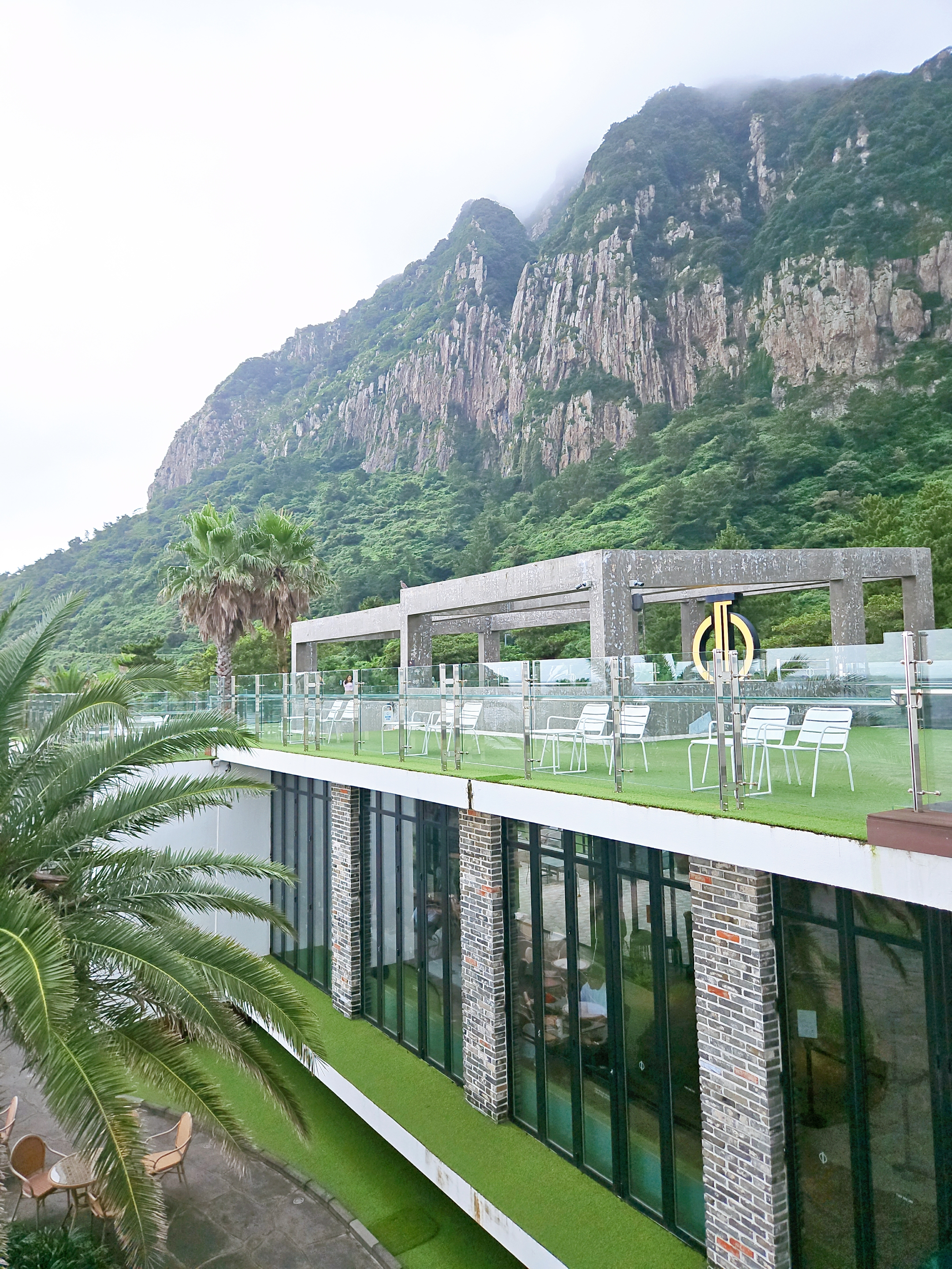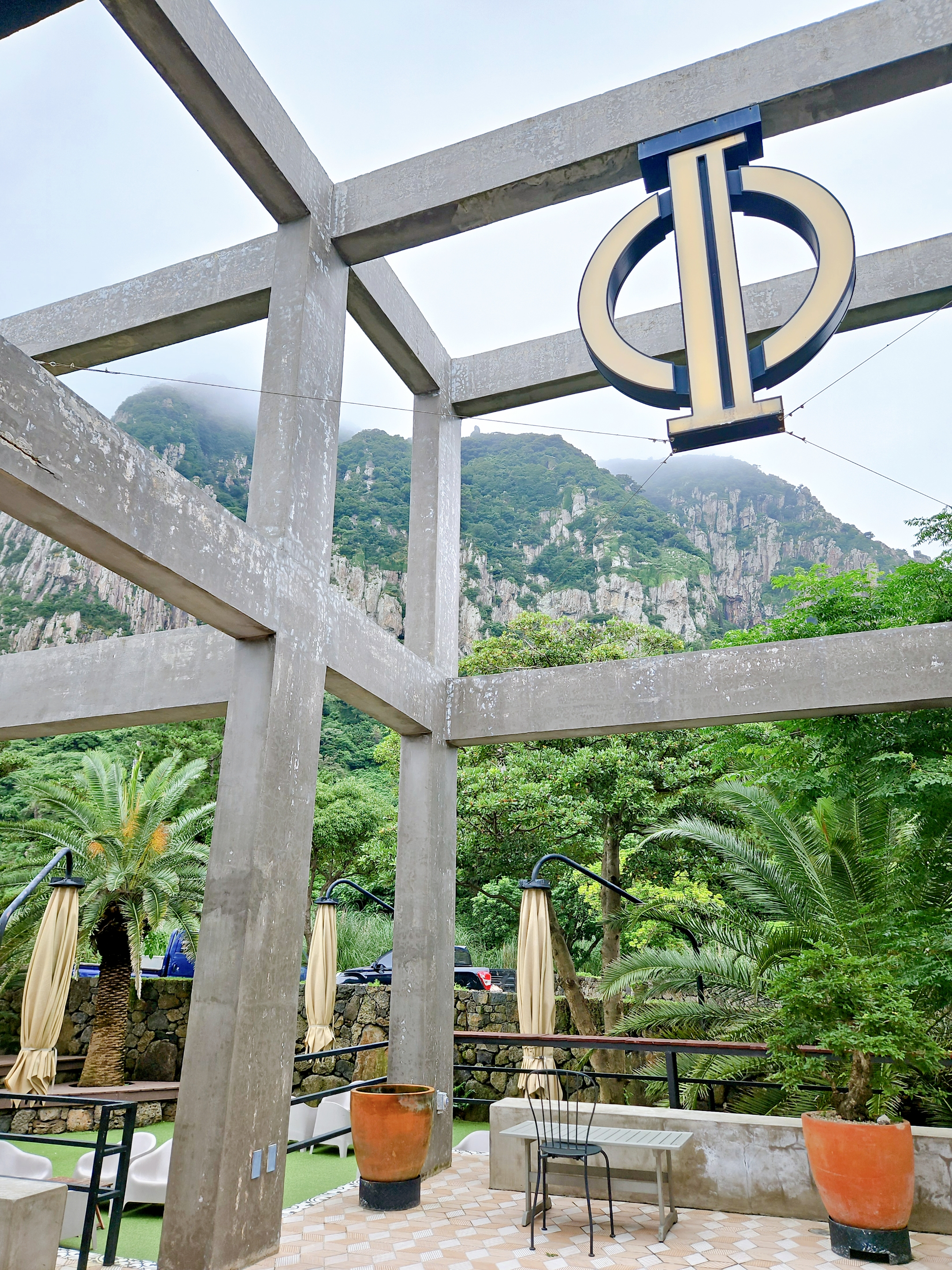 1층 노출 콘크리트 공간, 2층 루프탑에서 보는 산방산 뷰는 웅장하기까지 함.