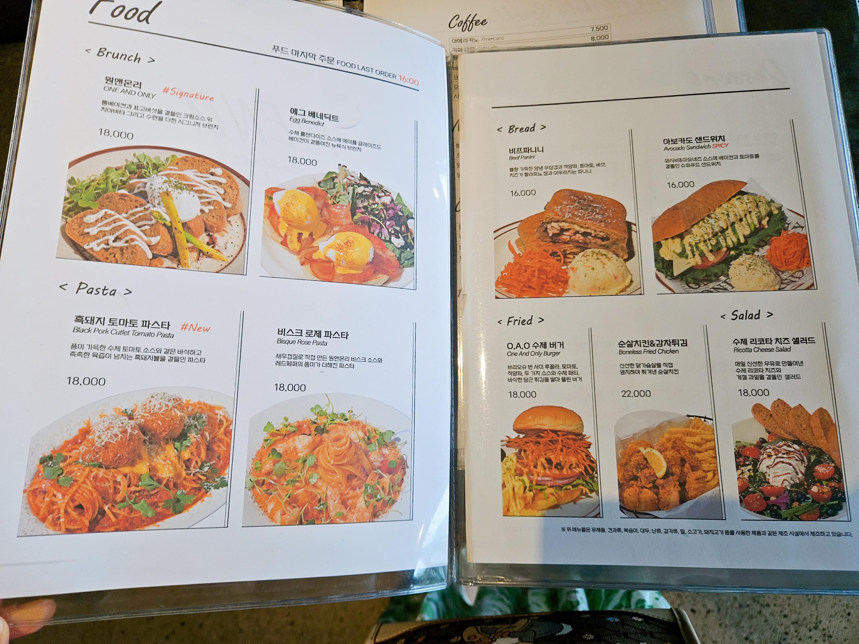 브런치 메뉴 치아바타 & 수란, 에그 베네딕트, 파스타, 샌드위치, 수제버거, 튀김, 샐러드, 커피, 음료, 주류 등 다양하게 준비되어 있는 편.