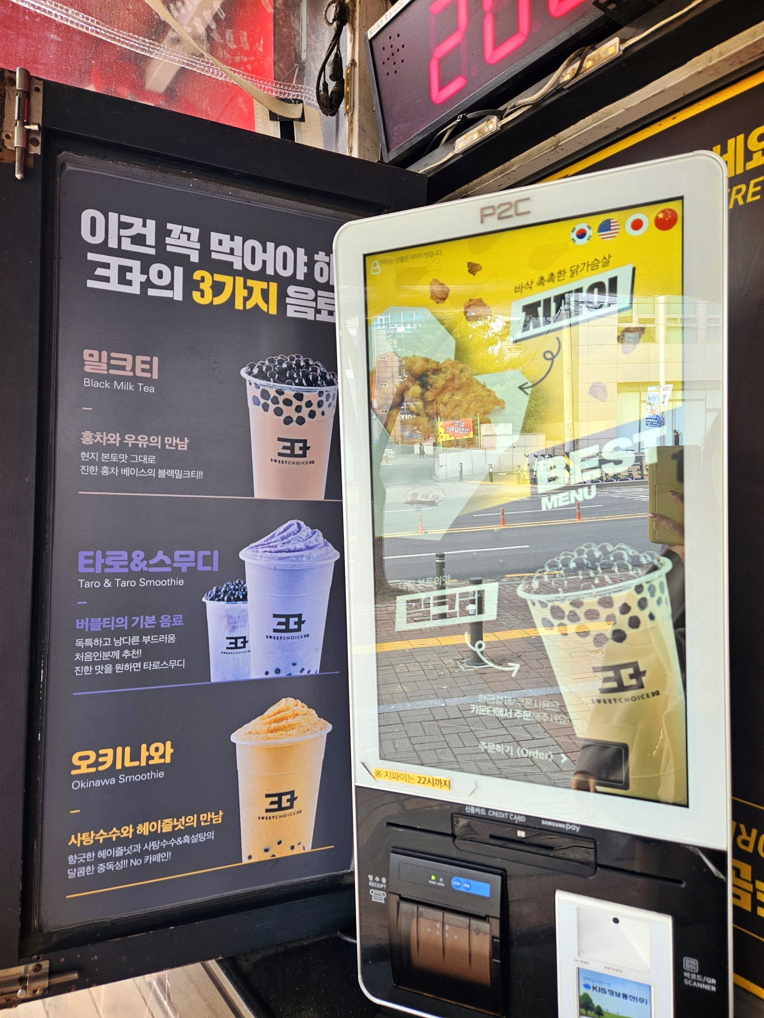 오레오, 초코 스무디도 있고 과일 요거트, 코코넛 등 스무디와 티, 커피 그리고 대만식 닭튀김인 지파이와 매콤 달달한 라면땅도 판매하고 있음.