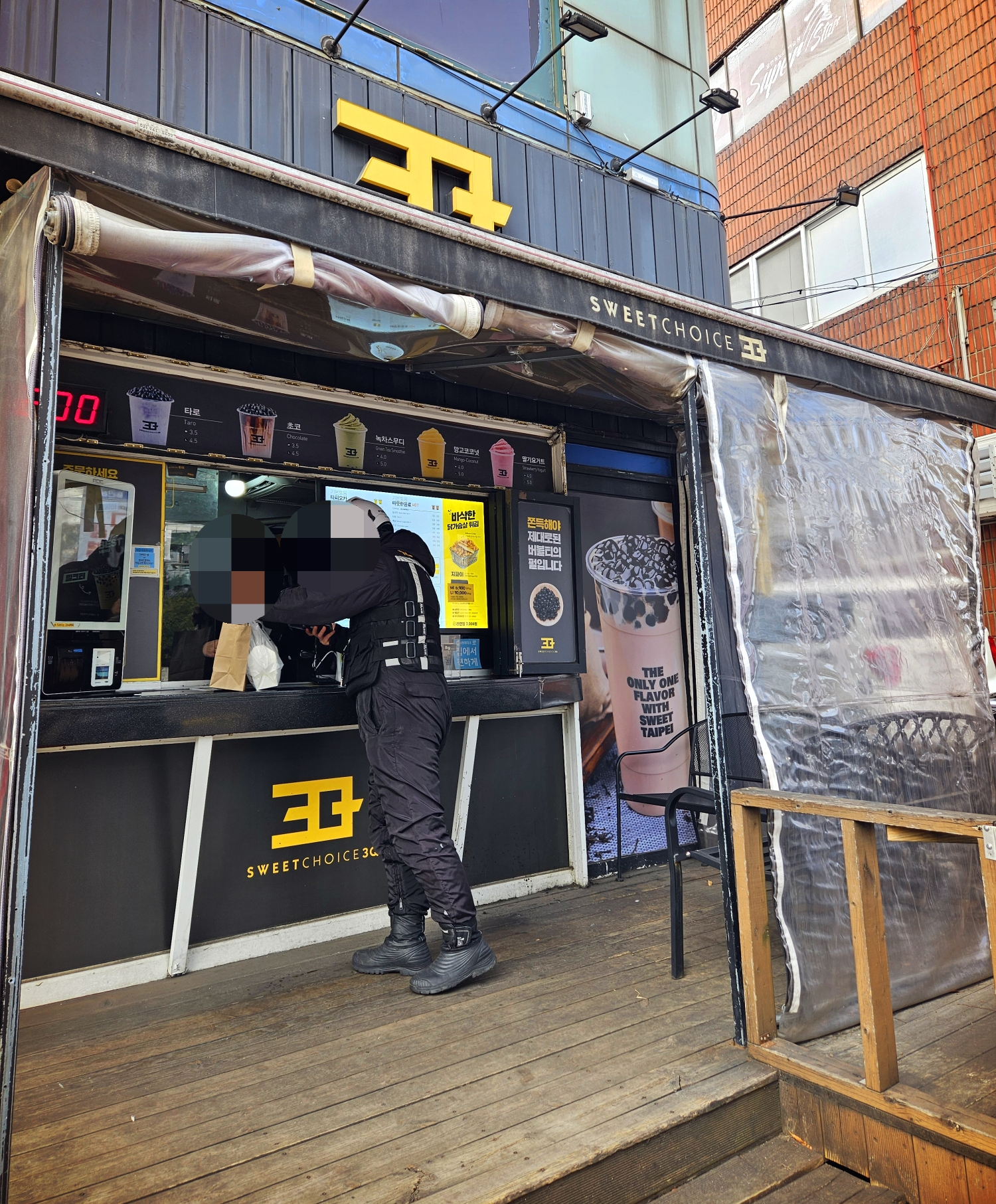 테이크 아웃 전용 매장이라 가게는 협소하지만 매장 앞 대기 공간은 좁지 않은 편이다. 오른쪽에 대기의자도 마련해 놨음.