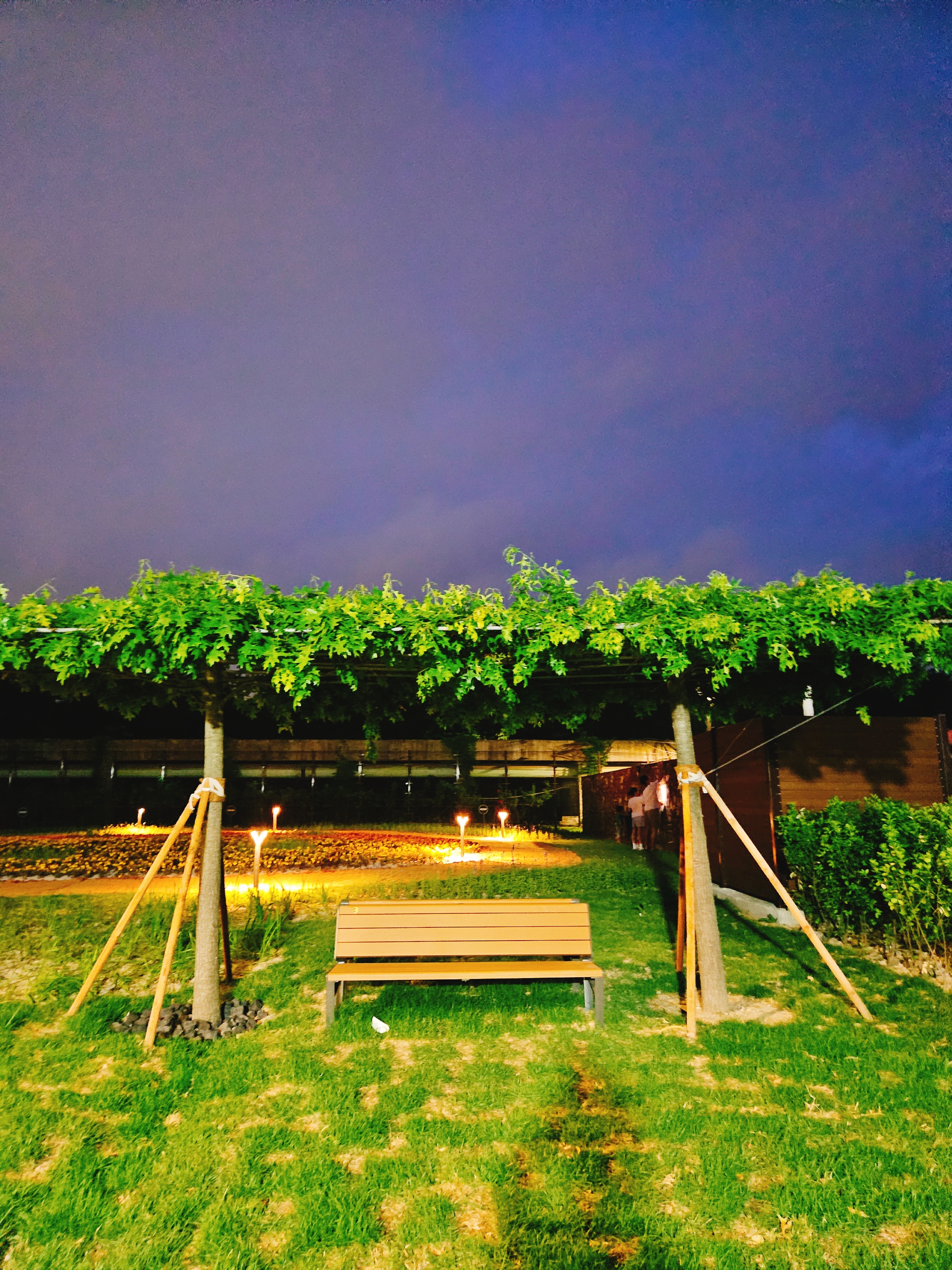 그네 의자와 대형 파라솔과 평상, 벤치가 곳곳에 마련되어 있어 캠핑 체어 없이도 도시락만 들고 와도 가볍게 피크닉 분위기 낼 수 있는 아기자기한 공간.