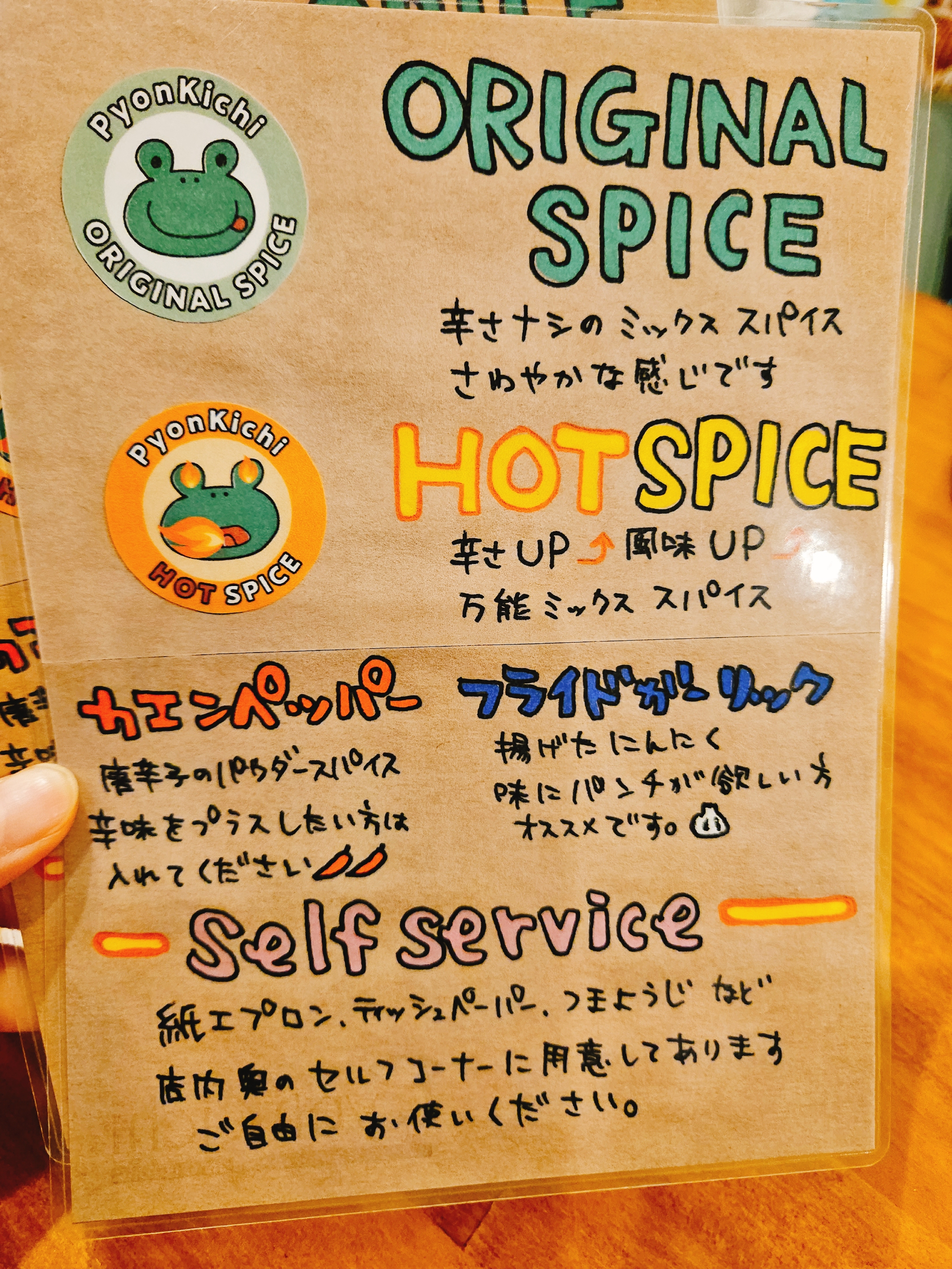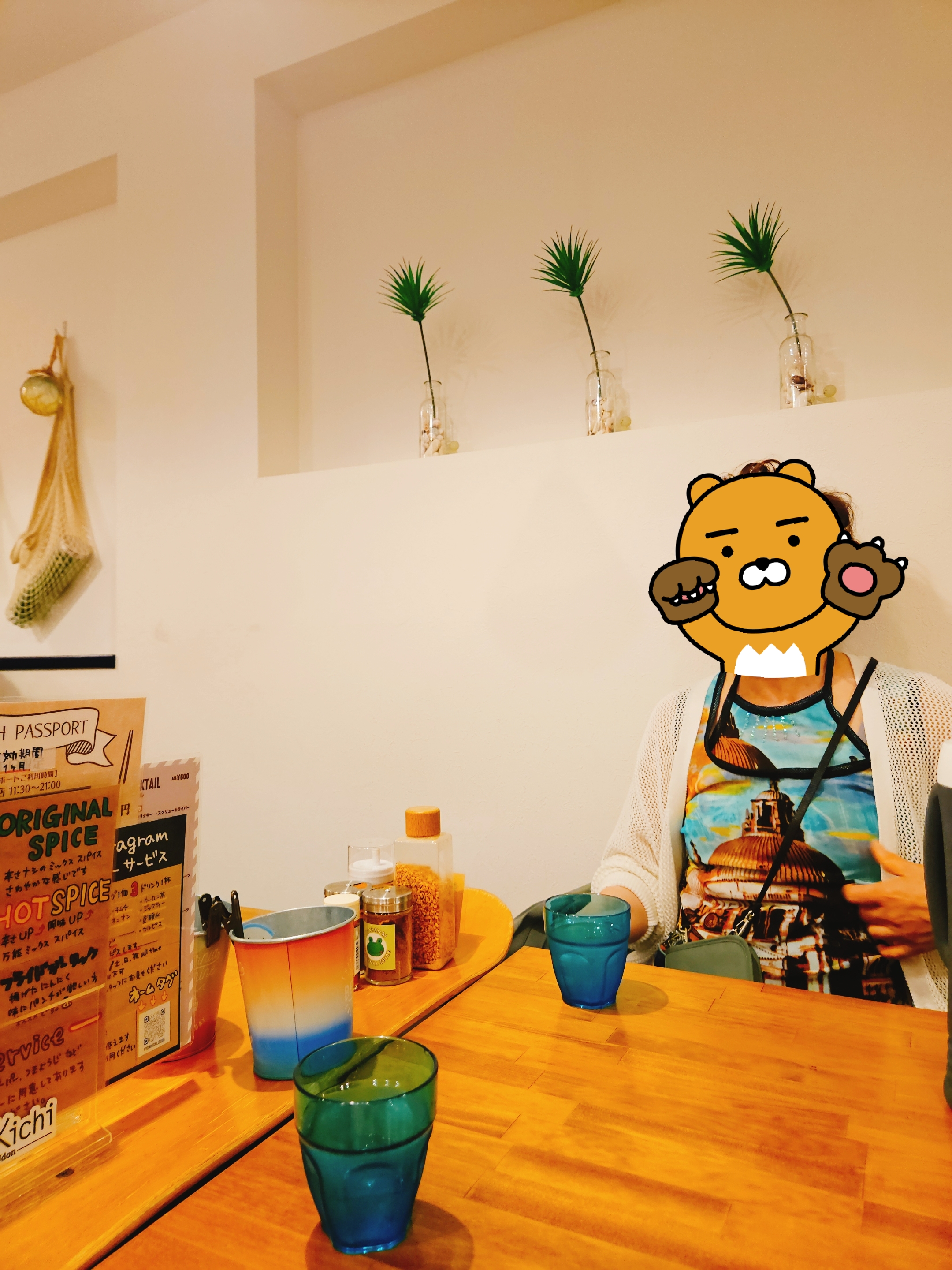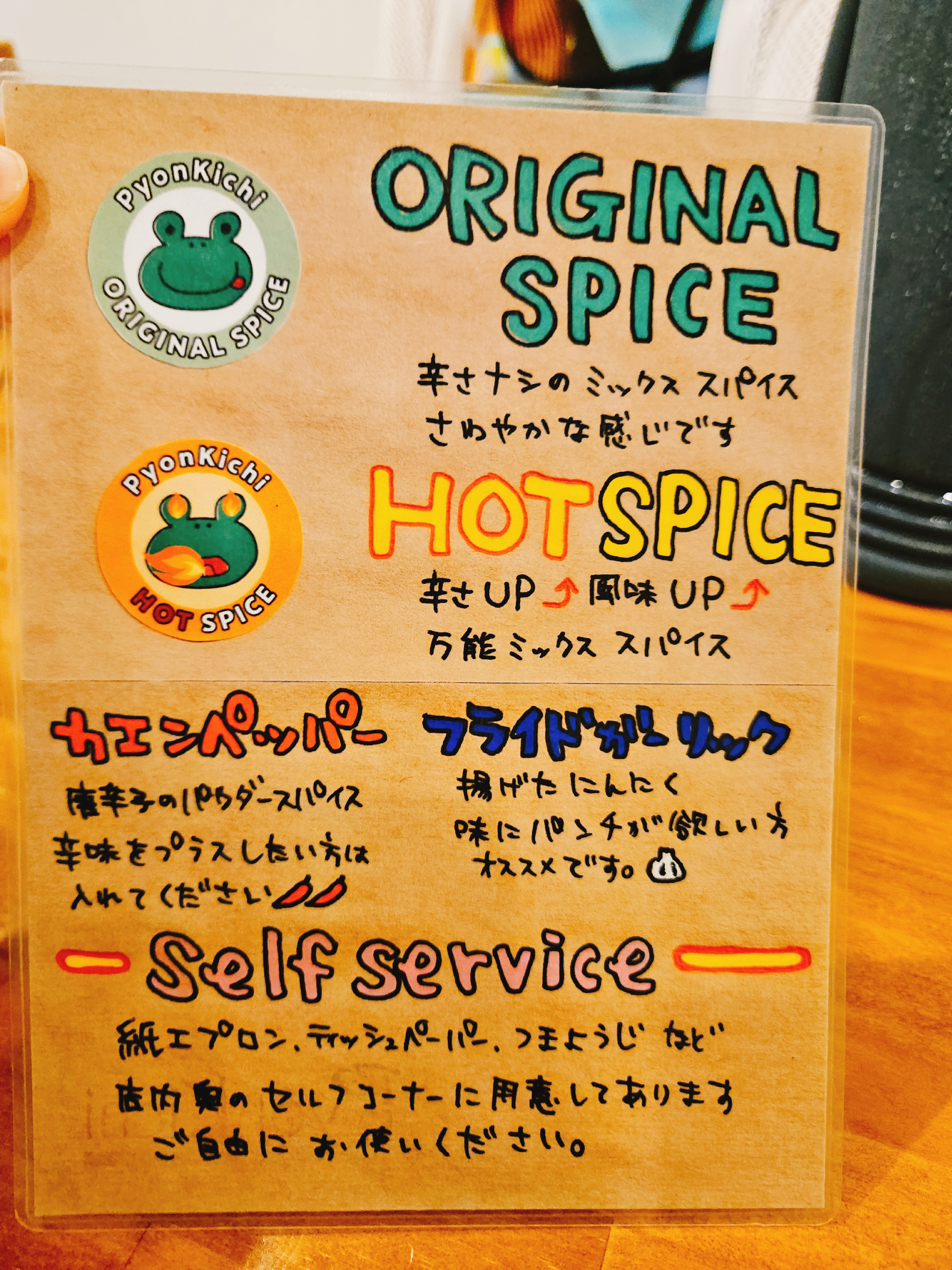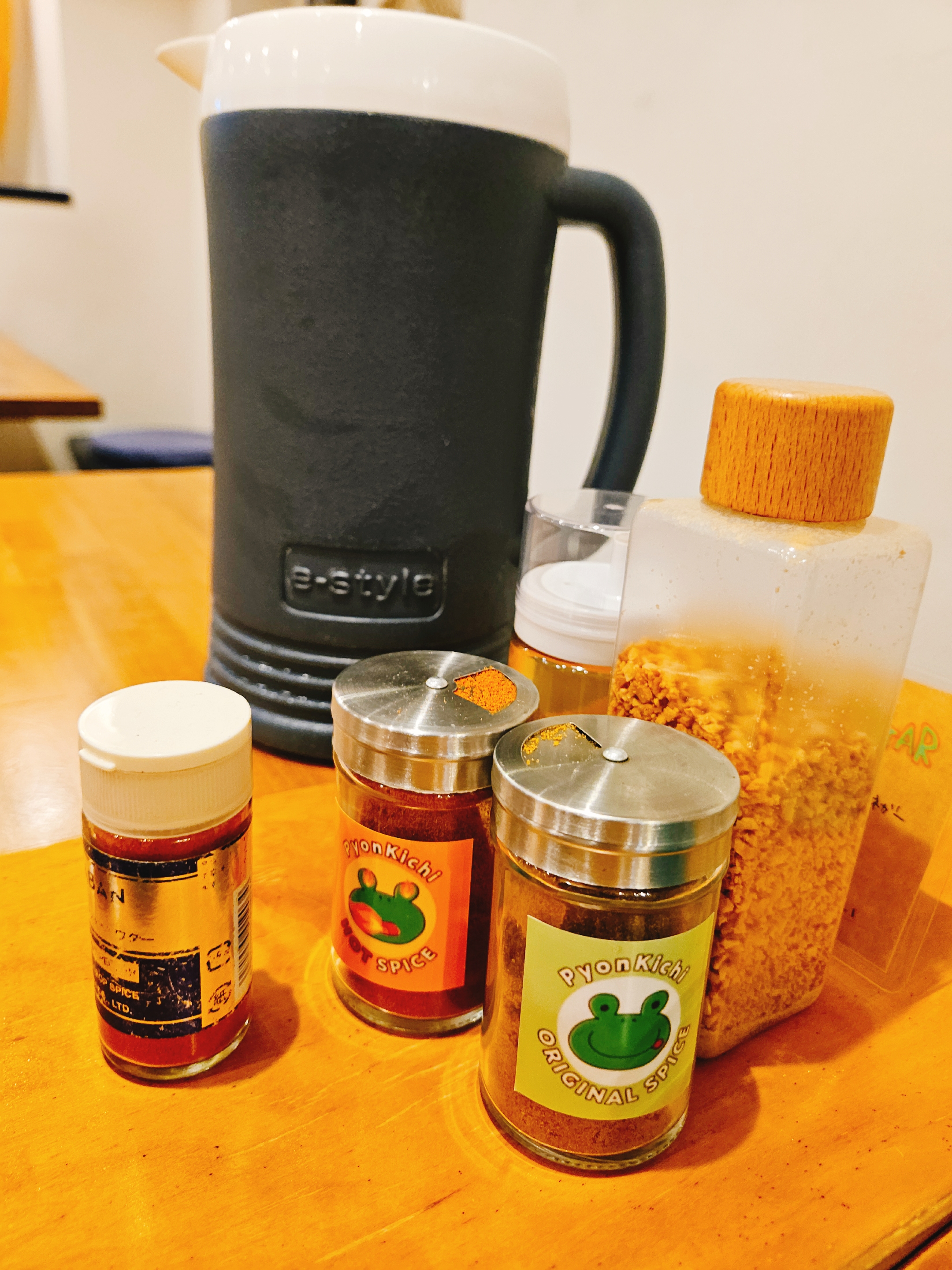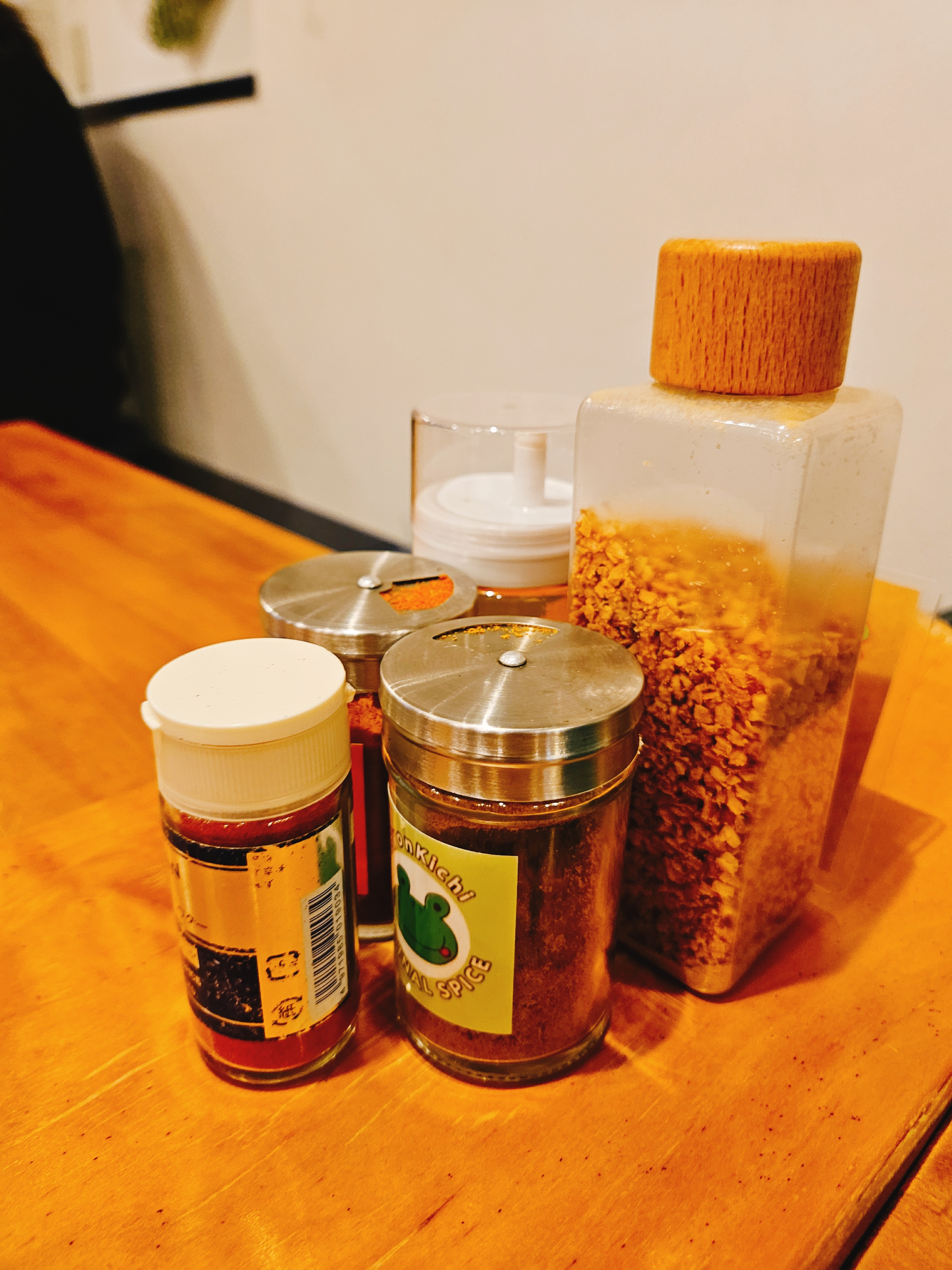 날이 더워서 시원한 얼음물은 무료 제공되며, 테이블마다 마늘 튀긴 후레이크랑 오리지널, 핫 스파이스, 고춧가루 등이 비치되어 있어 기호에 맞게 카레우동에 추가해서 먹을 수 있다.