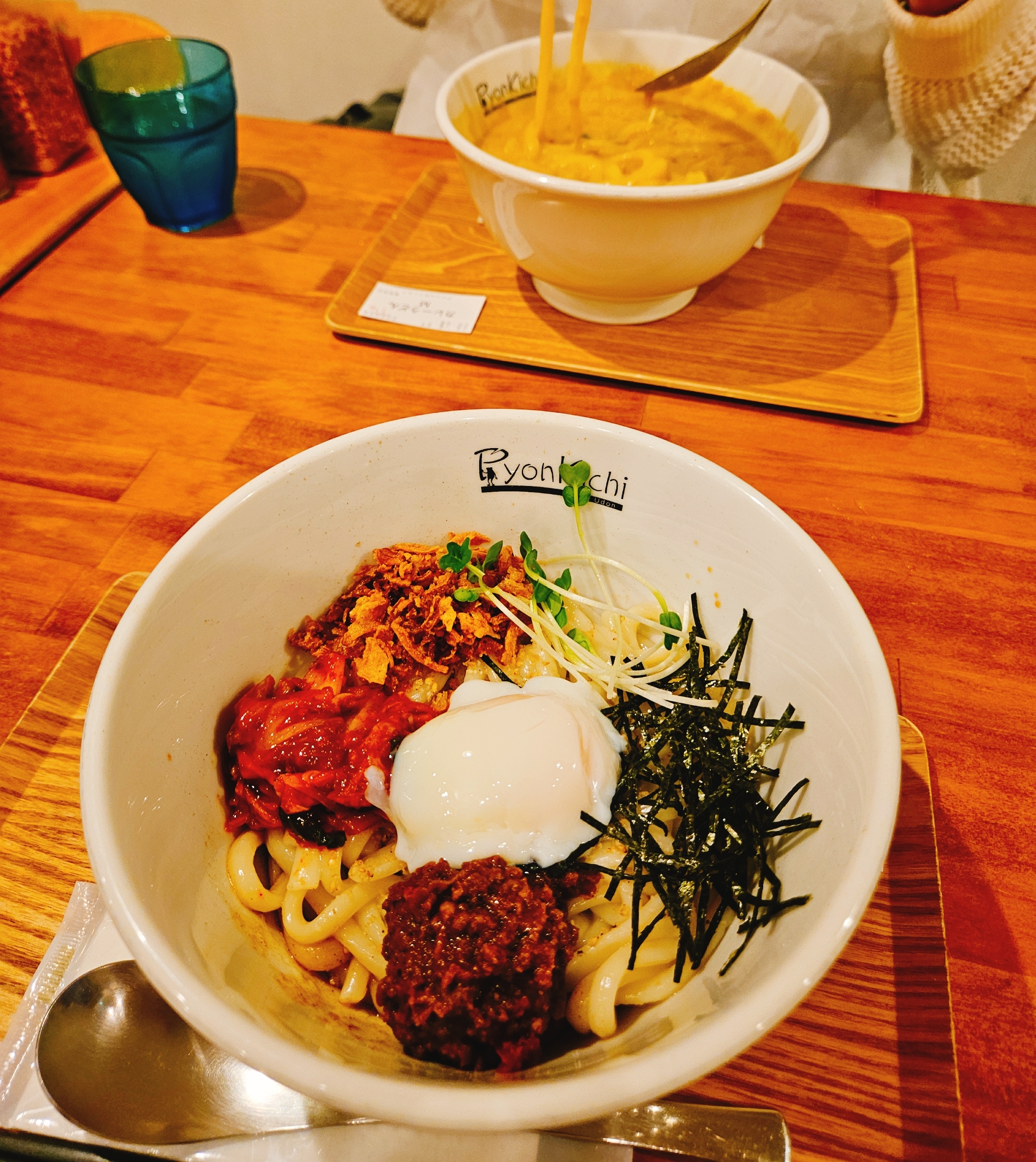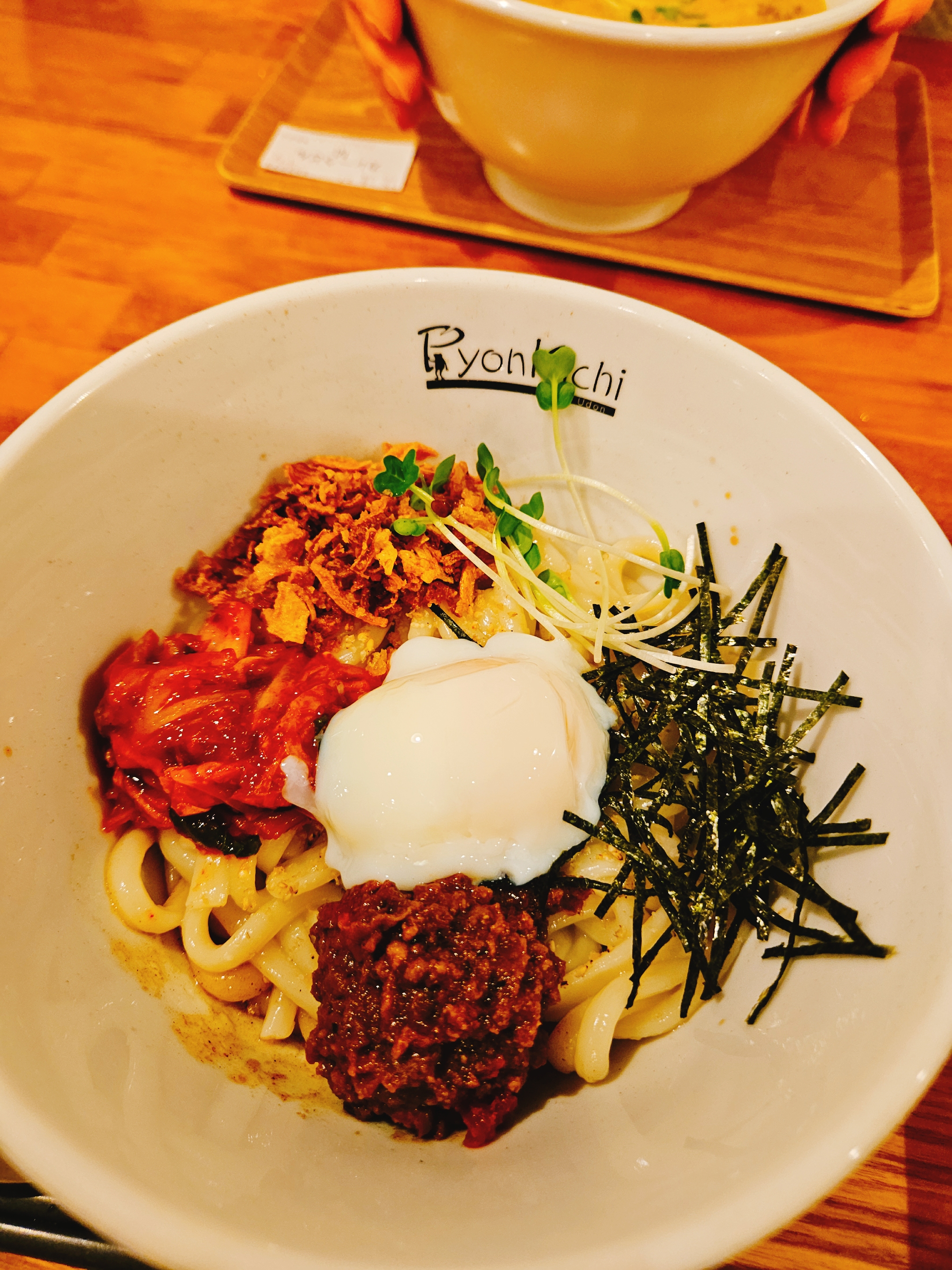 마제 카레우동은 비빔 우동 스타일인데 수란에 김가루, 무순, 양파 후레이크, 김치, 고기 카레소스에 김치가 들어있었다.