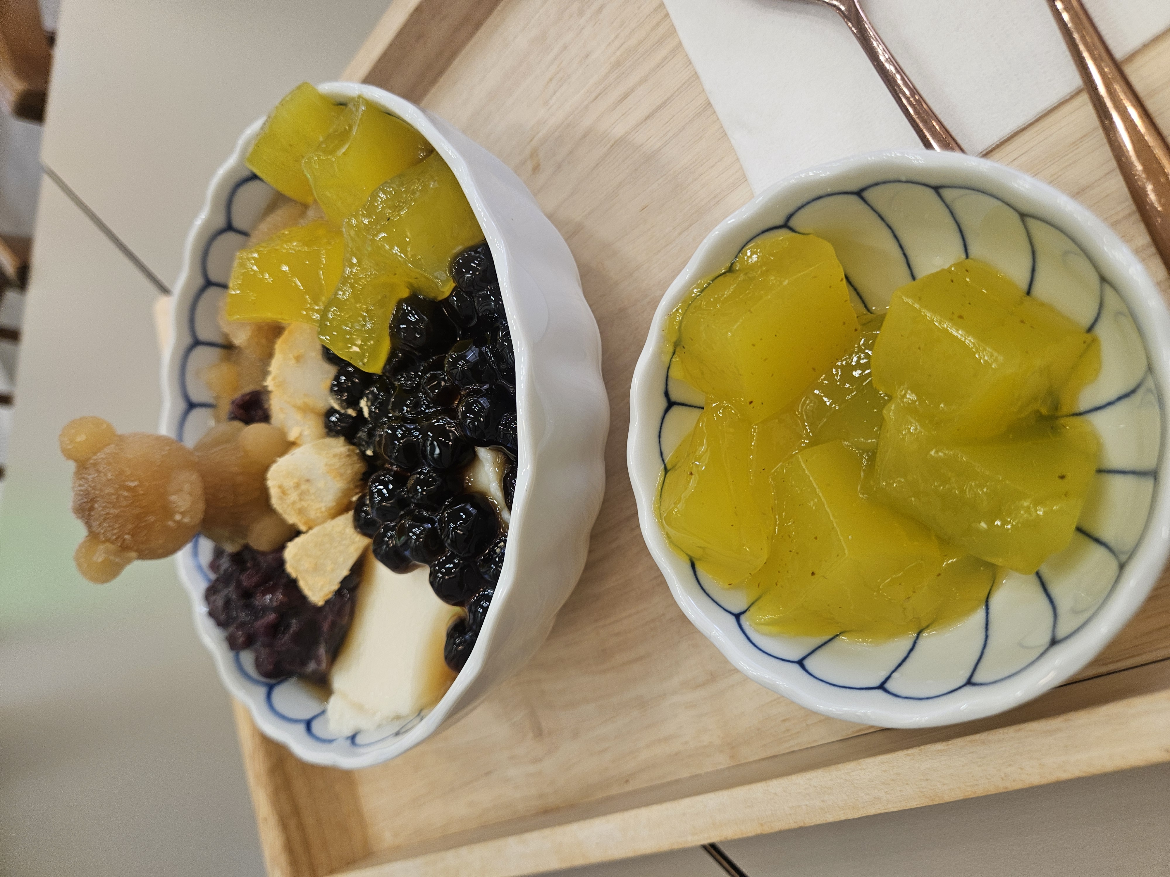 토핑 금액은 보통 1,0~1,5 정도고 또우화 빙수는 팥+타피오카펄+치자 QQ에 연두부랑 살얼음 흑당 베이스의 특별한 빙수인데 가격은 만 원.