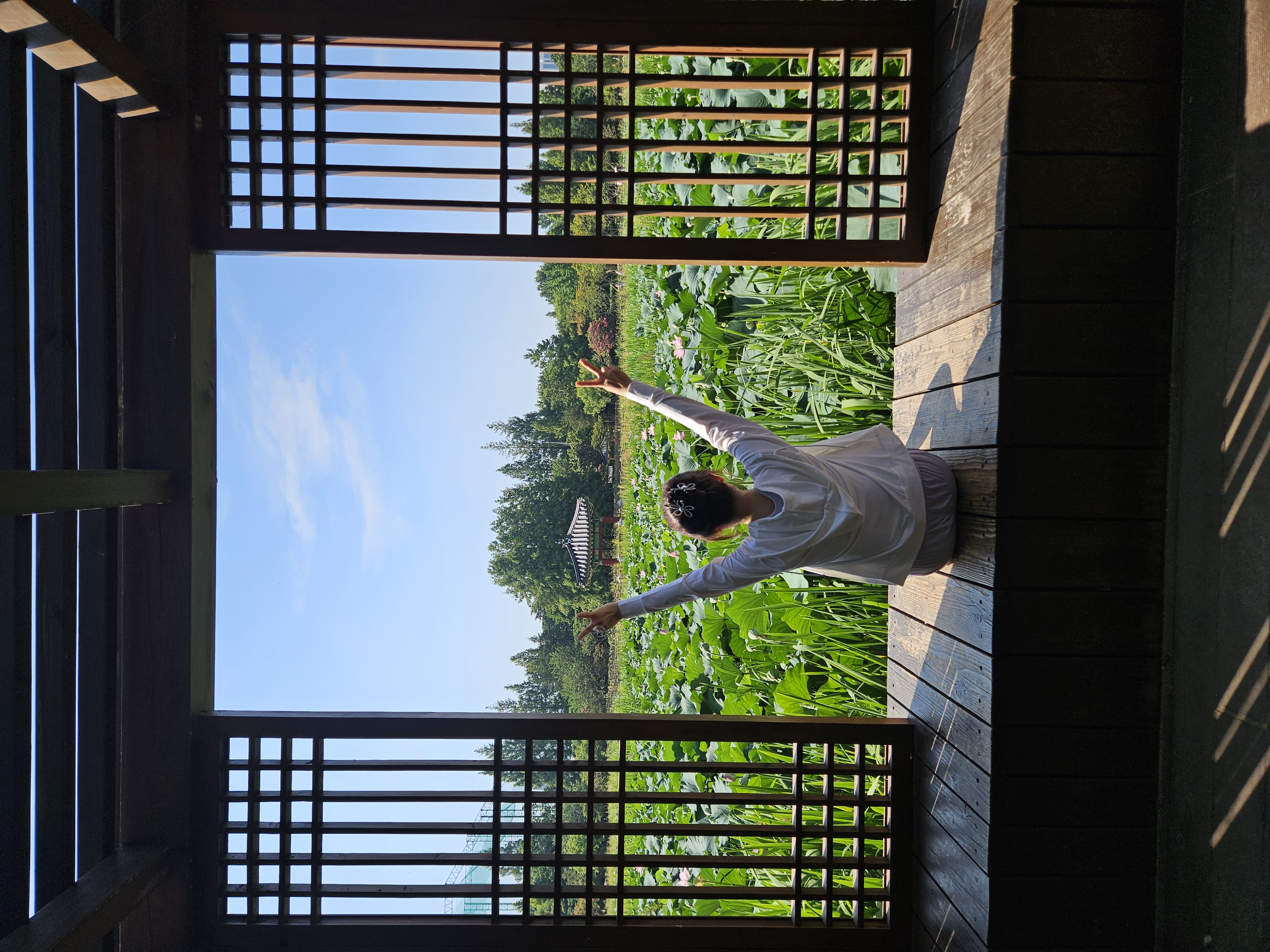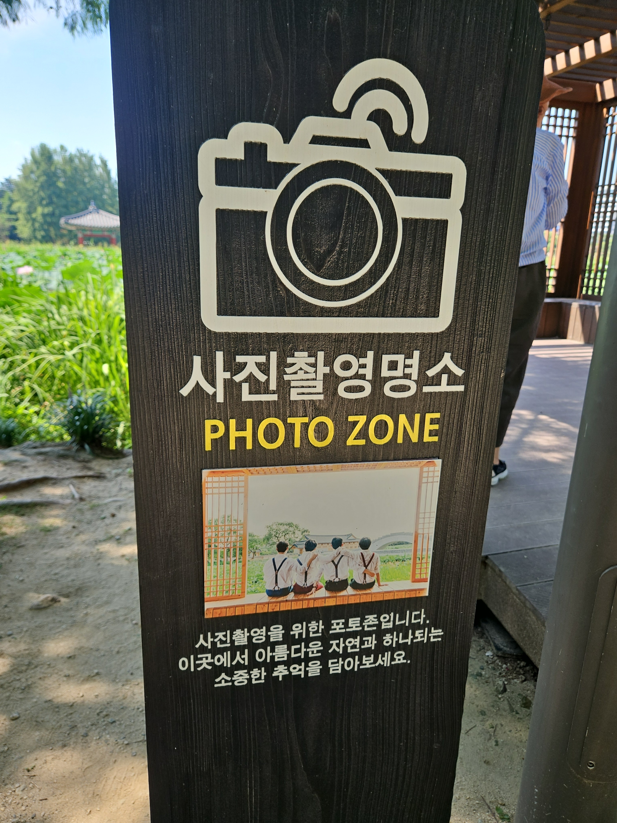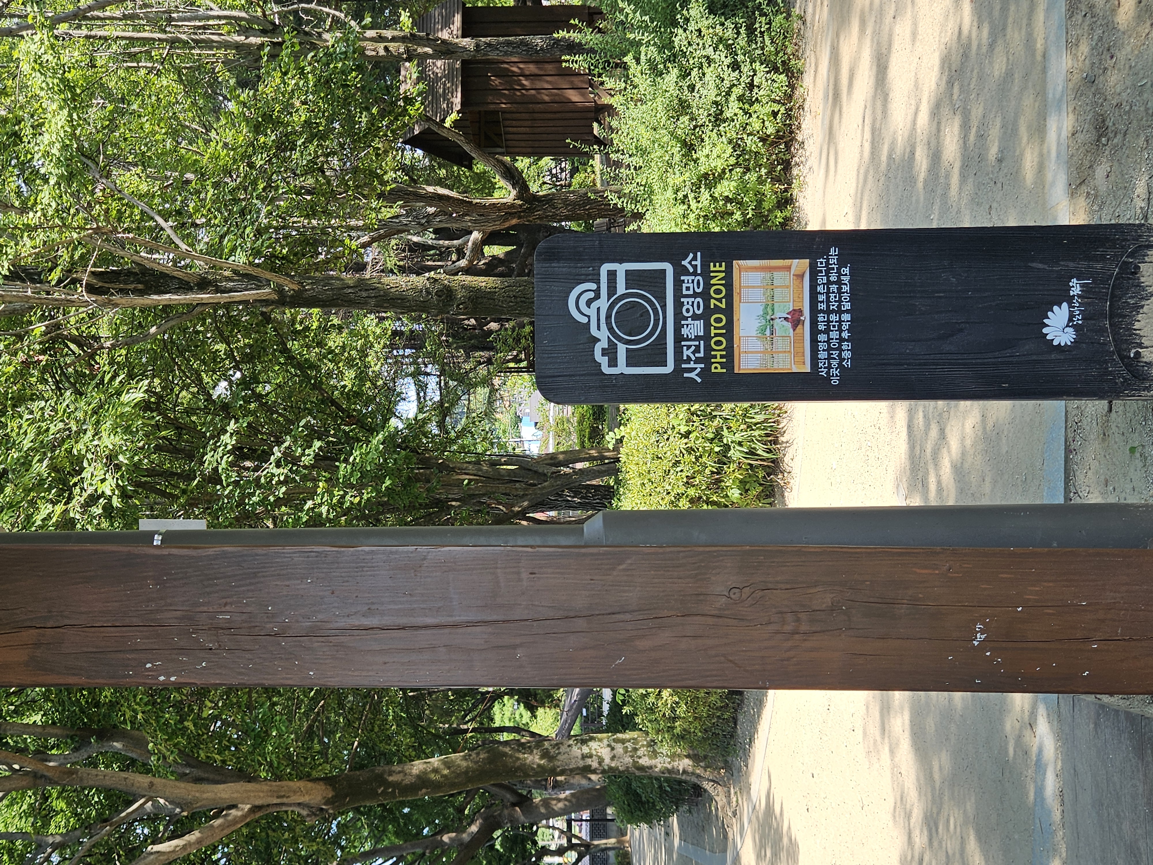 토요일 이른 오전에 방문한 편인데도 주차장에 차량이 생각보다 많았는데 나무 아래 그늘진 주차 공간이 있어 주차 후 연꽃핀 호수 쪽 둘러보며 한옥 느낌 물씬 풍기는 포토존에서 사진 촬영도 했다.