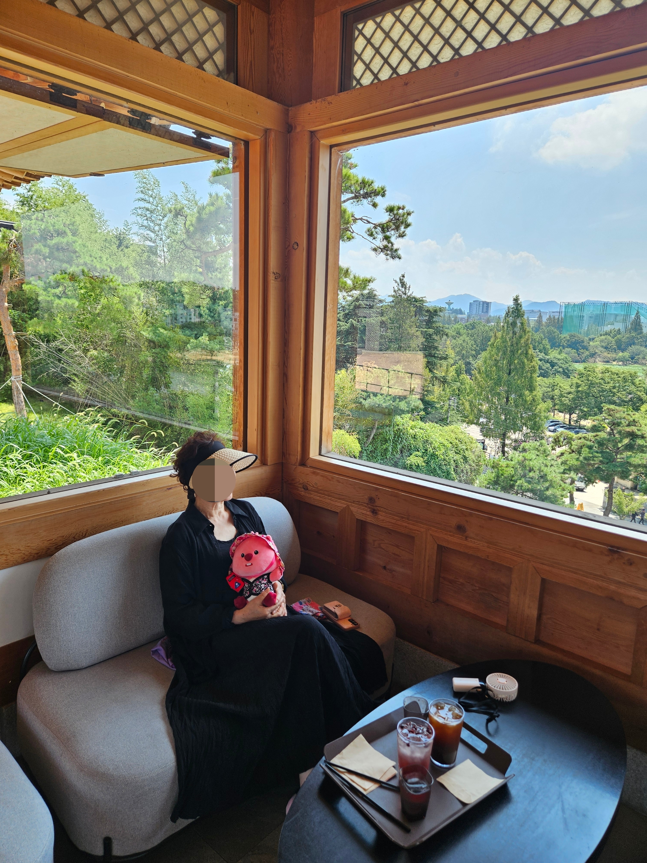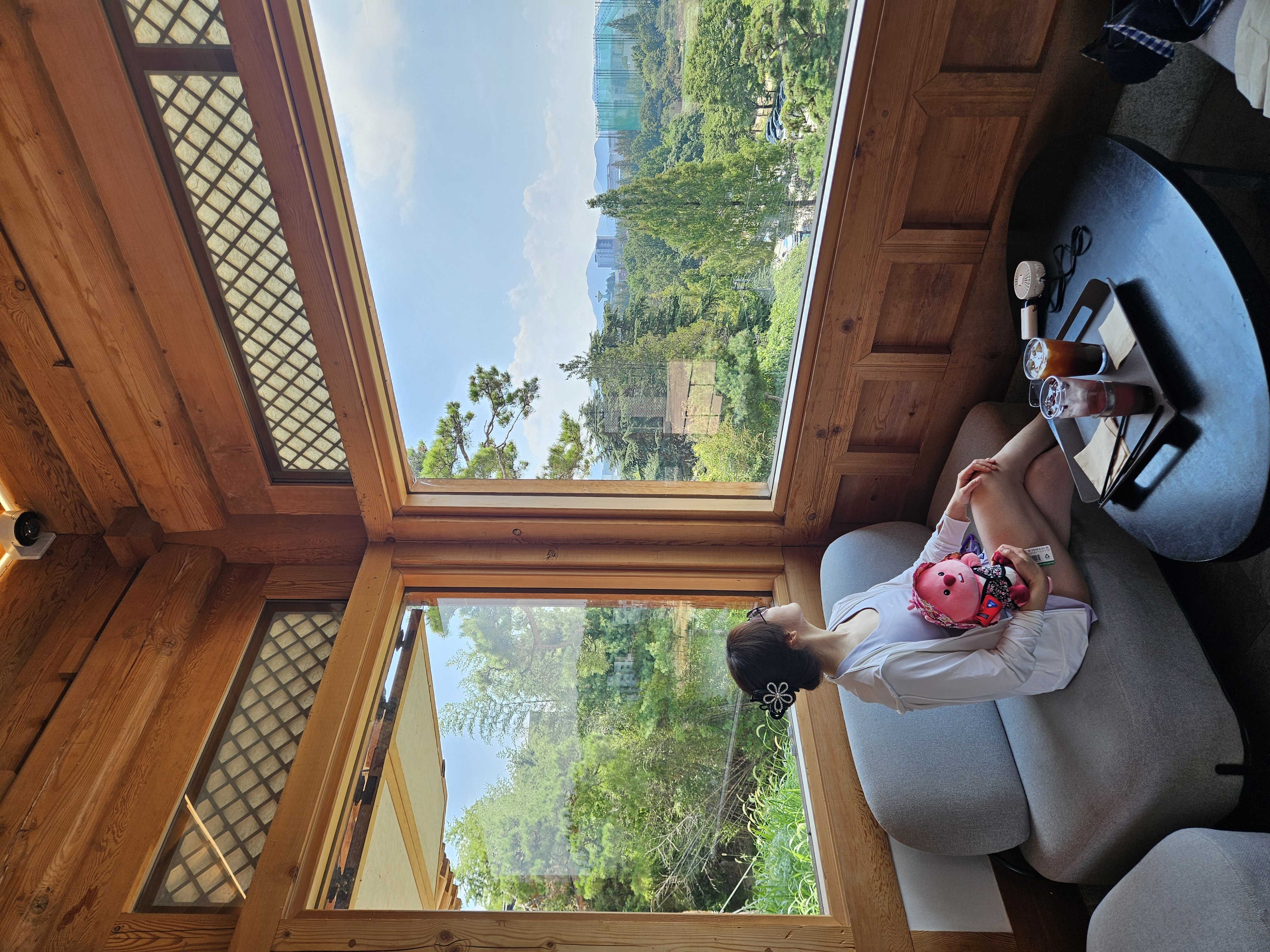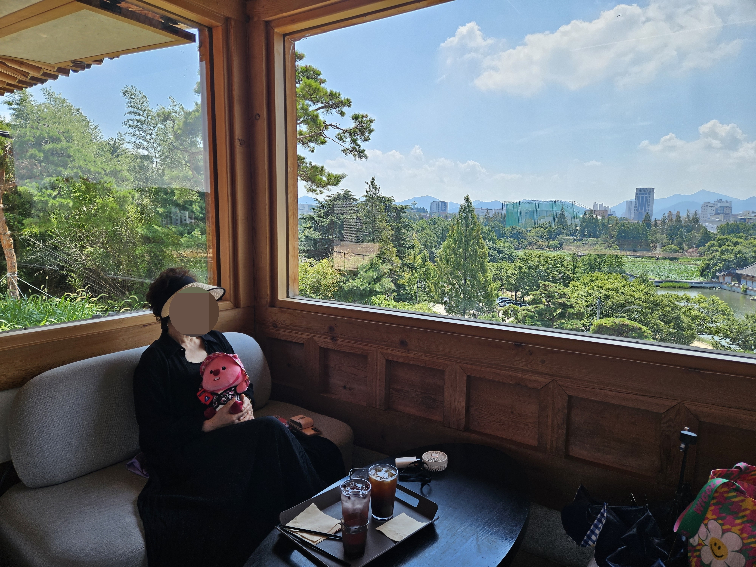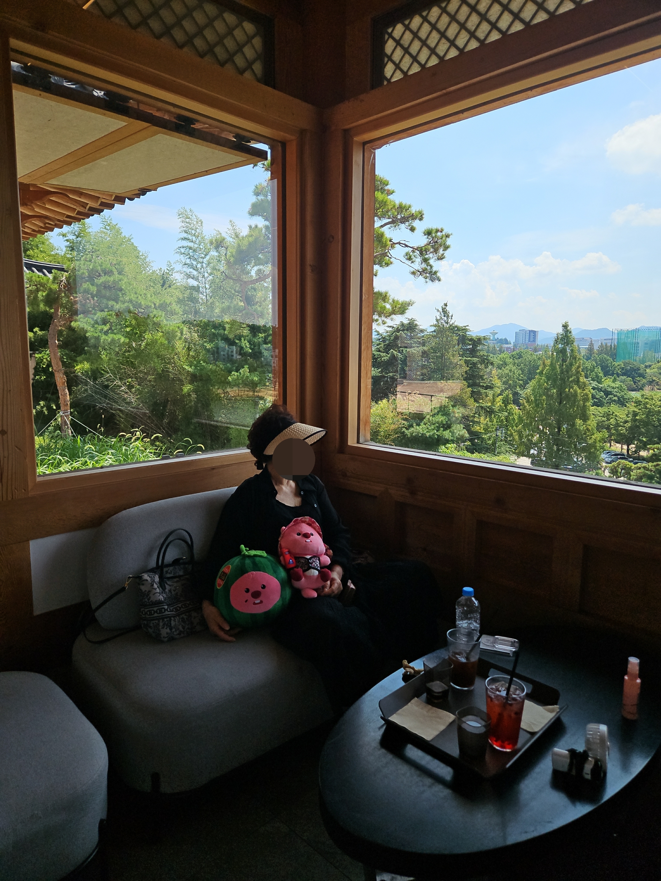 우리가 가장 먼저 도착해서 음료 나오기 전에 가지고온 촌캉스 잔망루피와 수박 잔망루피 가지고 사진 찍었는데 덕진공원 뷰 고지대에 위치한 한옥카페로 창문을 크게 내서 채광도 좋고 뷰도 멋져서 마음에 든다.