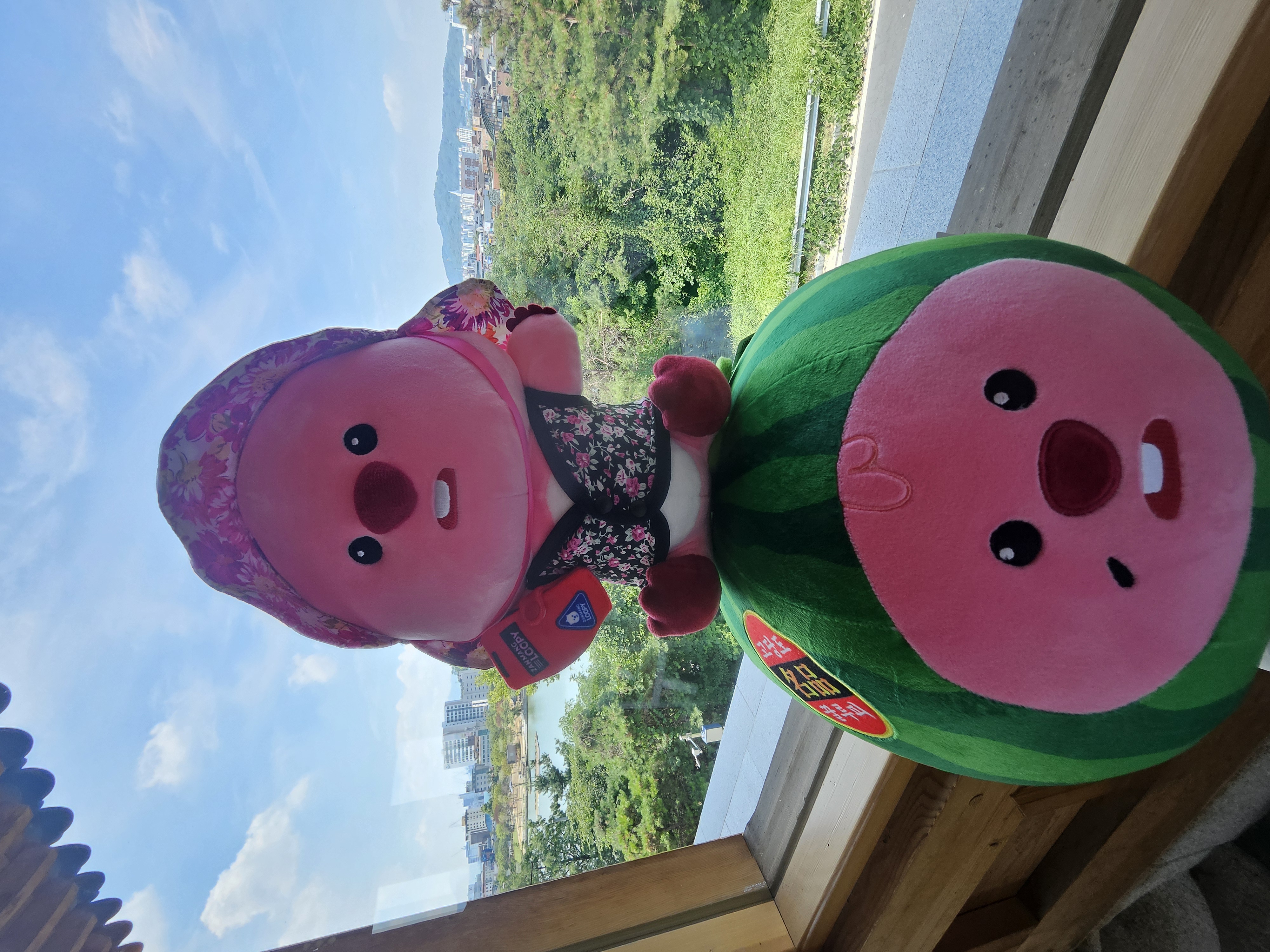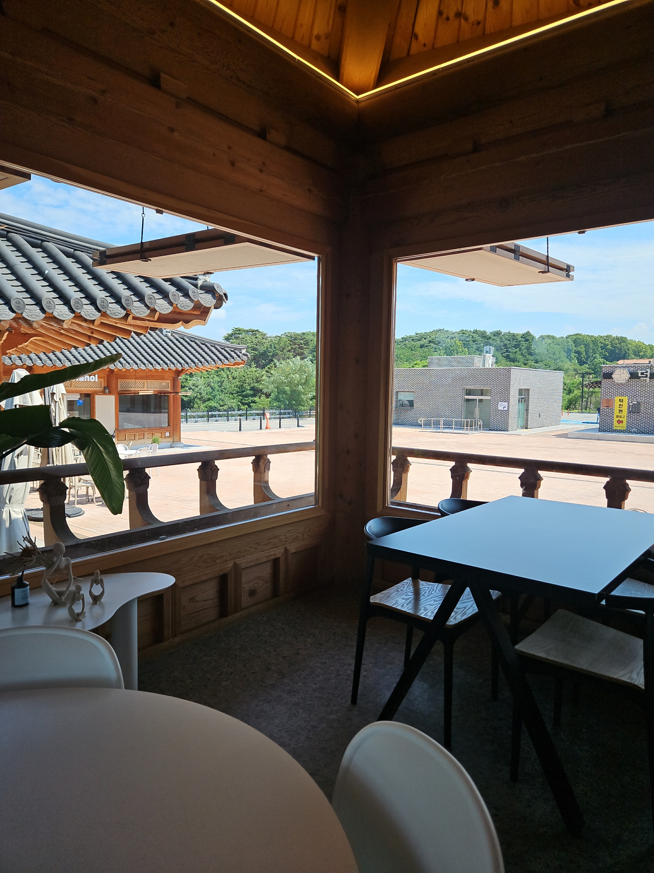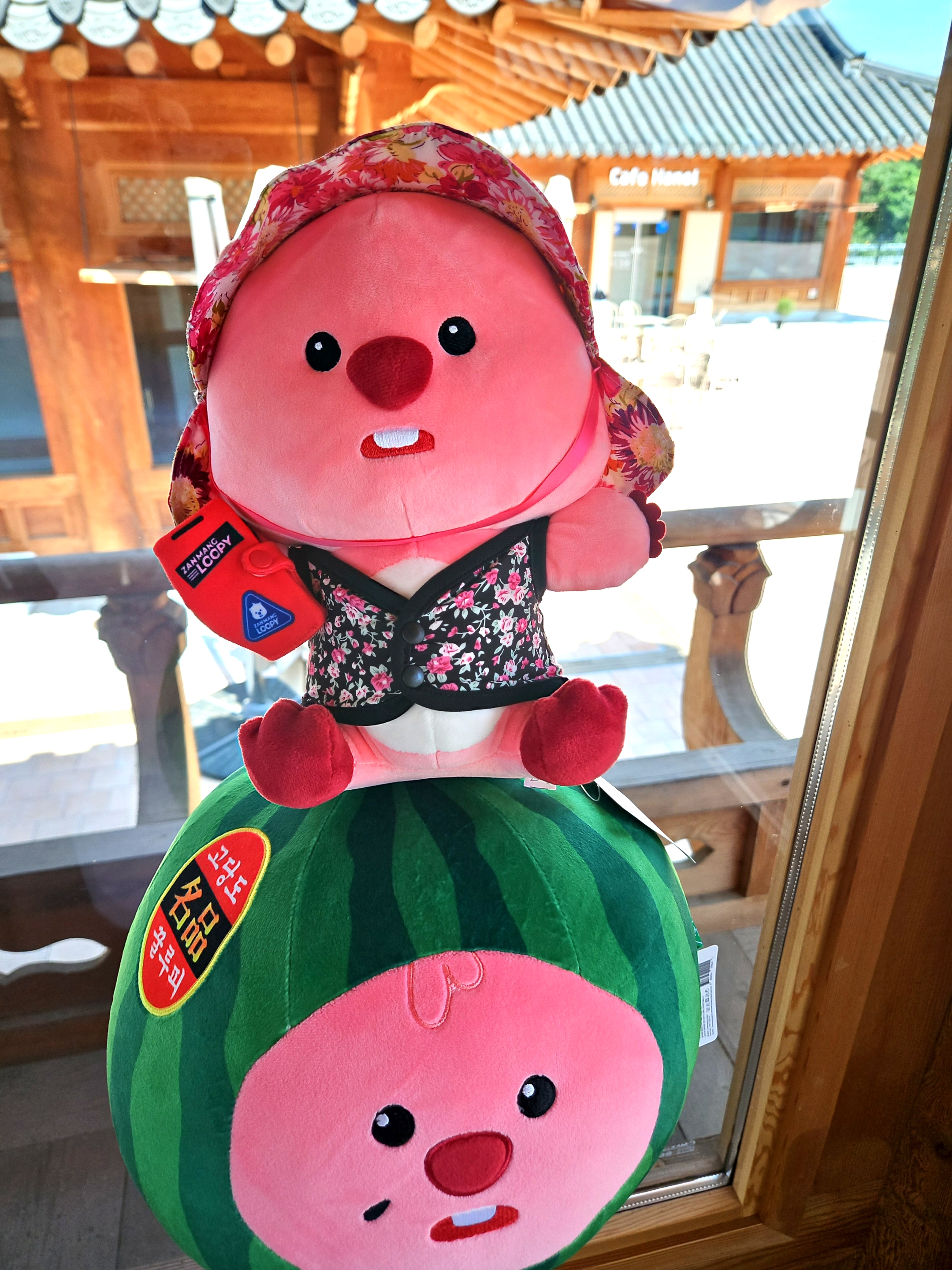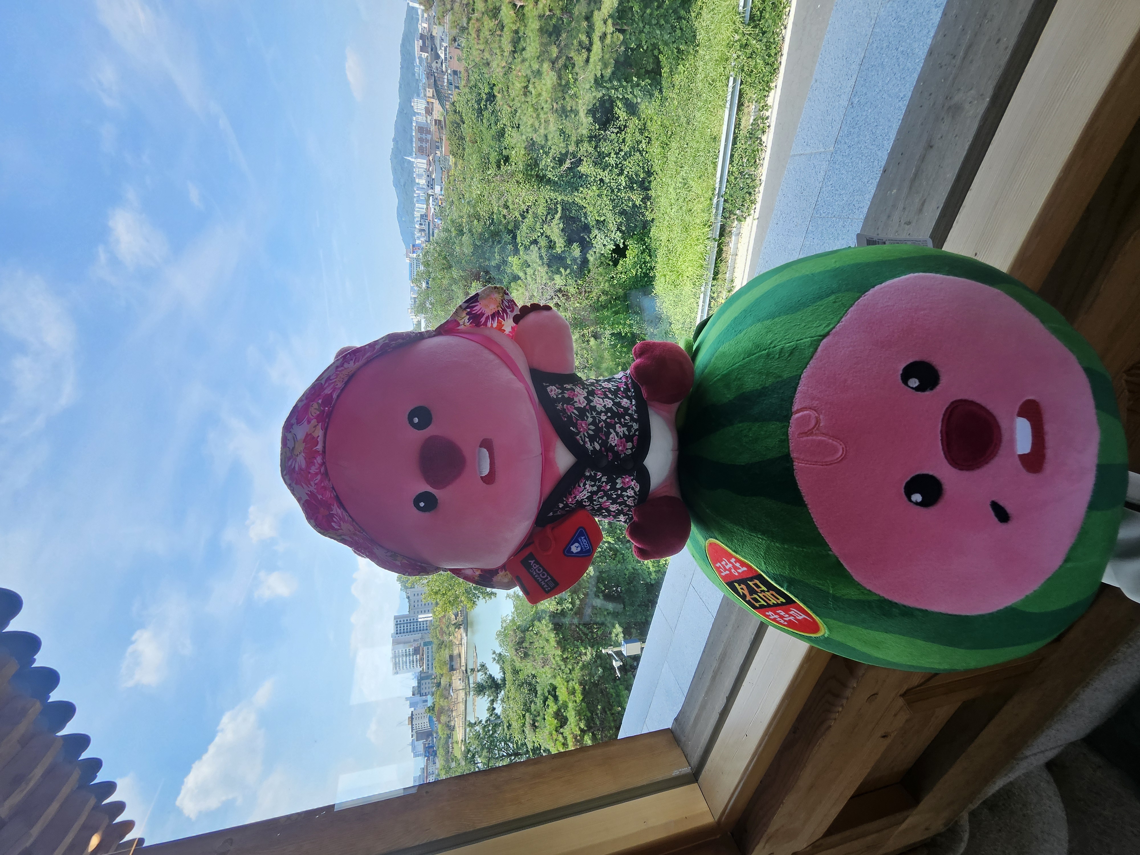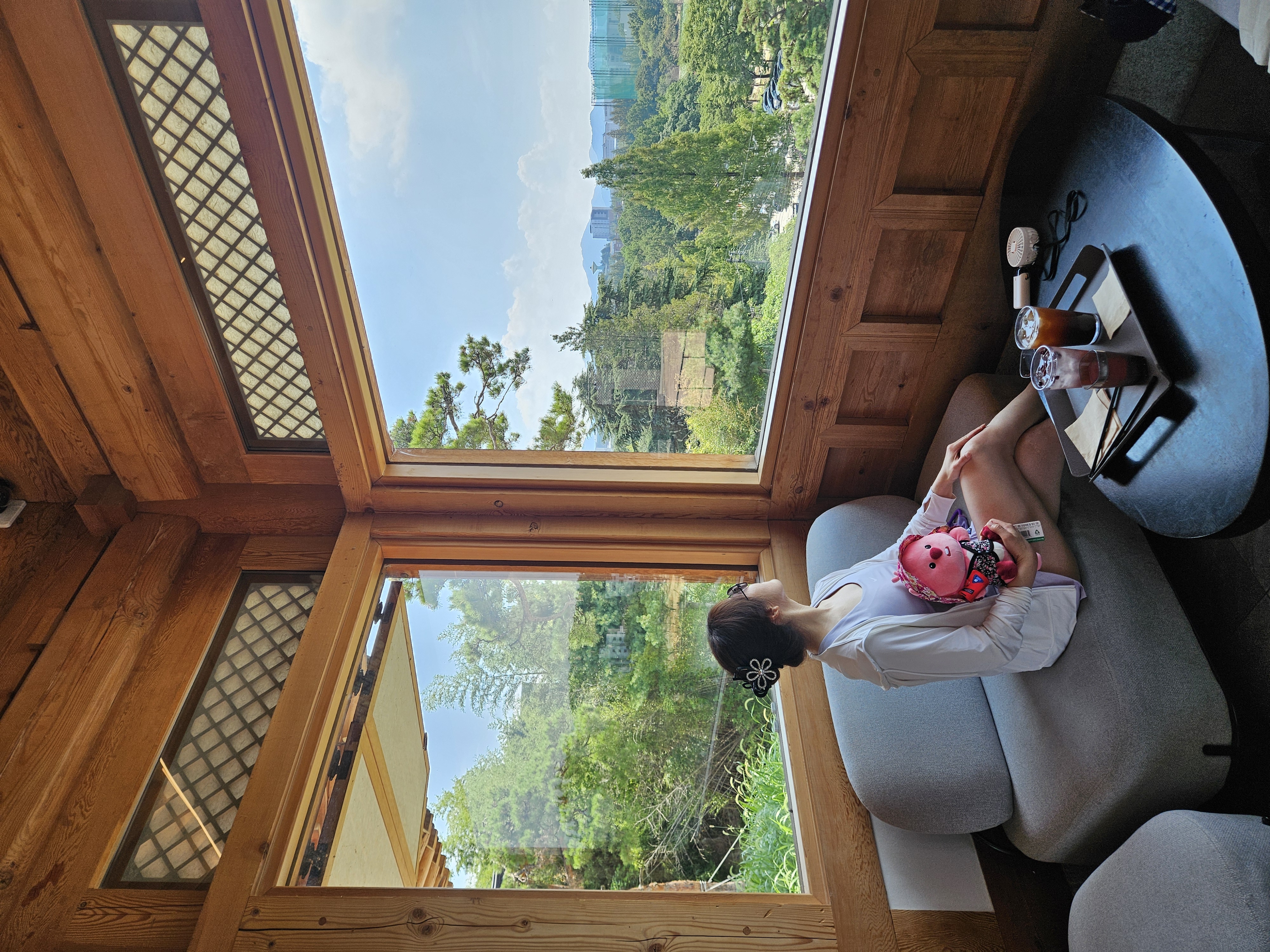 우리가 가장 먼저 도착해서 음료 나오기 전에 가지고온 촌캉스 잔망루피와 수박 잔망루피 가지고 사진 찍었는데 덕진공원 뷰 고지대에 위치한 한옥카페로 창문을 크게 내서 채광도 좋고 뷰도 멋져서 마음에 든다.