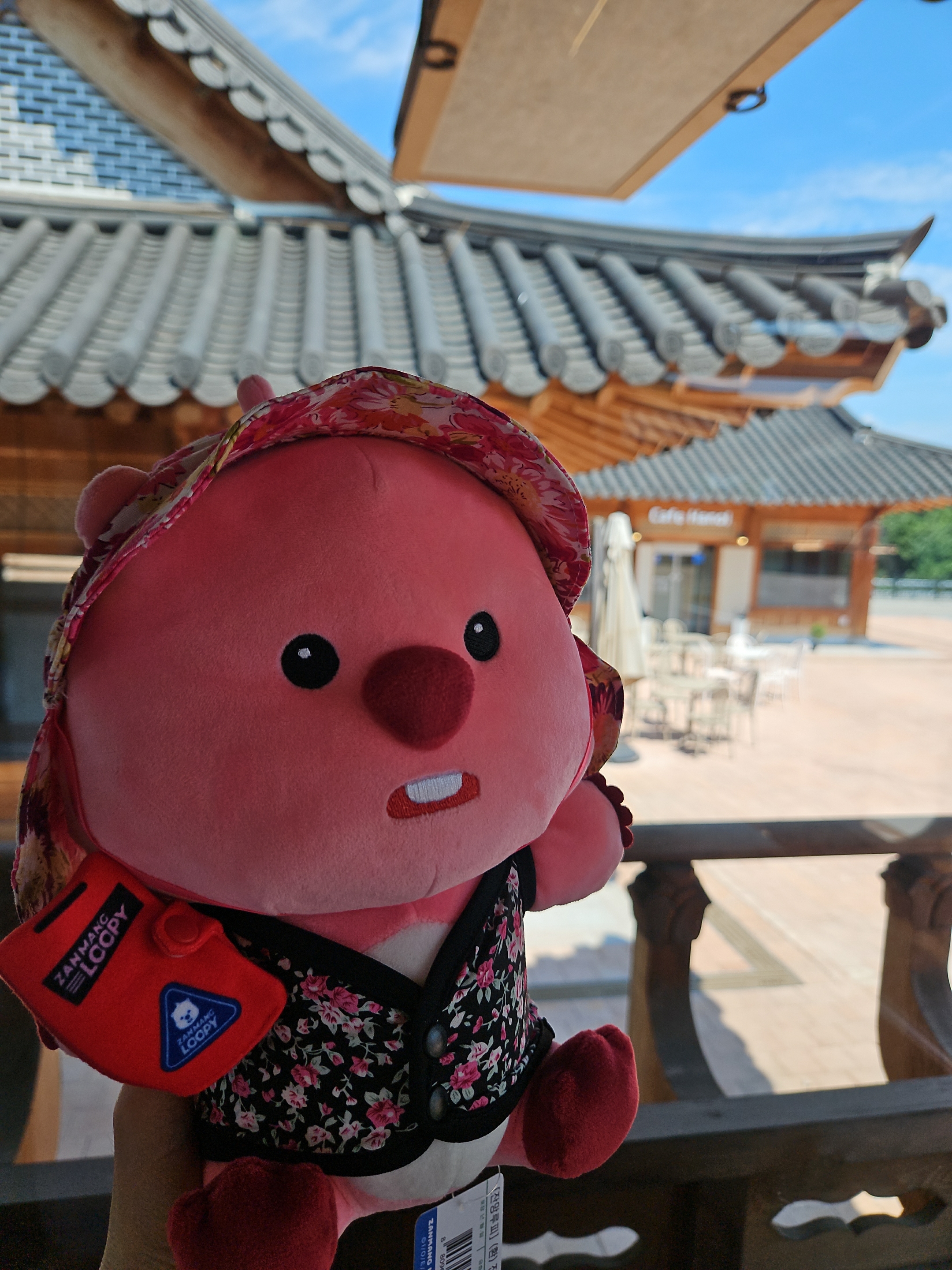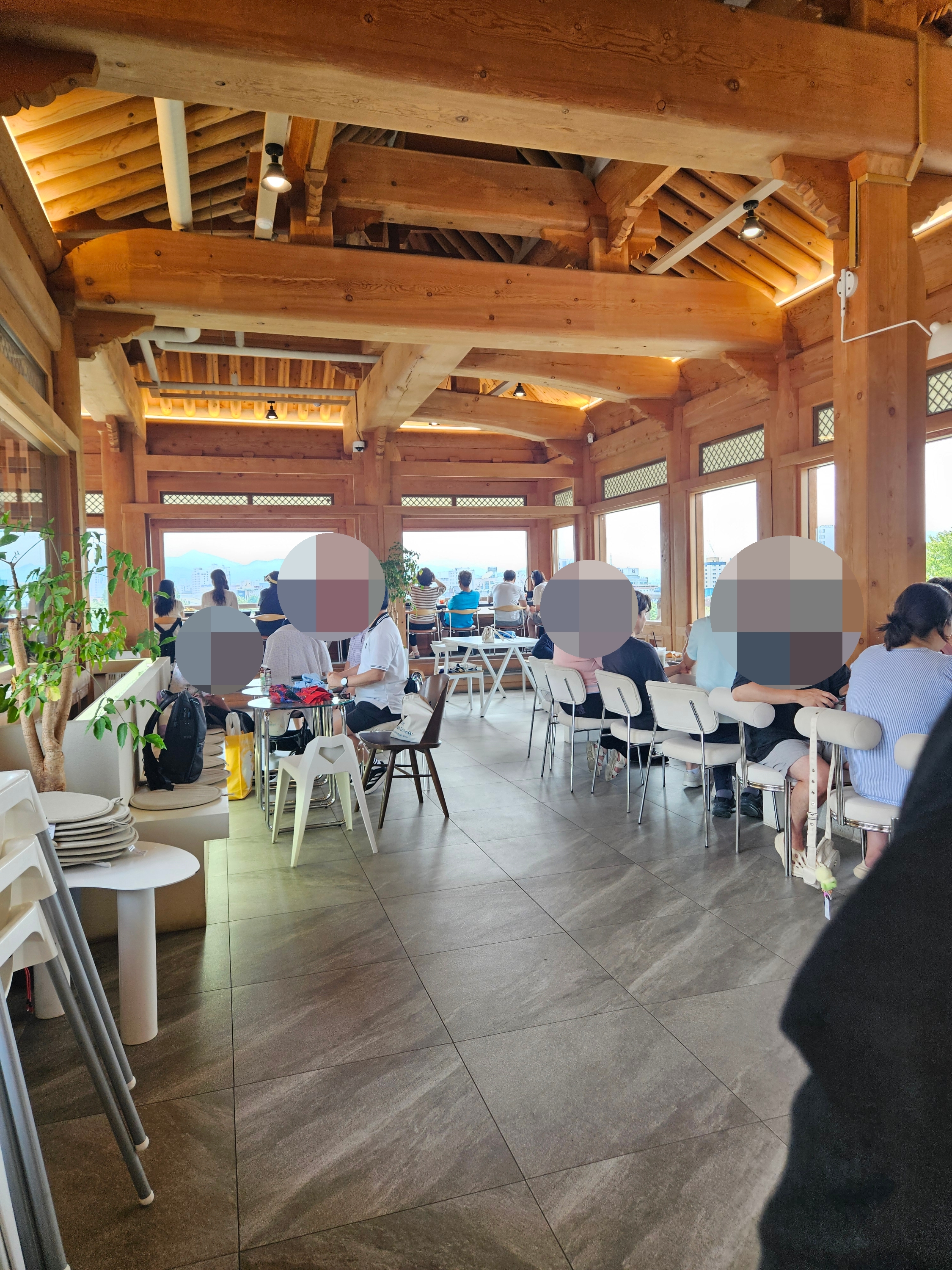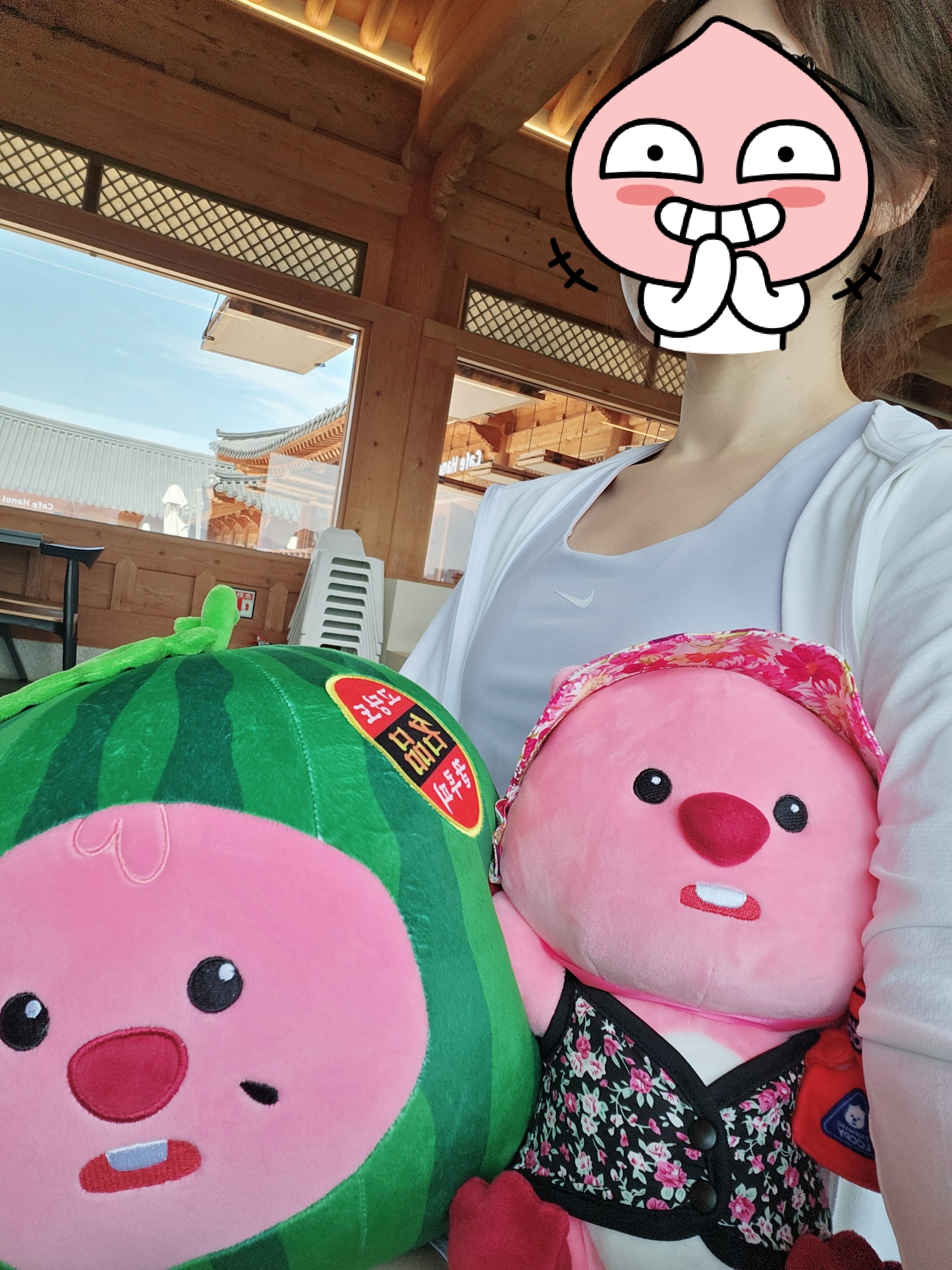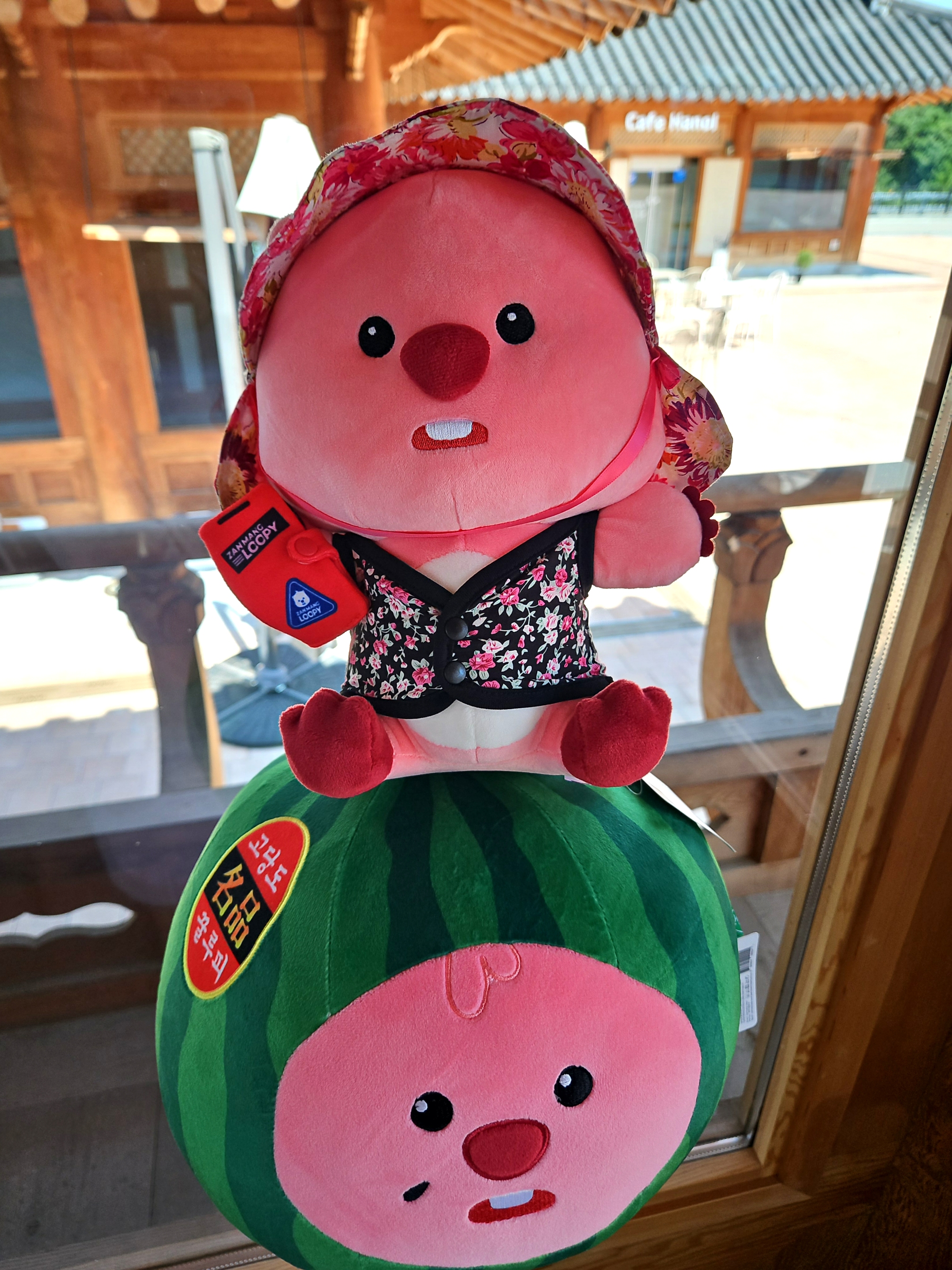 우리가 가장 먼저 도착해서 음료 나오기 전에 가지고온 촌캉스 잔망루피와 수박 잔망루피 가지고 사진 찍었는데 덕진공원 뷰 고지대에 위치한 한옥카페로 창문을 크게 내서 채광도 좋고 뷰도 멋져서 마음에 든다.
