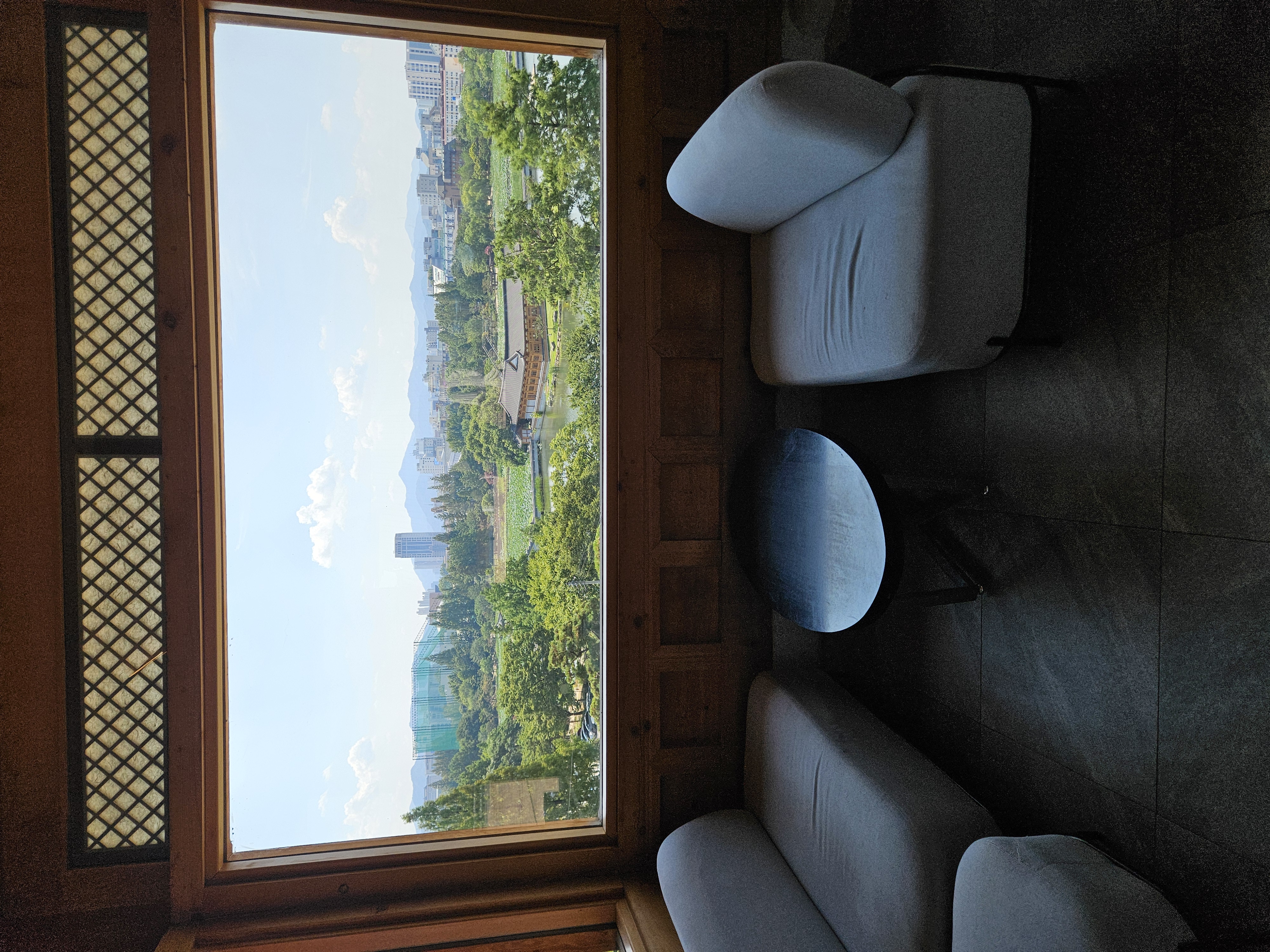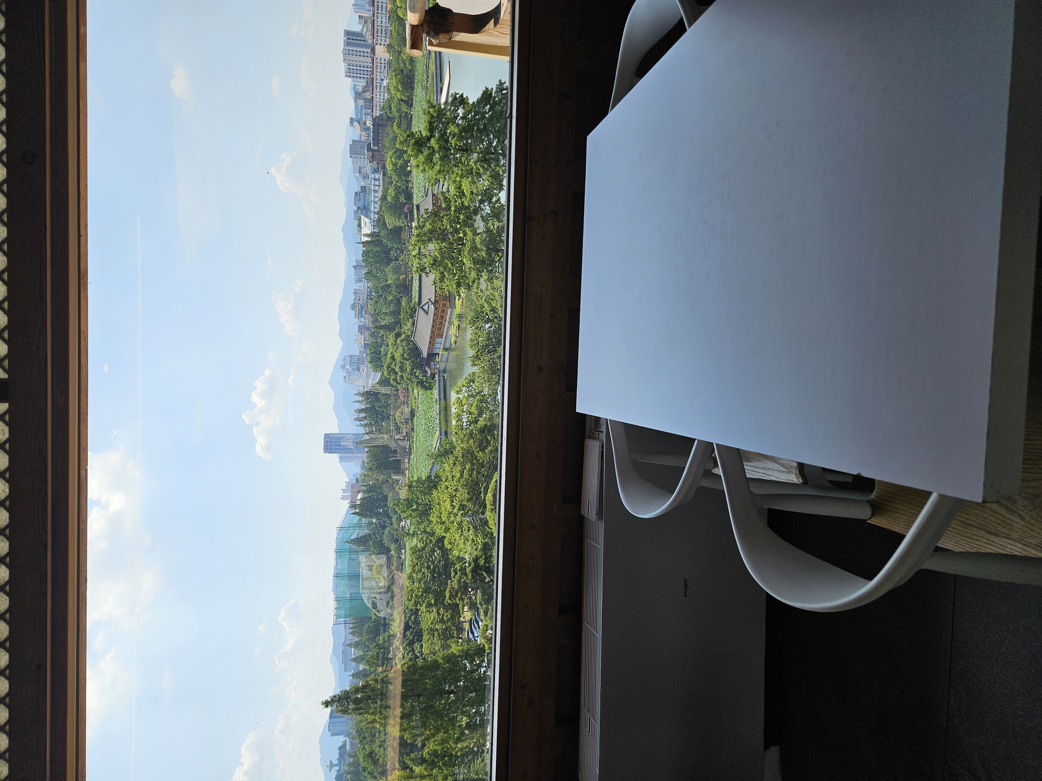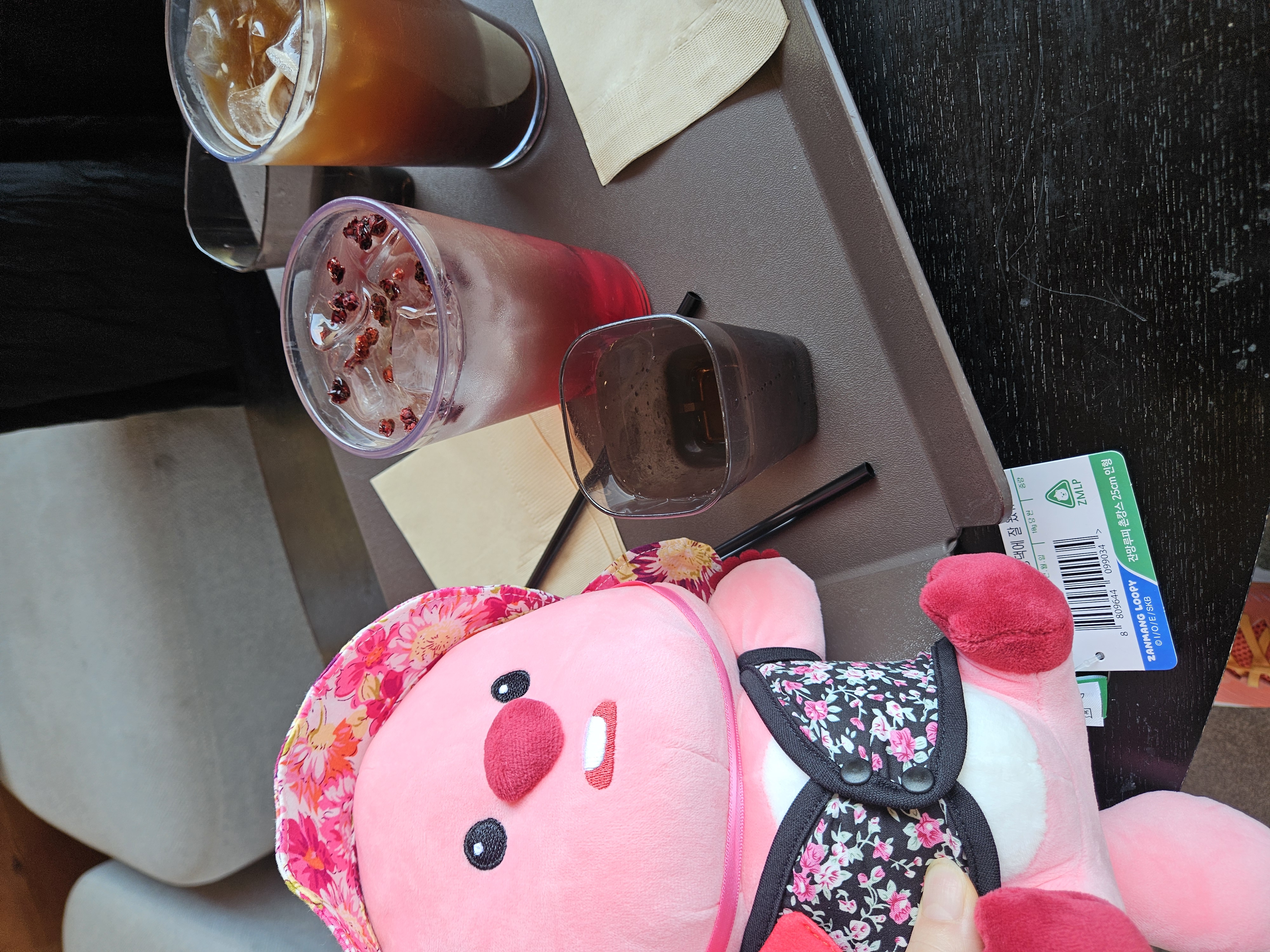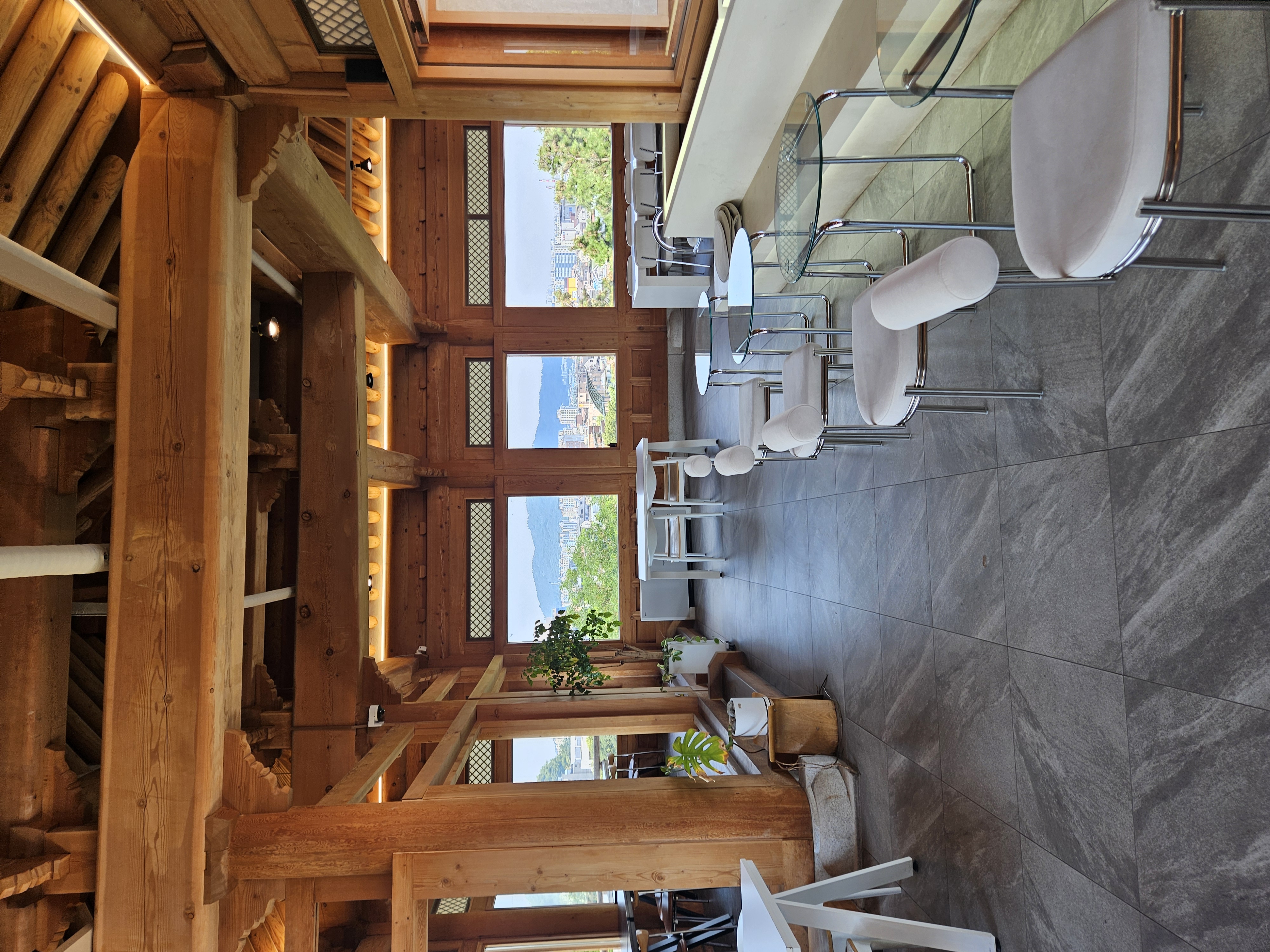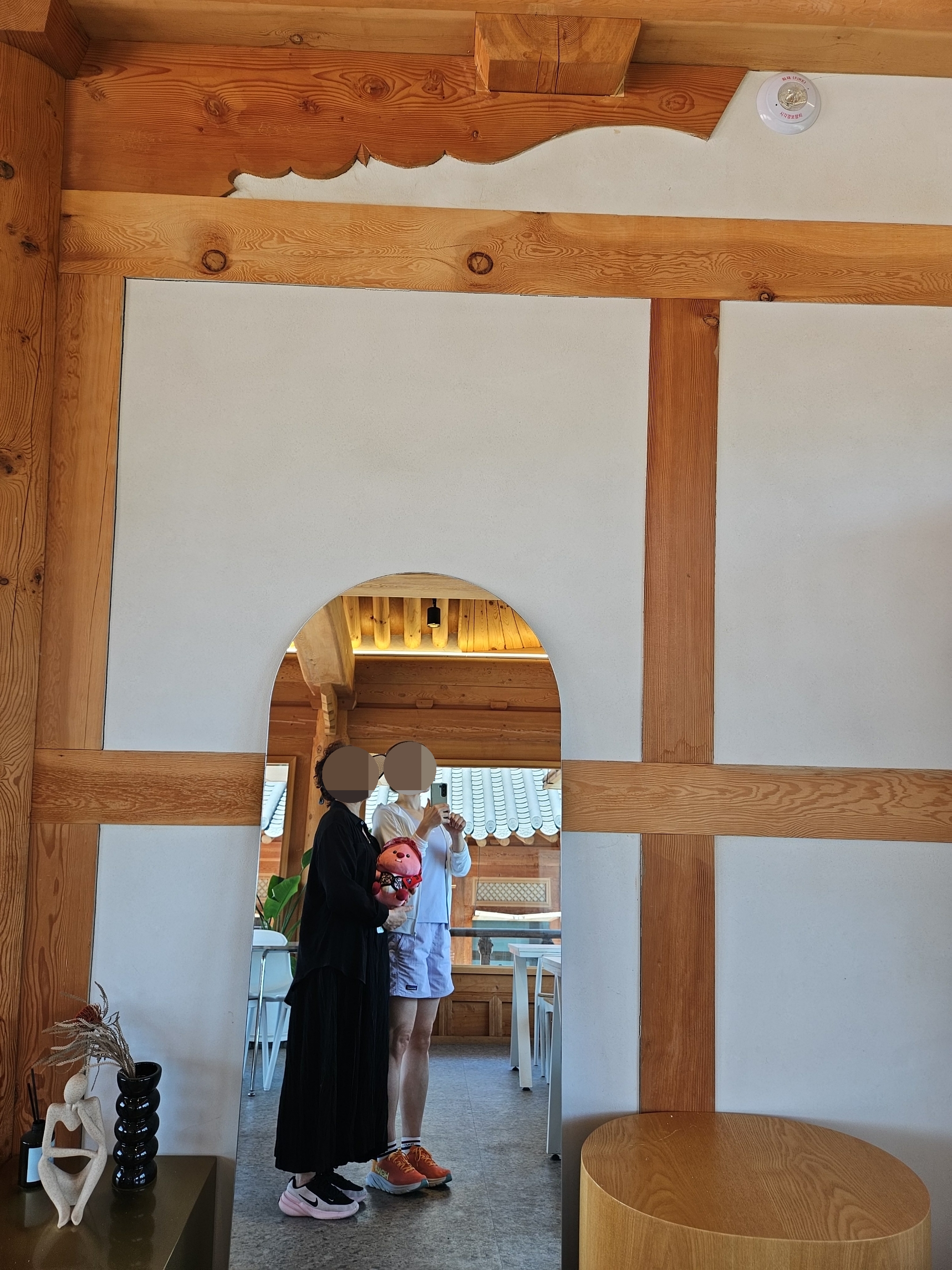 우리가 가장 먼저 도착해서 음료 나오기 전에 가지고온 촌캉스 잔망루피와 수박 잔망루피 가지고 사진 찍었는데 덕진공원 뷰 고지대에 위치한 한옥카페로 창문을 크게 내서 채광도 좋고 뷰도 멋져서 마음에 든다.