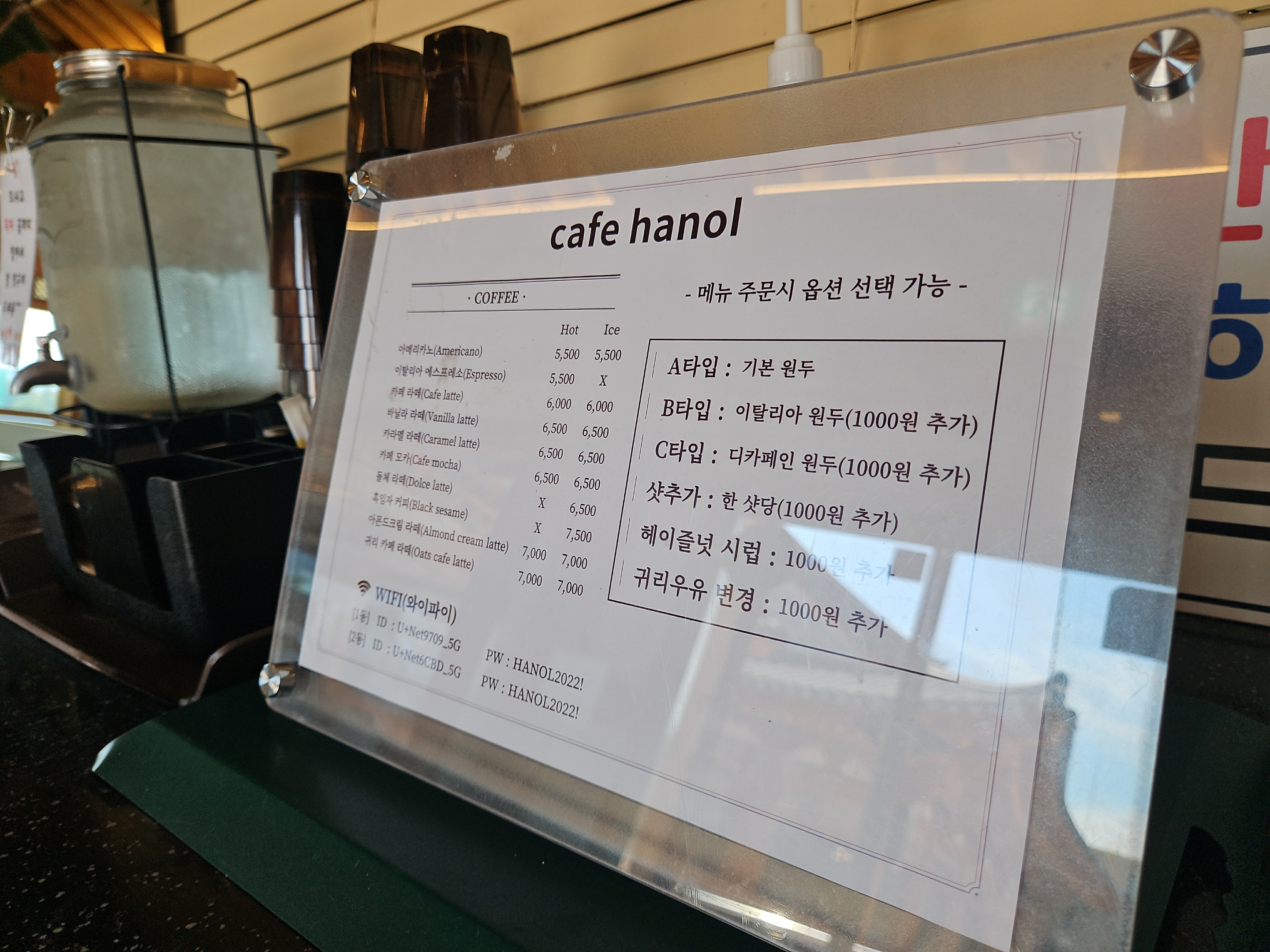 커피와 음료 메뉴 다양하고 메뉴 주문시 원두(옵션 선택, 추가금 O) 선택도 가능하다.