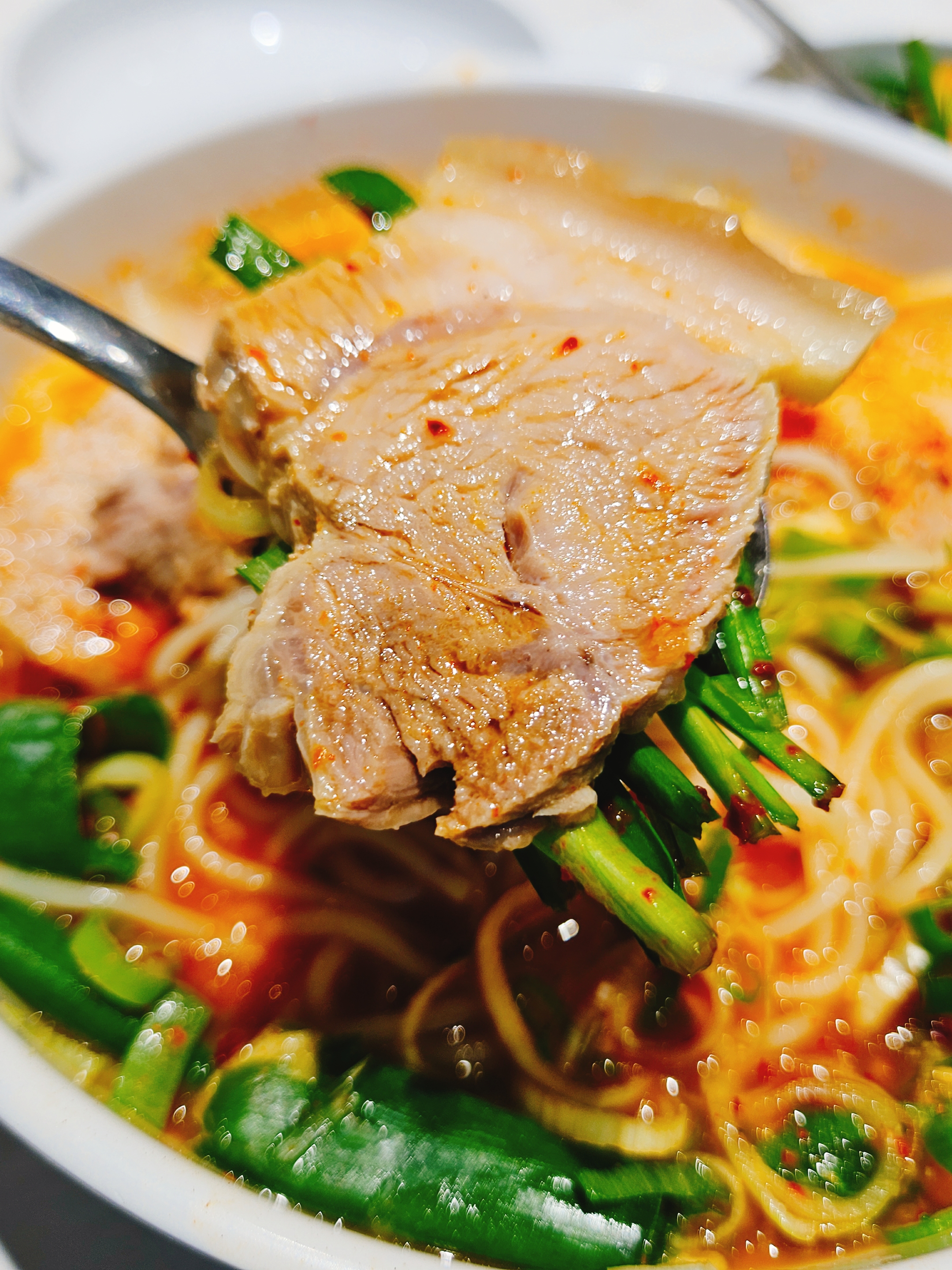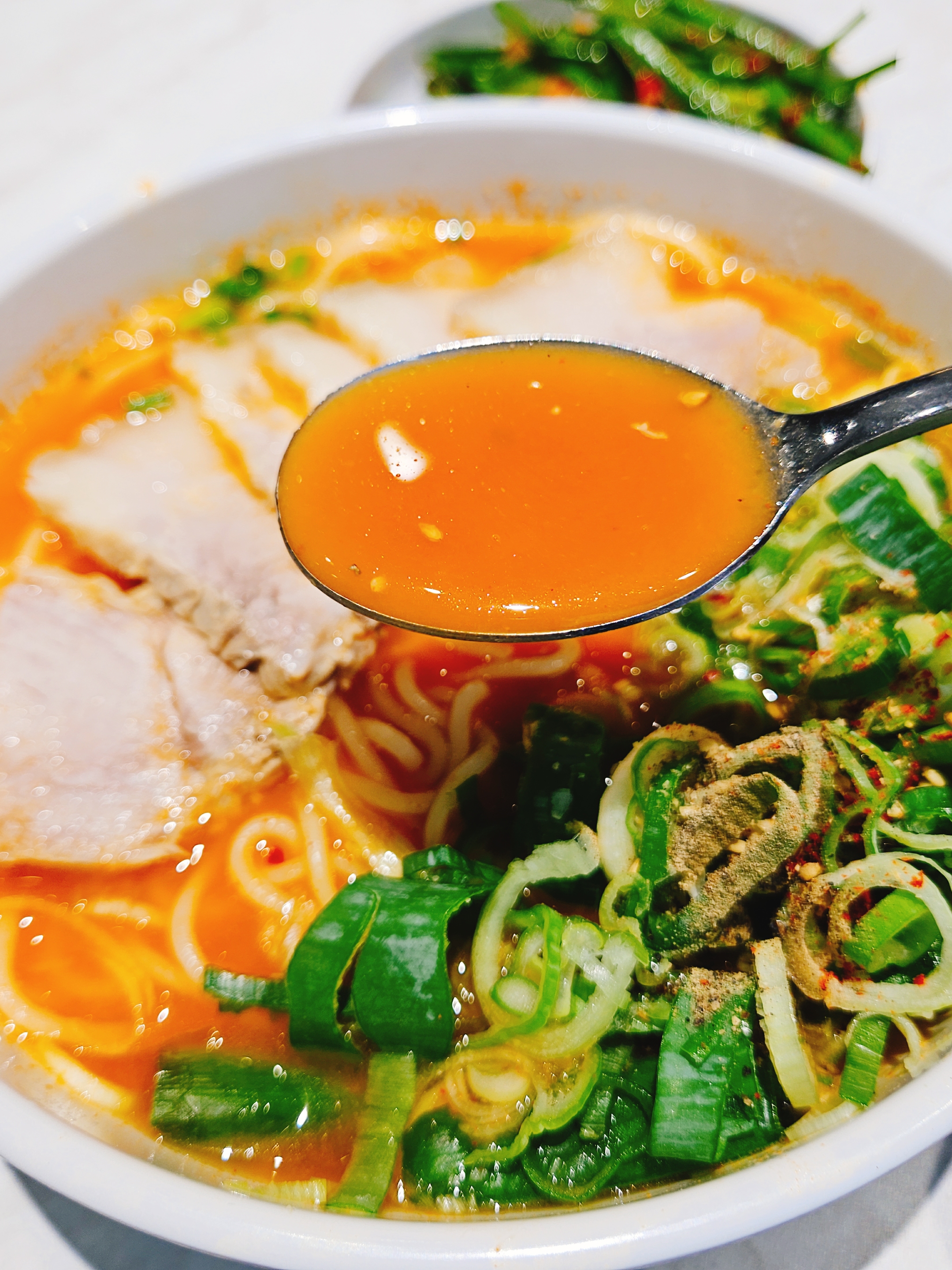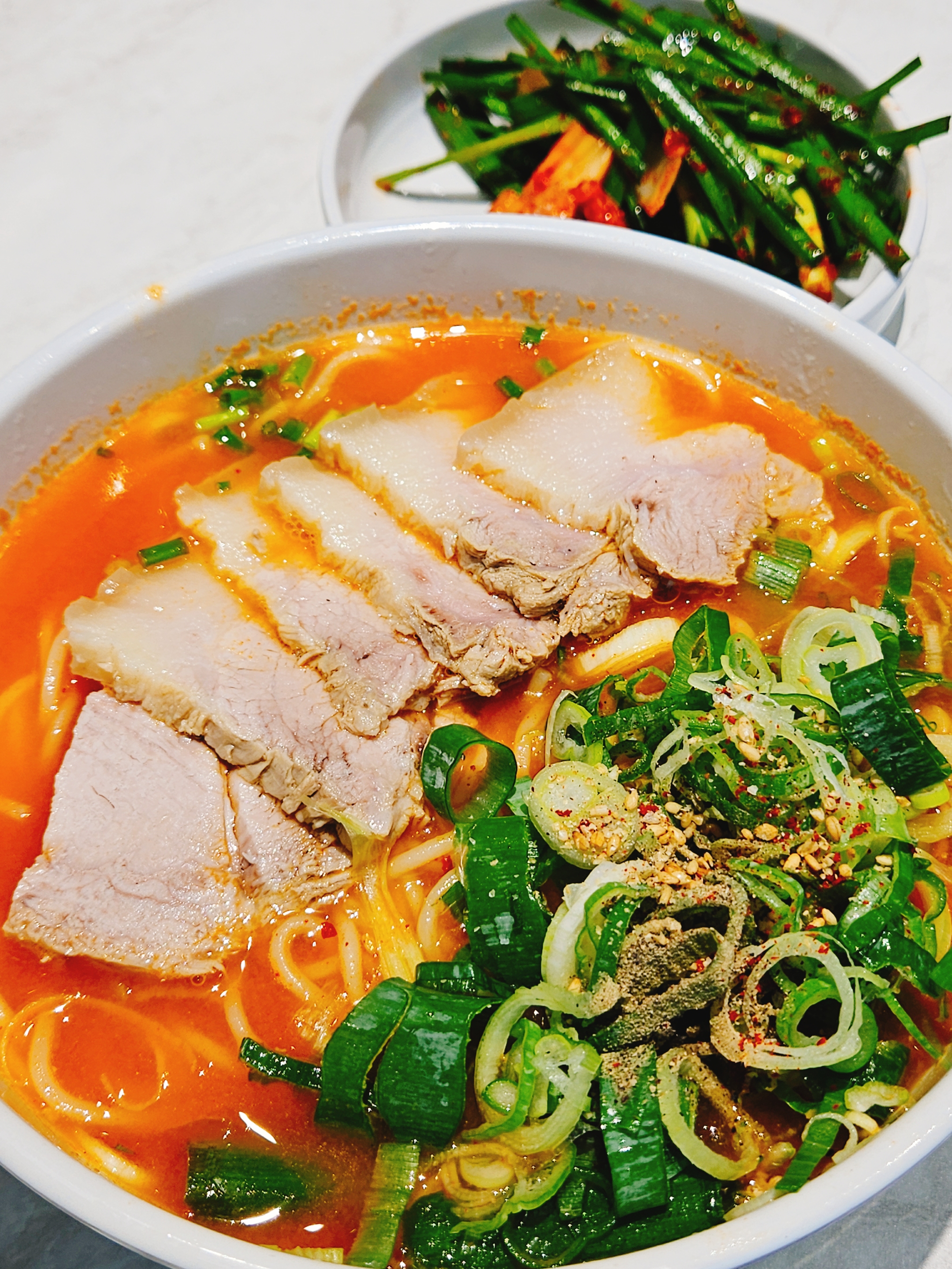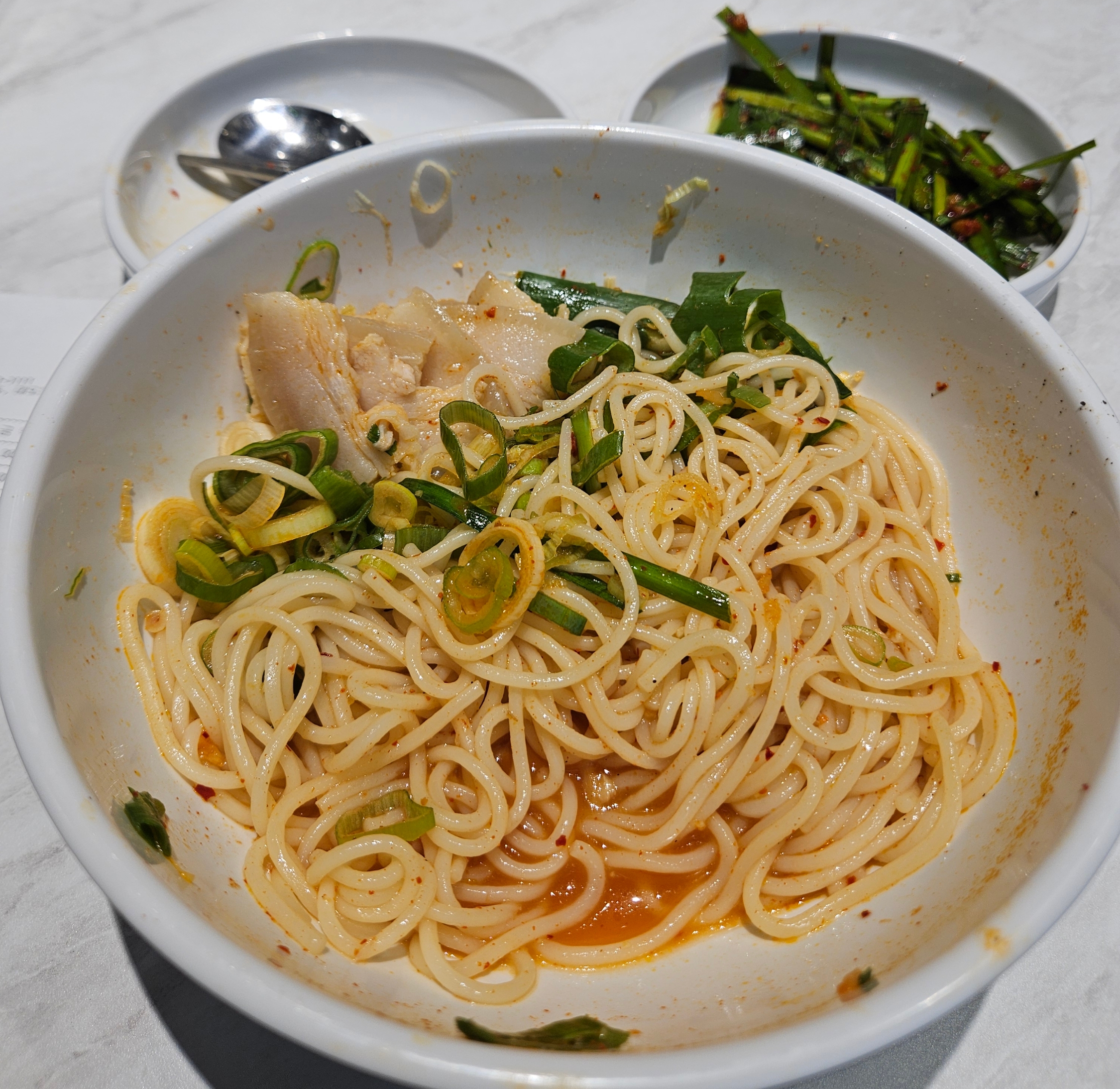 국물은 간이 안된 고기육수 그대로에 면발은 중면 대파는 억센 느낌으로 투박하게 잔뜩 넣어줬다.