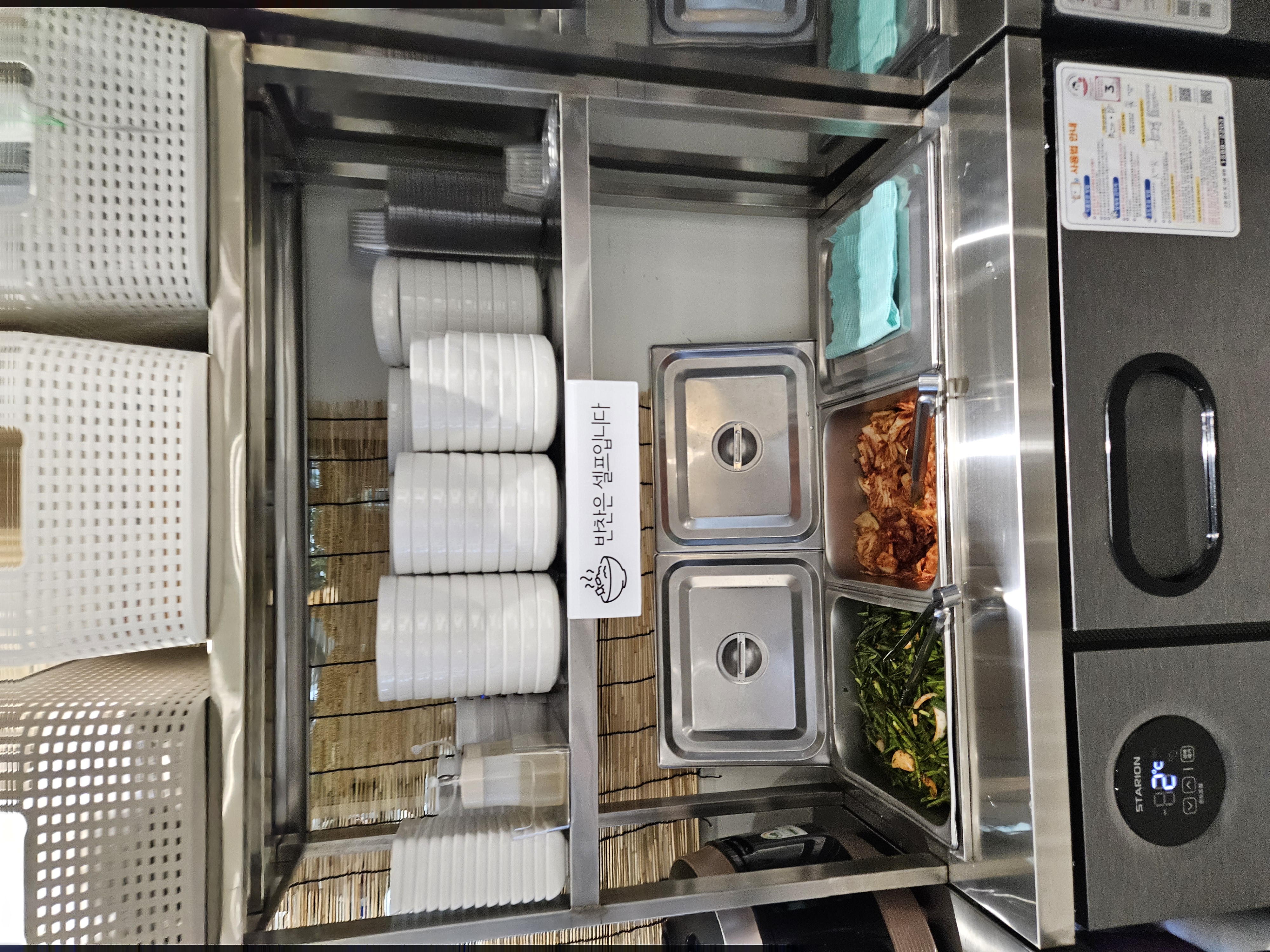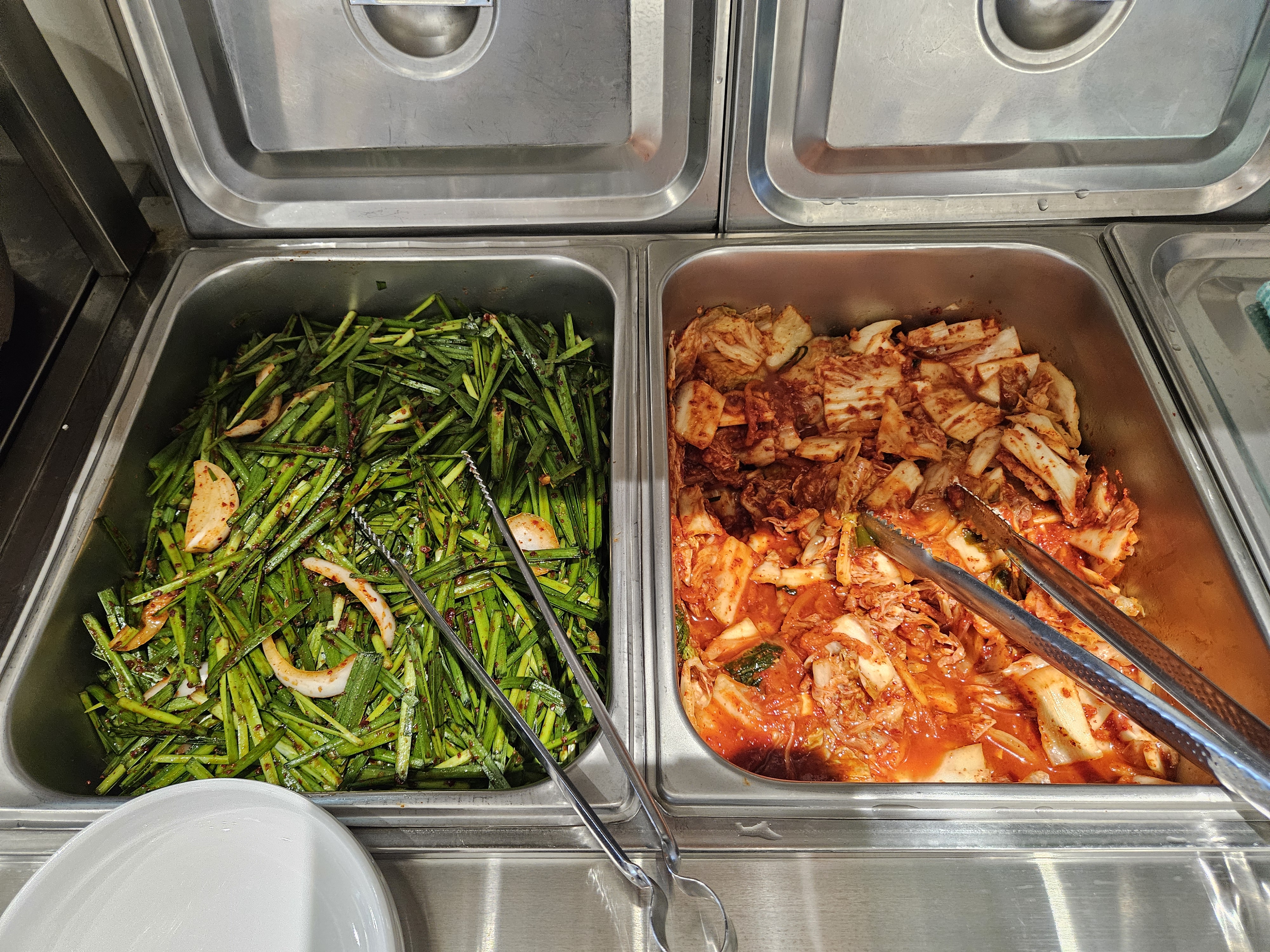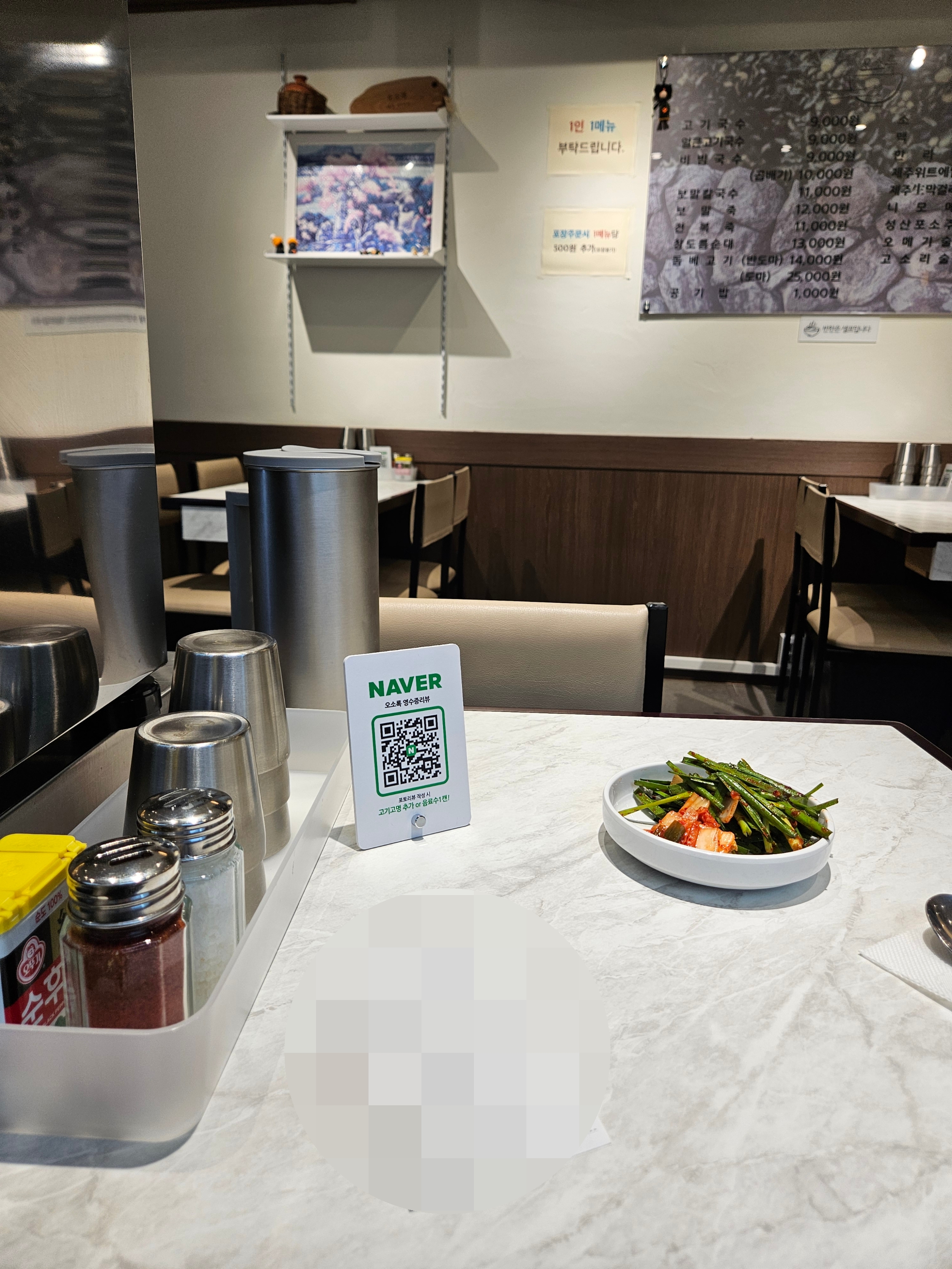 테이블마다 소금 후추 고춧가루 비치되어 있고 반찬은 두 가지(부추무침, 배추김치) 셀프 이용. 셀프바에 식초도 있는 거 같다.