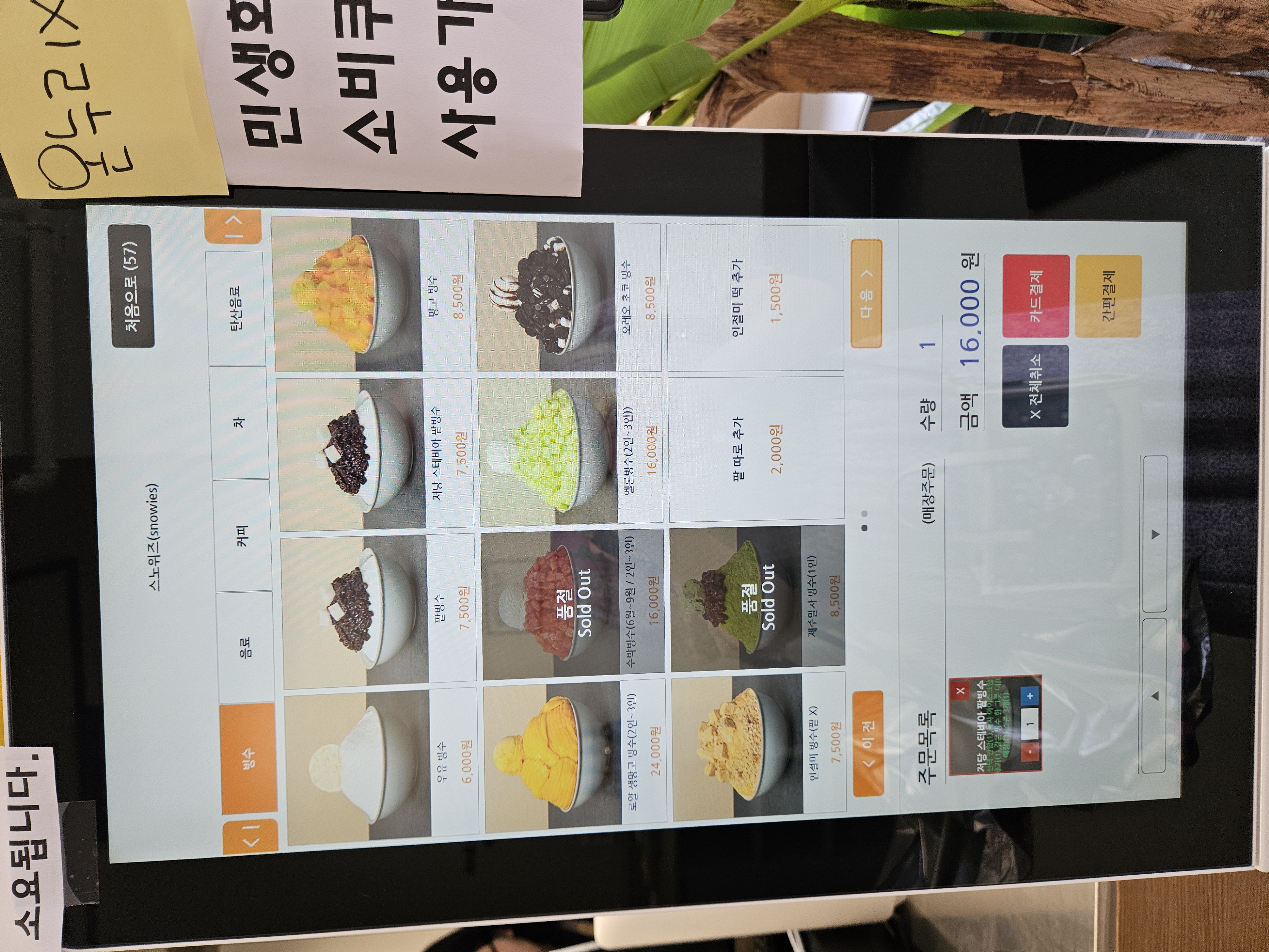 메뉴 중에 모둠 과일 빙수가 있길래 주문할 생각으로 가서 메뉴 봤더니 모둠 과일 빙수 메뉴는 없었고 대신 망고, 수박, 멜론 빙수가 있었는데 수박 빙수는 품절이었다.
