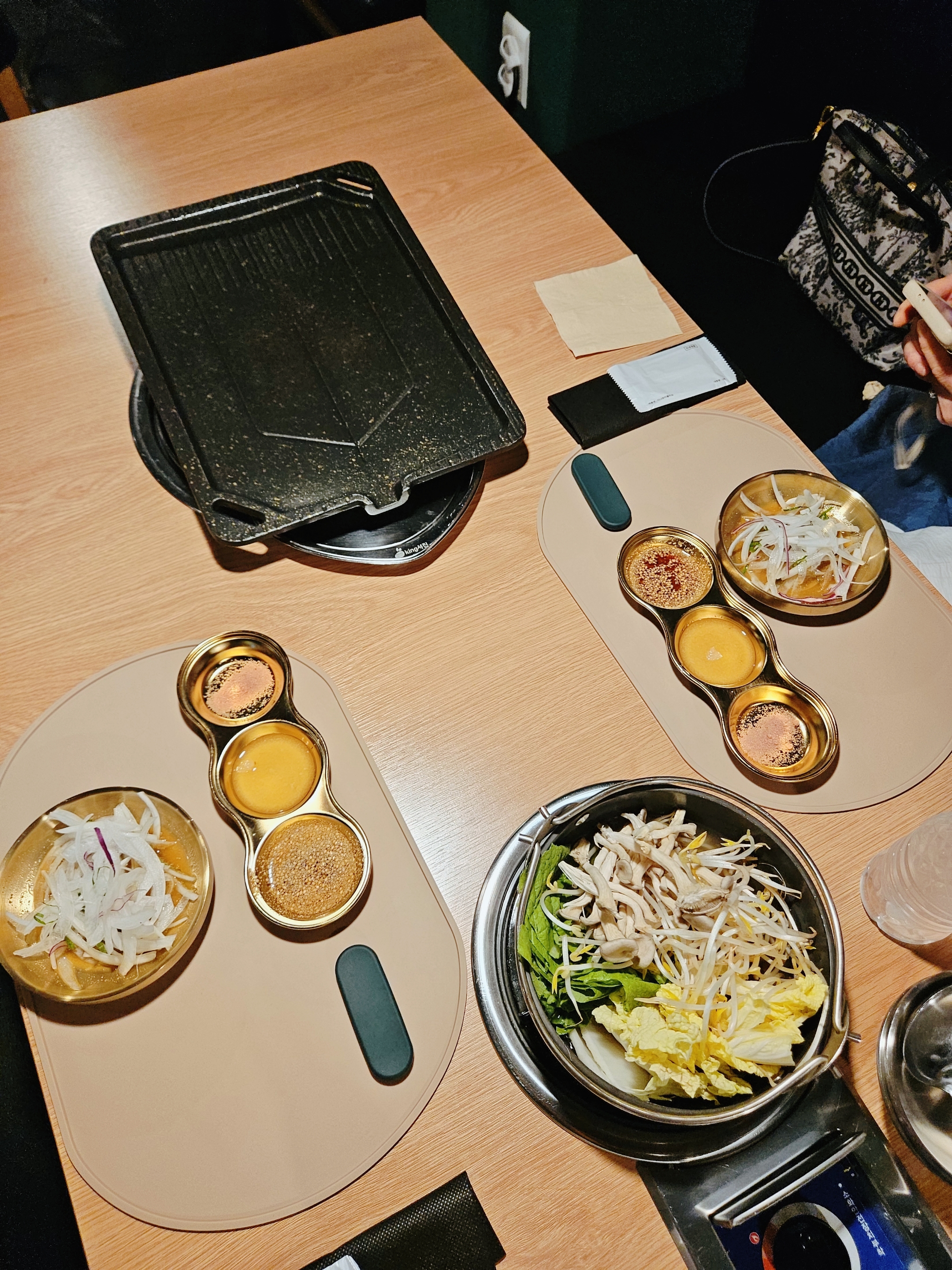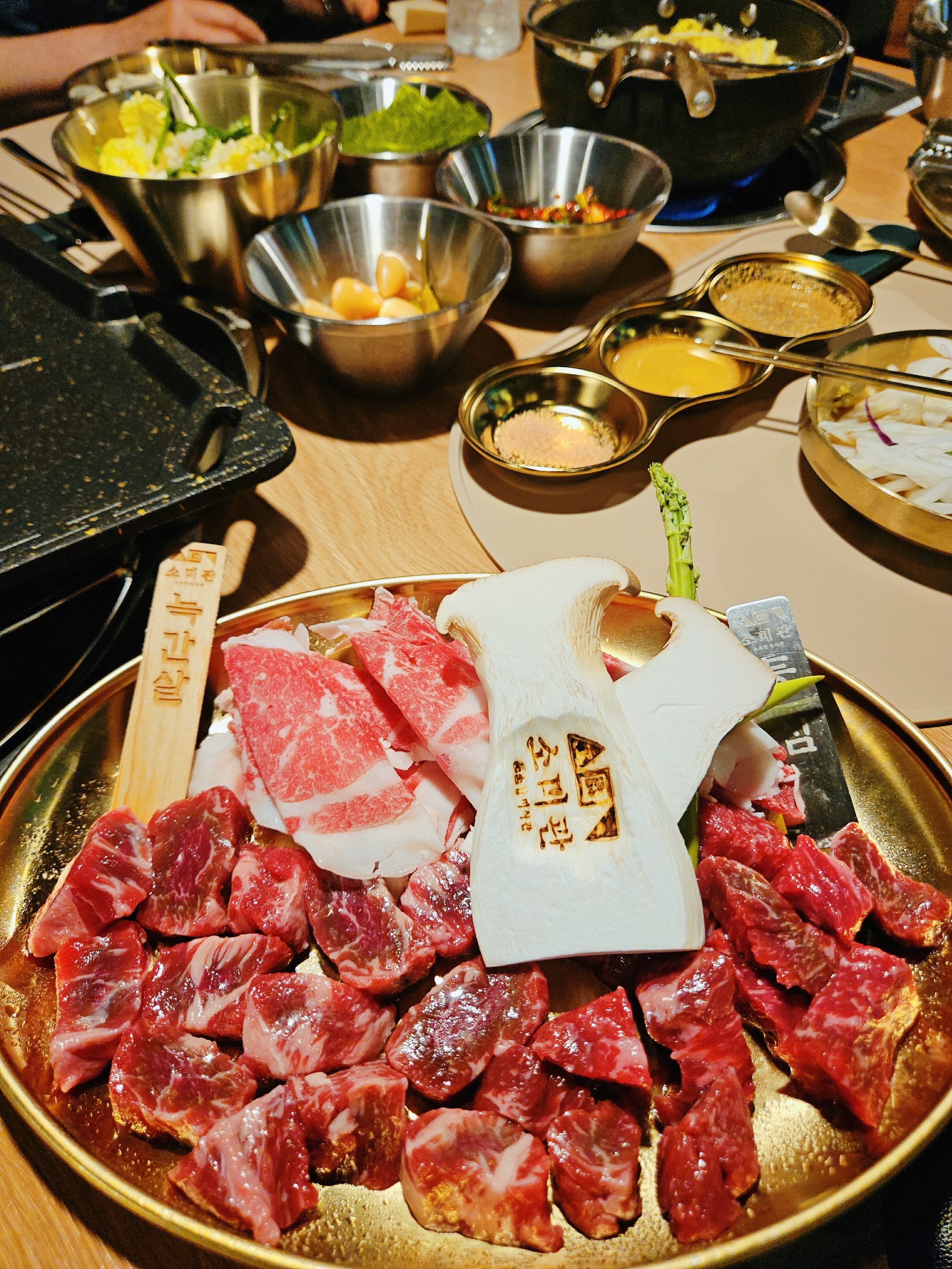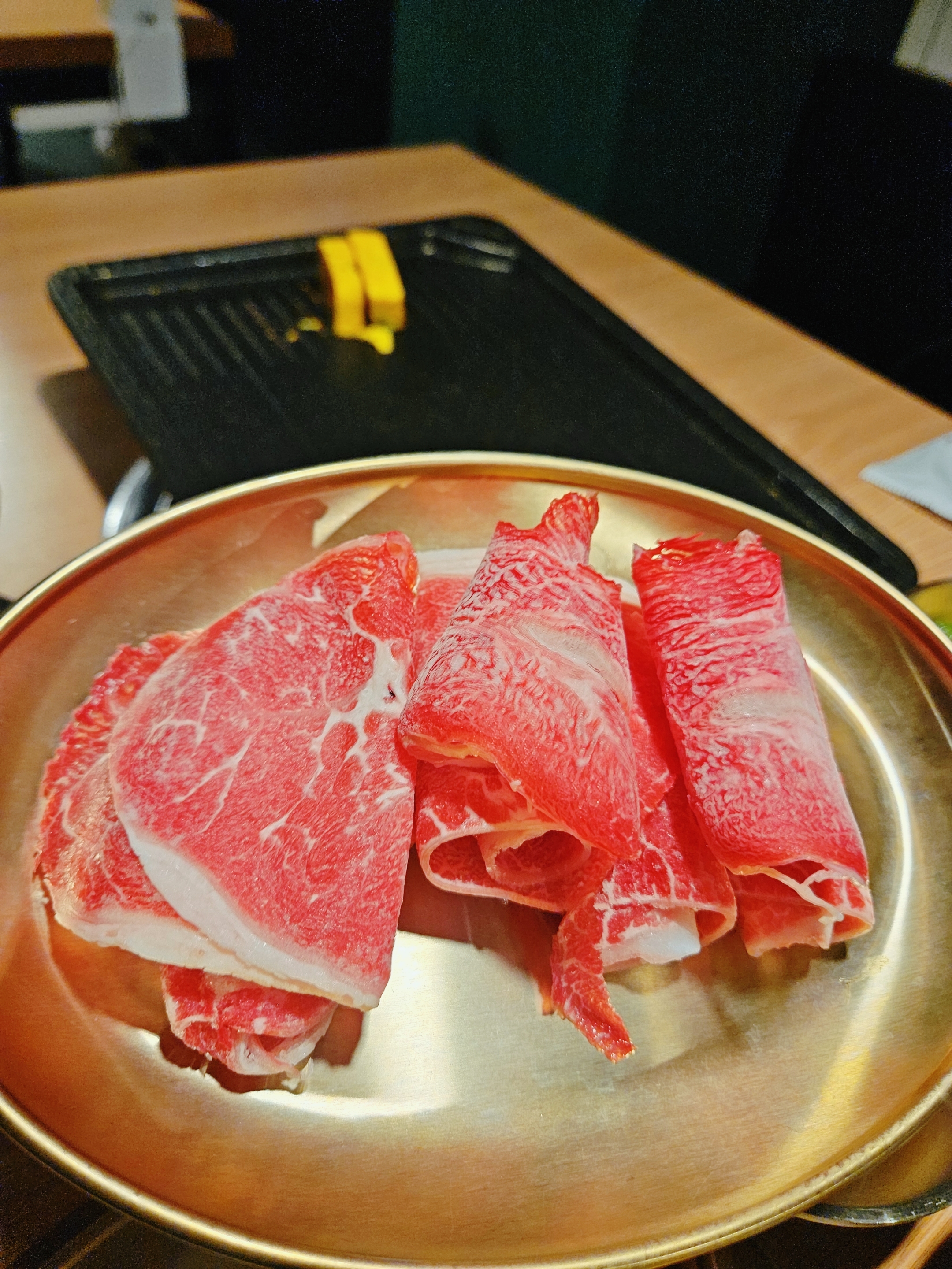 한우를 주문하니 채소 가득담긴 샤브샤브 육수 베이스가 나왔는데 샤브용 등심? 목심?도 서비스로 나오니 샤브샤브와 구이류를 한 번에 즐길 수 있었다.