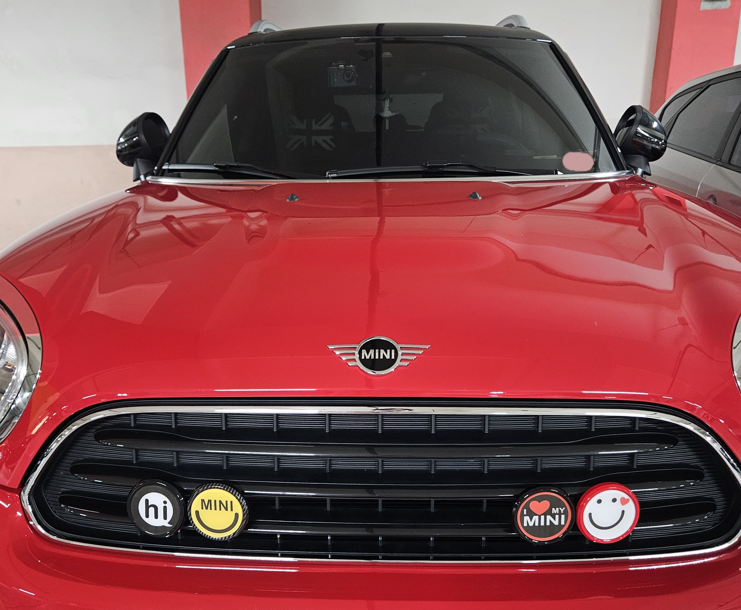 아직도 진행 중인 미니쿠퍼 컨트리맨 꾸미기를 위해 차량용품 액세서리로 고뱃지, 데칼스티커, 주유구 스티커, 야광 스티커, 컵홀더 트레이, 브레이크 등 스티커, 발판 스티커, 극세사 캐릭터 수