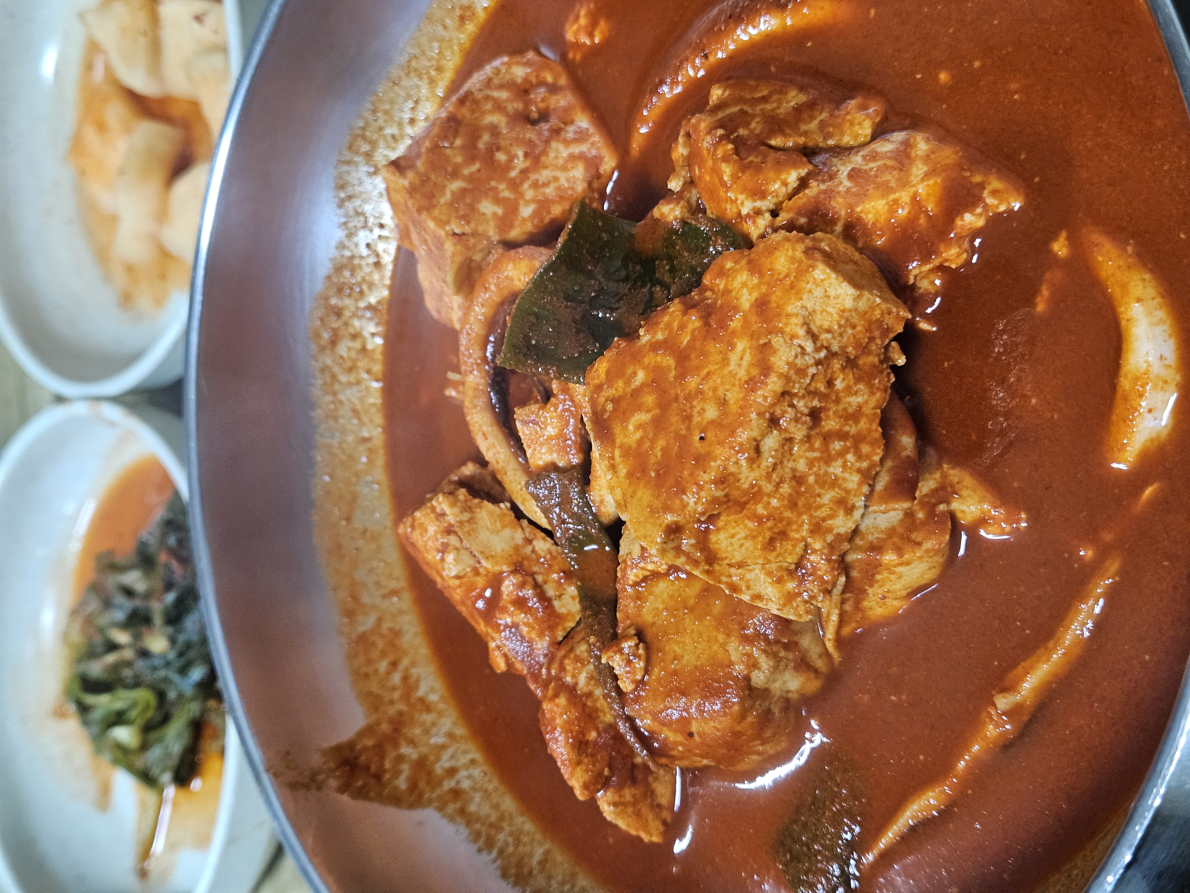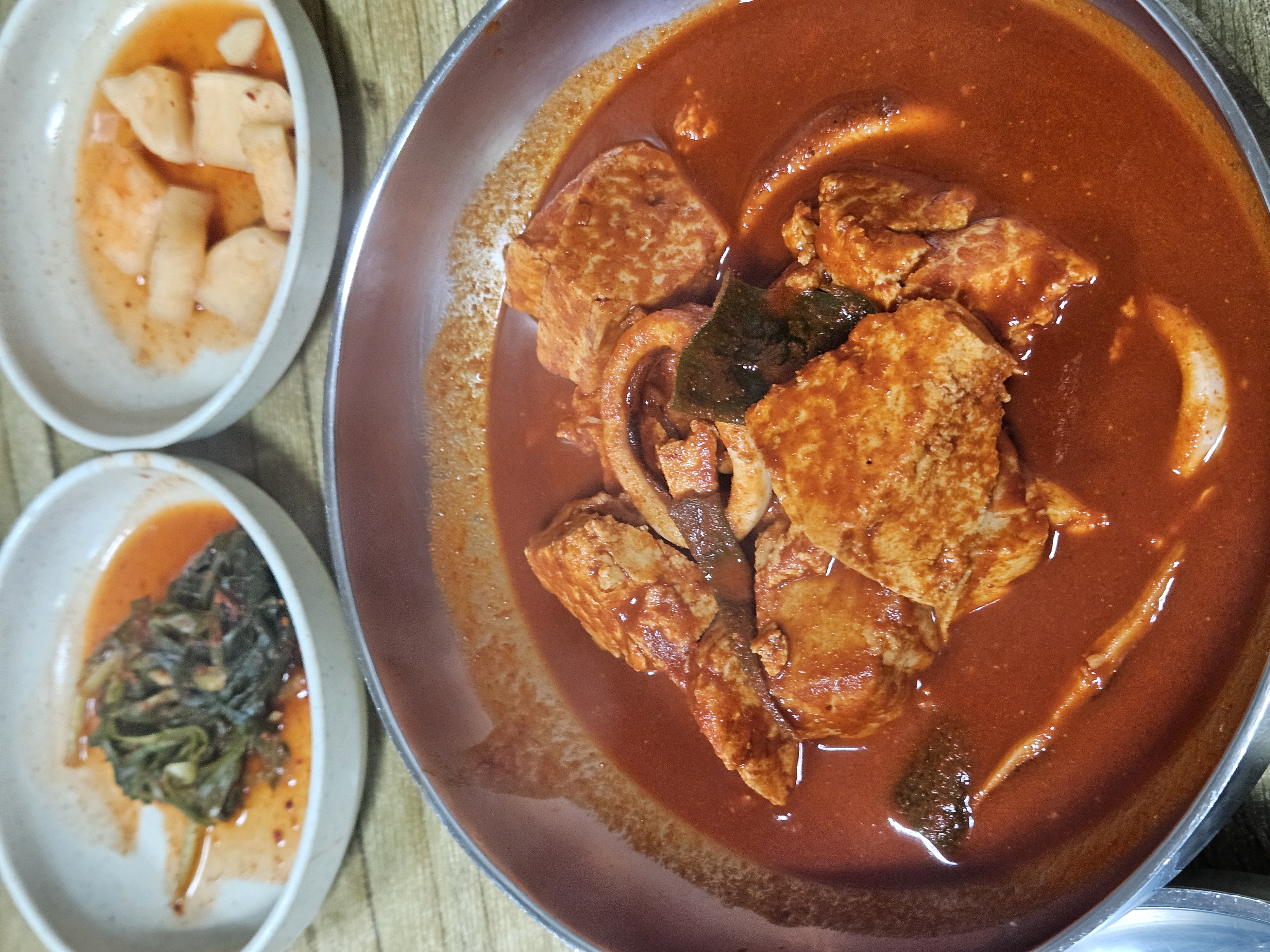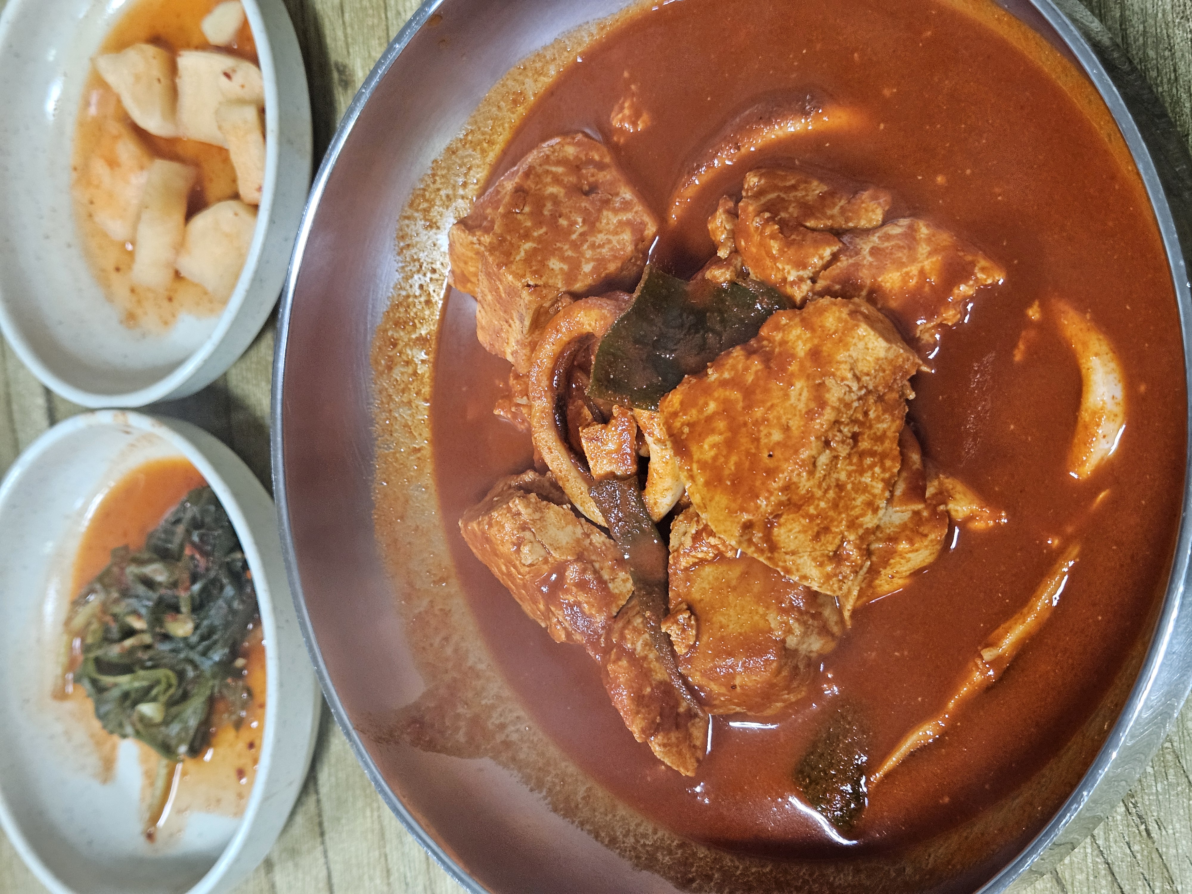 먼저 고춧가루 양념 육수가 가득 담긴 두부 오징어 두루치기 제공. 큼지막한 덩어리로 정형화되지 않은 사이즈로 투박하게 으깬 두부와 오징어, 대파가 들어있다.