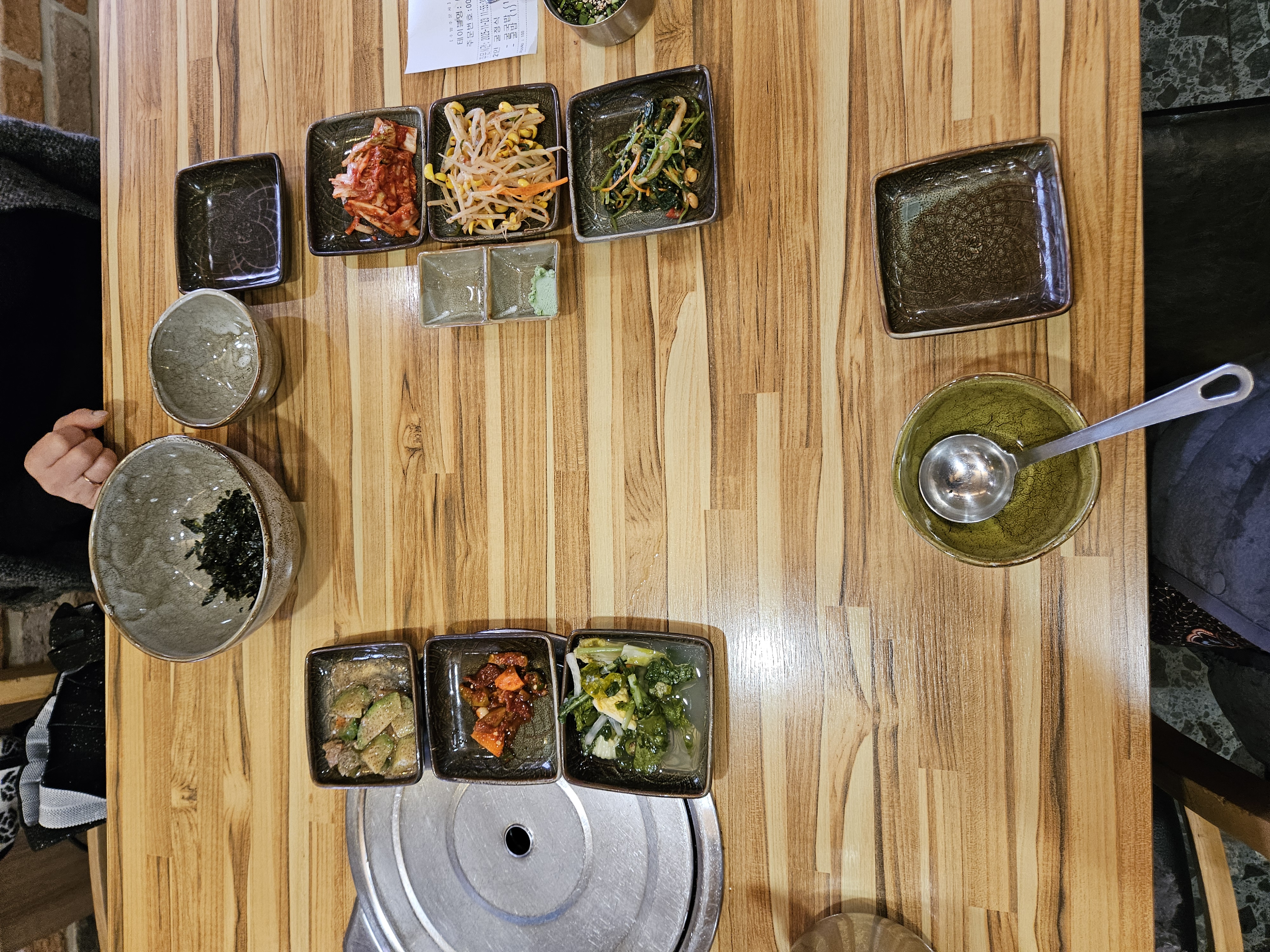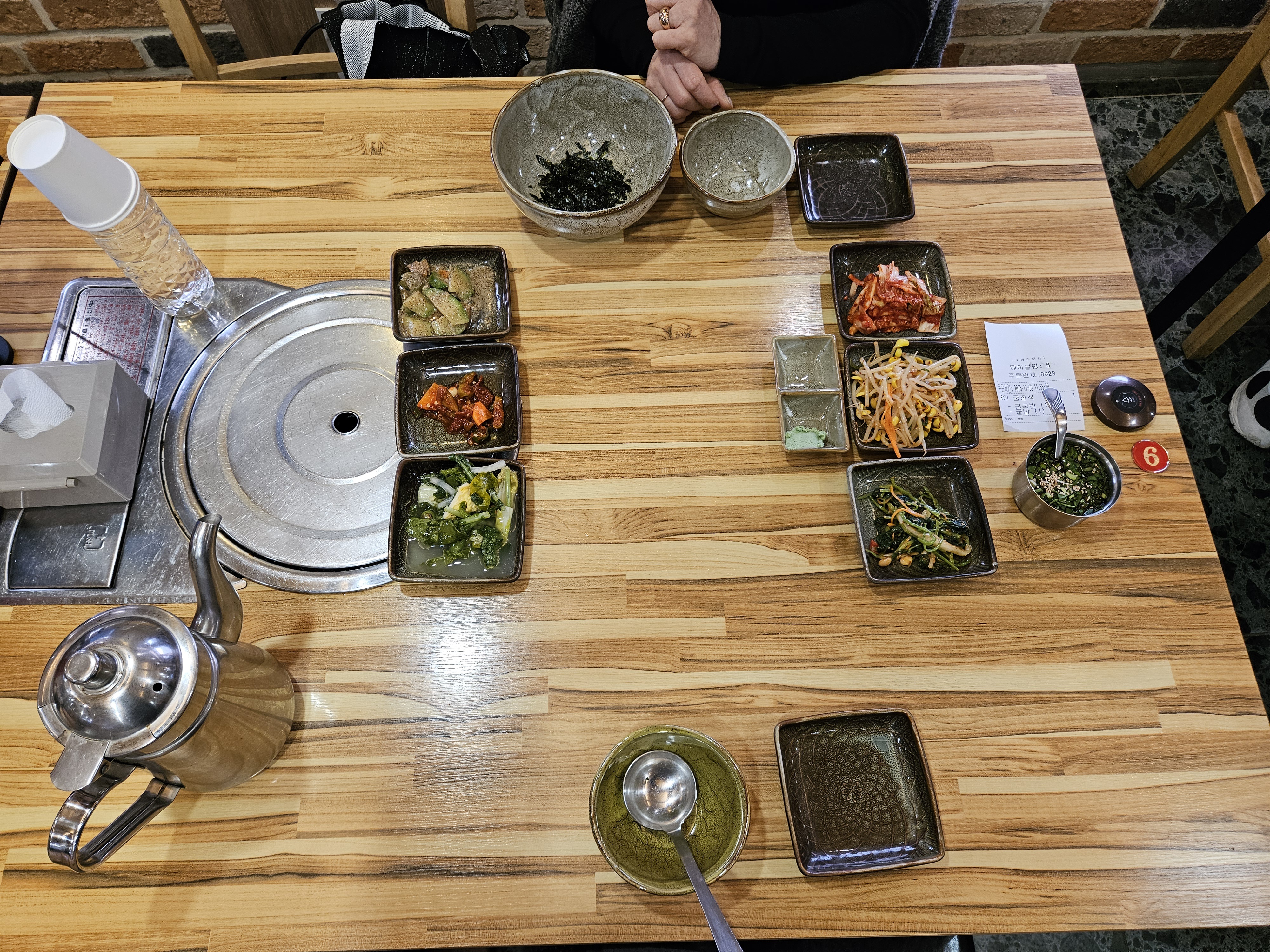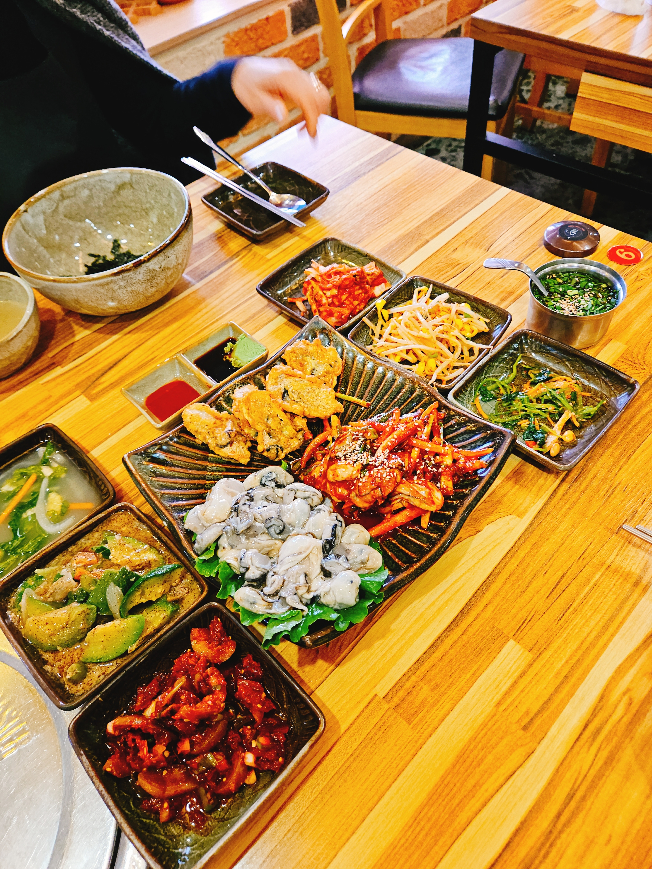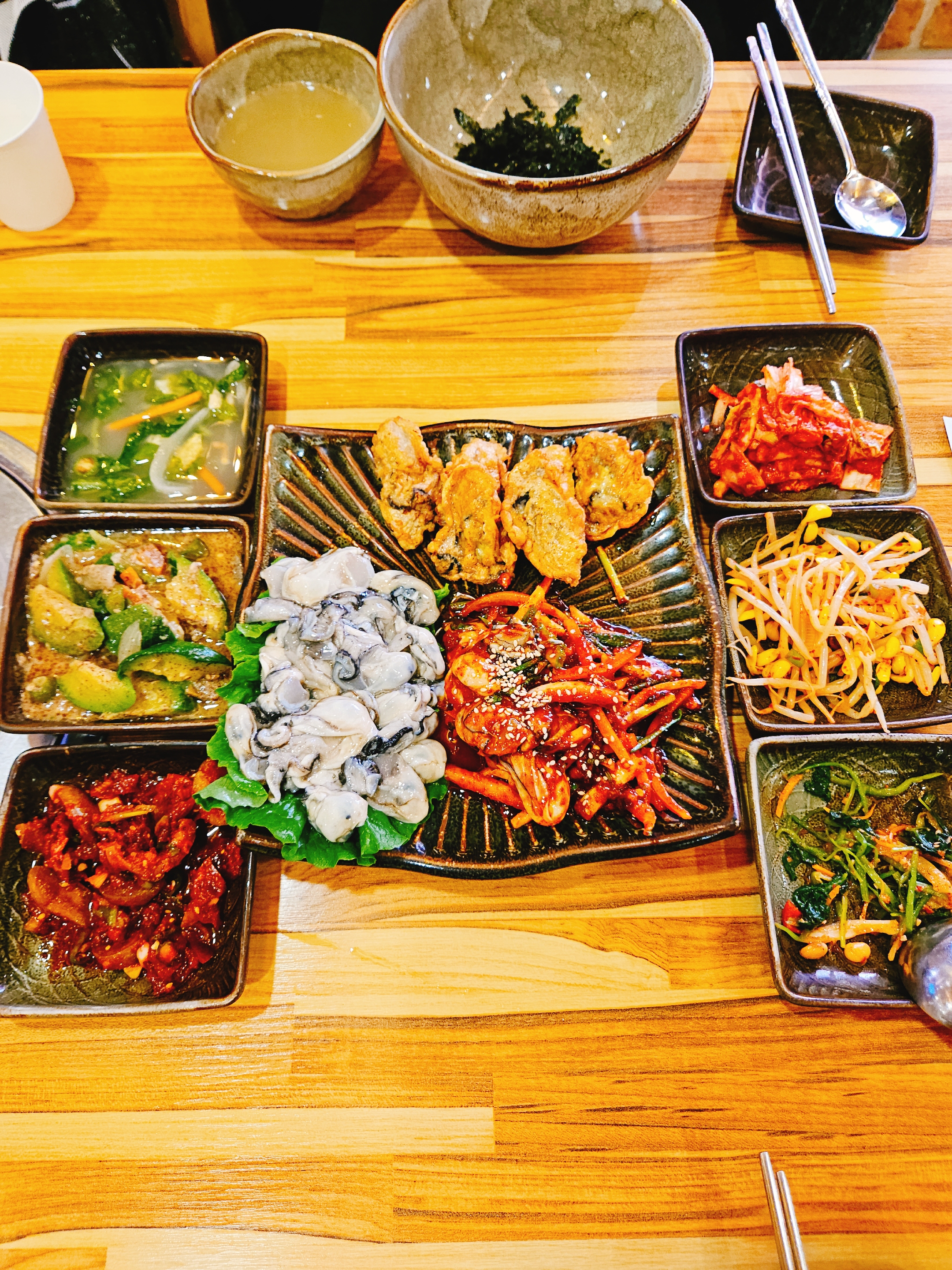 6가지 기본찬(애호박 볶음, 매실 장아찌 무침, 물김치, 배추김치, 콩나물 무침, 비름나물 무침)에 간장과 초고추장 담을 와사비 담은 종지, 굴밥에 넣어 먹을 파간장과 황태육수도 나온다.