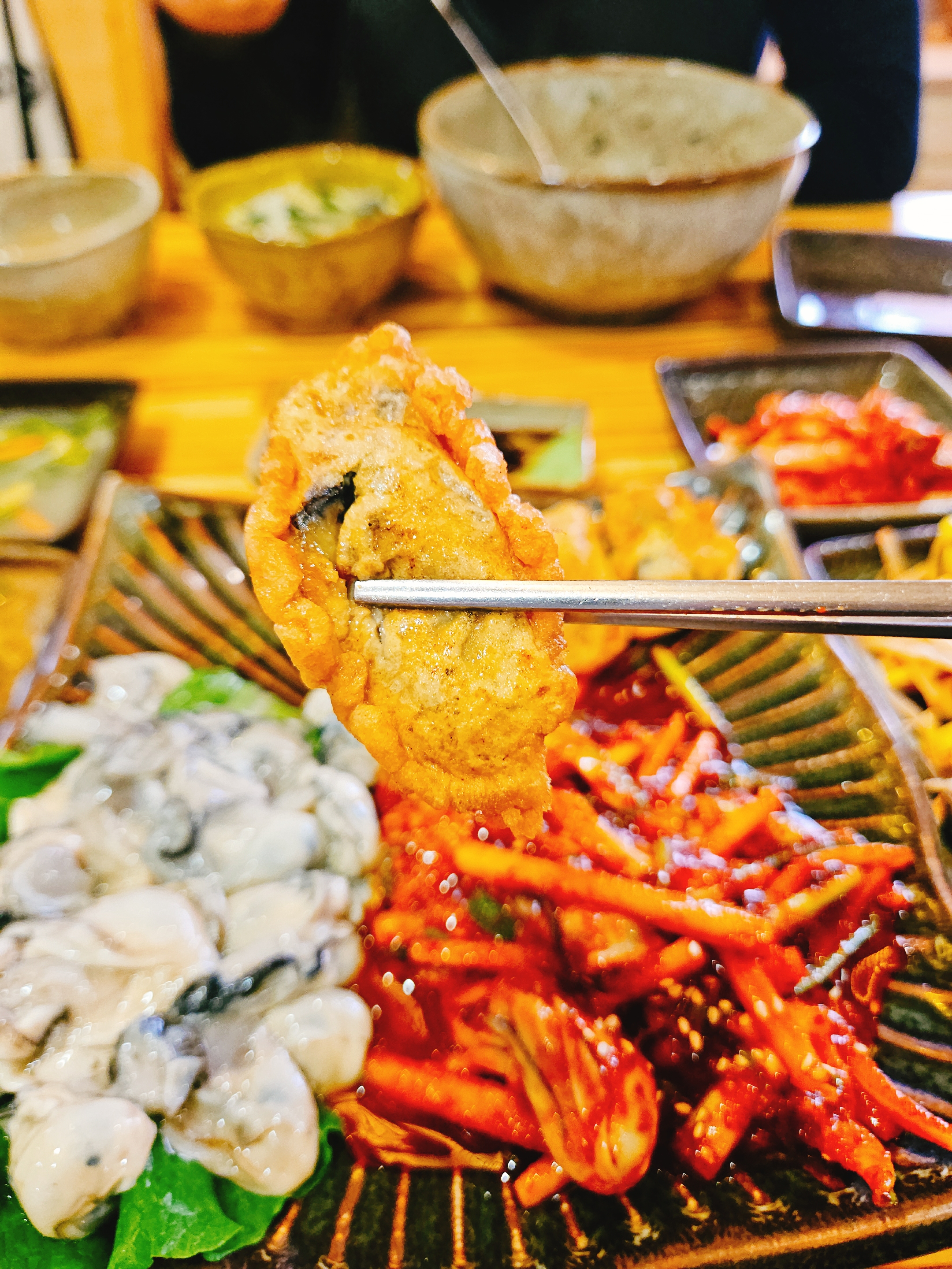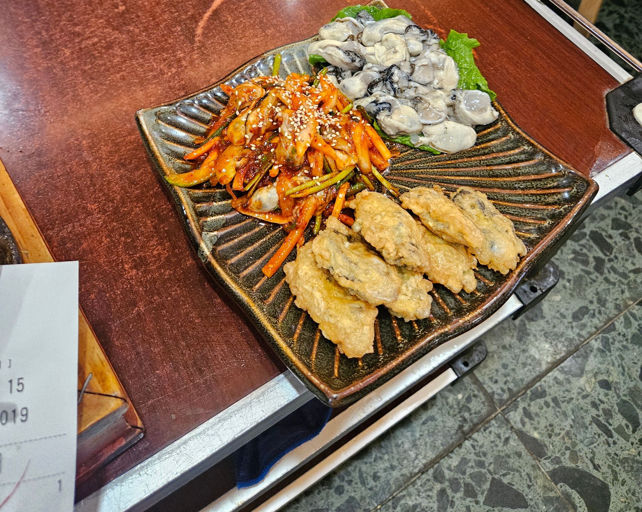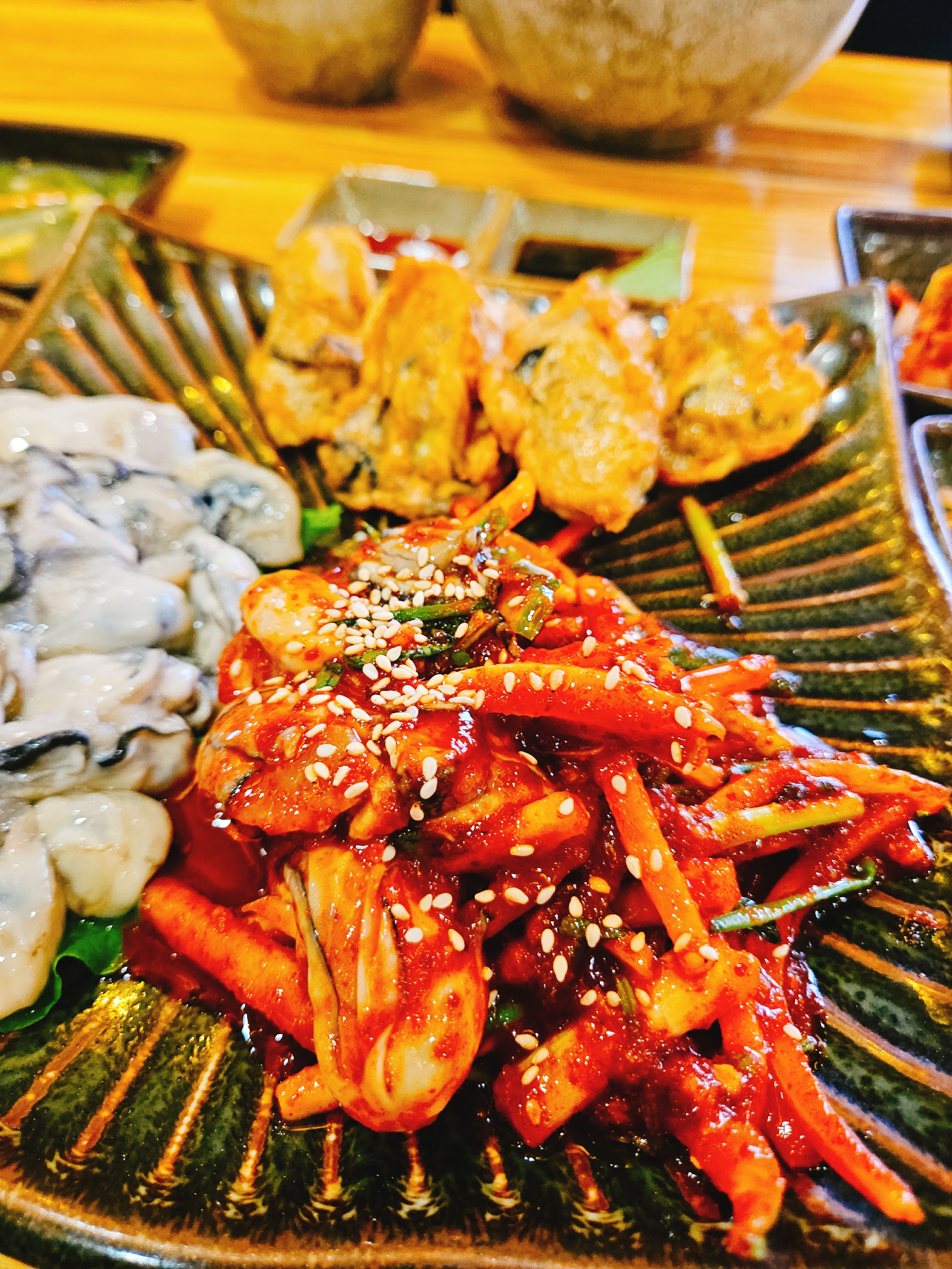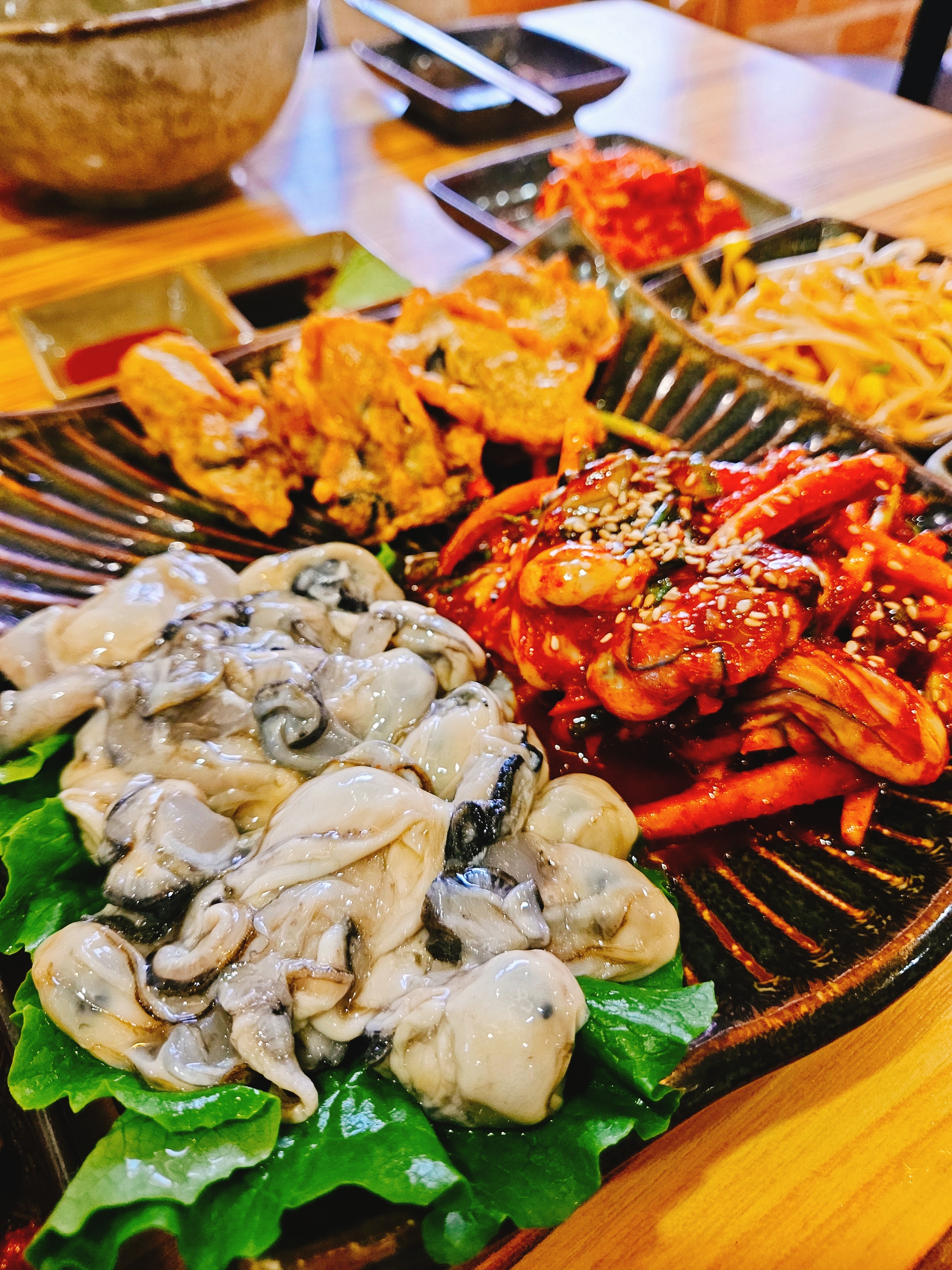 그리고 생굴회, 생굴 초무침, 굴전 한 접시가 나왔다. 생굴 양이 진짜 많아서 이 굴은 굴국밥에 넣어 건더기 엄청 많은 굴국밥으로도 즐기고, 생굴 초무침 양념, 채소와 같이 먹어도 꿀맛.