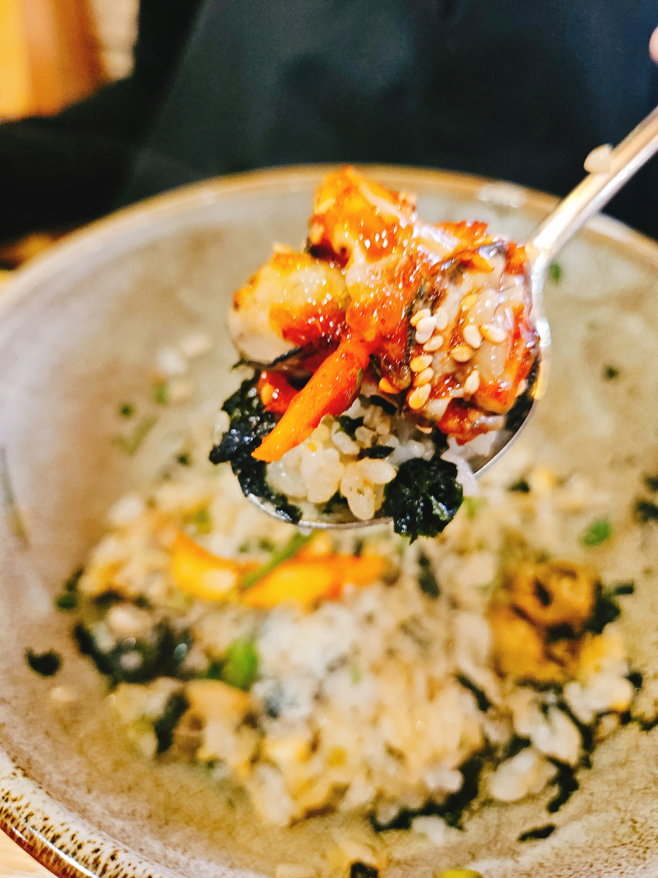 굴밥은 돌솥에 제공되는데 솥밥 뚜껑을 열면 굴이 가득 깔려있고 중앙에 날치알을 올려 아주 먹음직스러워 보인다.