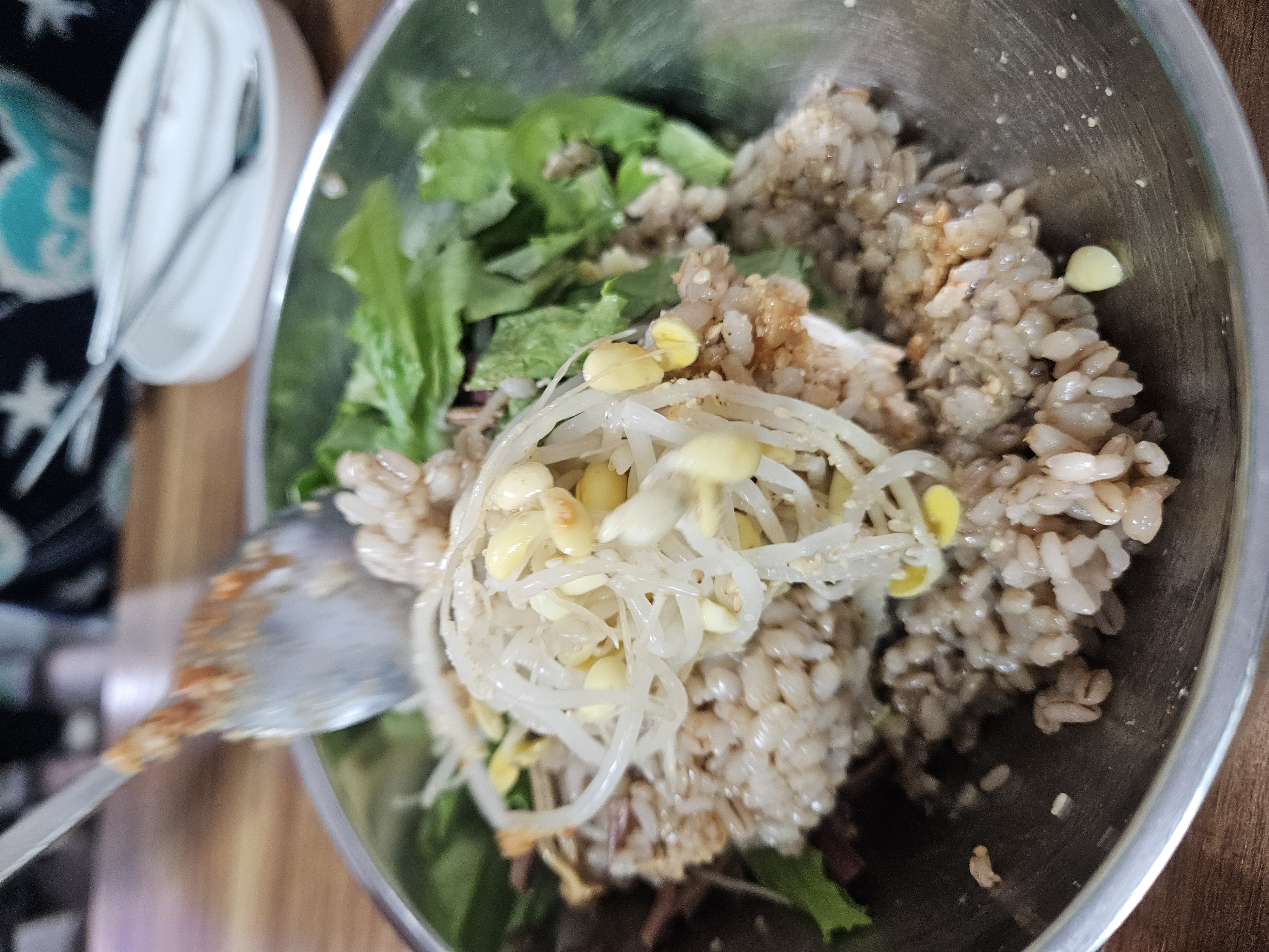 찰보리밥 위에 상추, 고사리, 콩나물, 참깨, 참기름을 아낌없이 담아주신다.