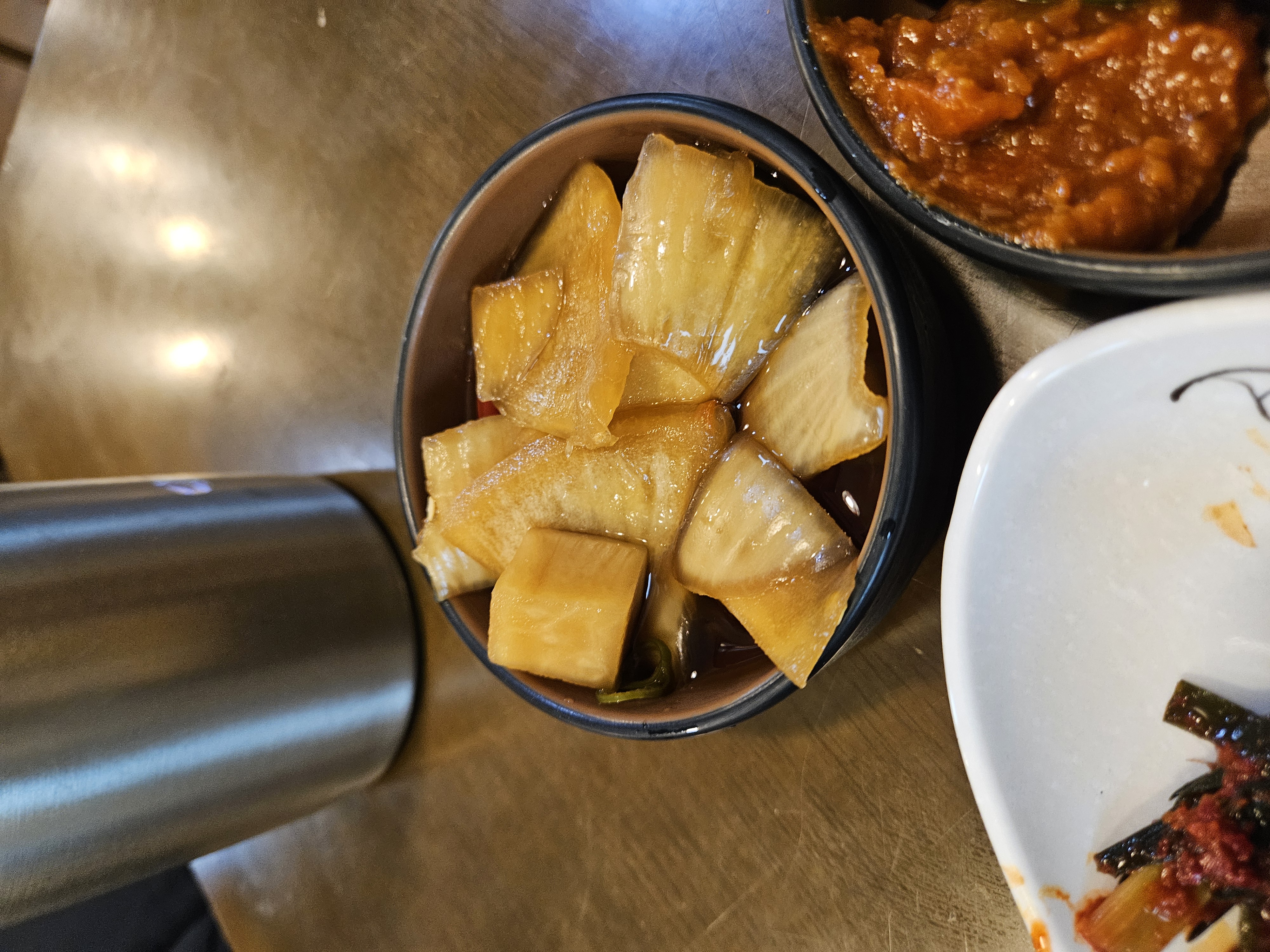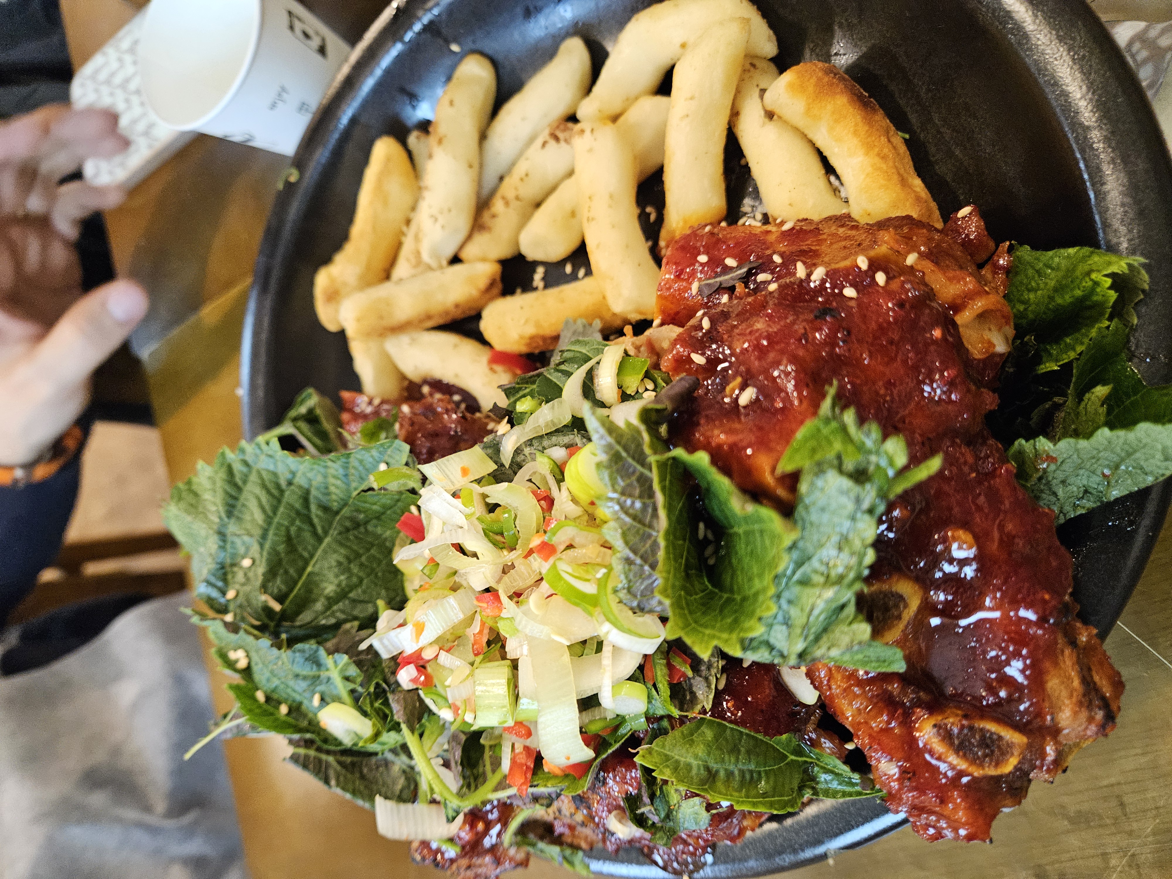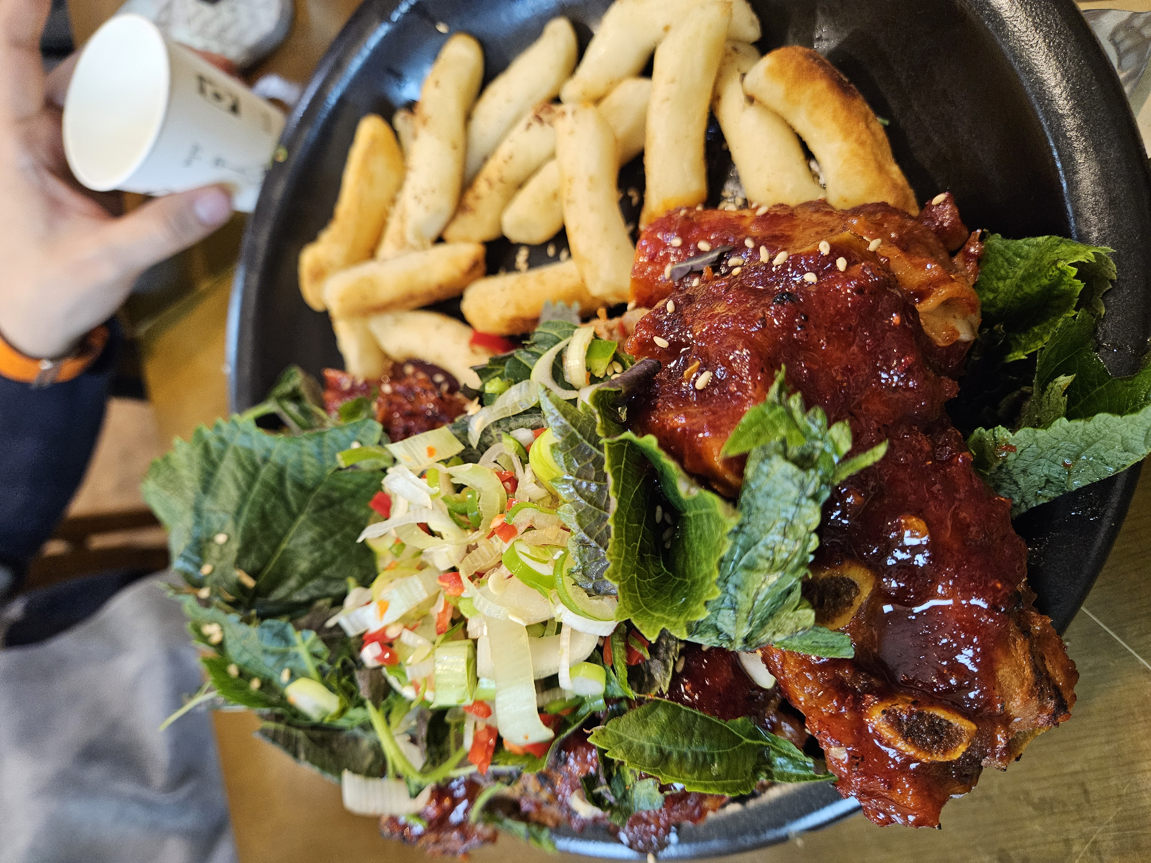 빨간 양념이 묵직하게 발린 등뼈가 항아리 뚜껑 위에 담겨 나와 비주얼부터 확실히 시선을 끈다.