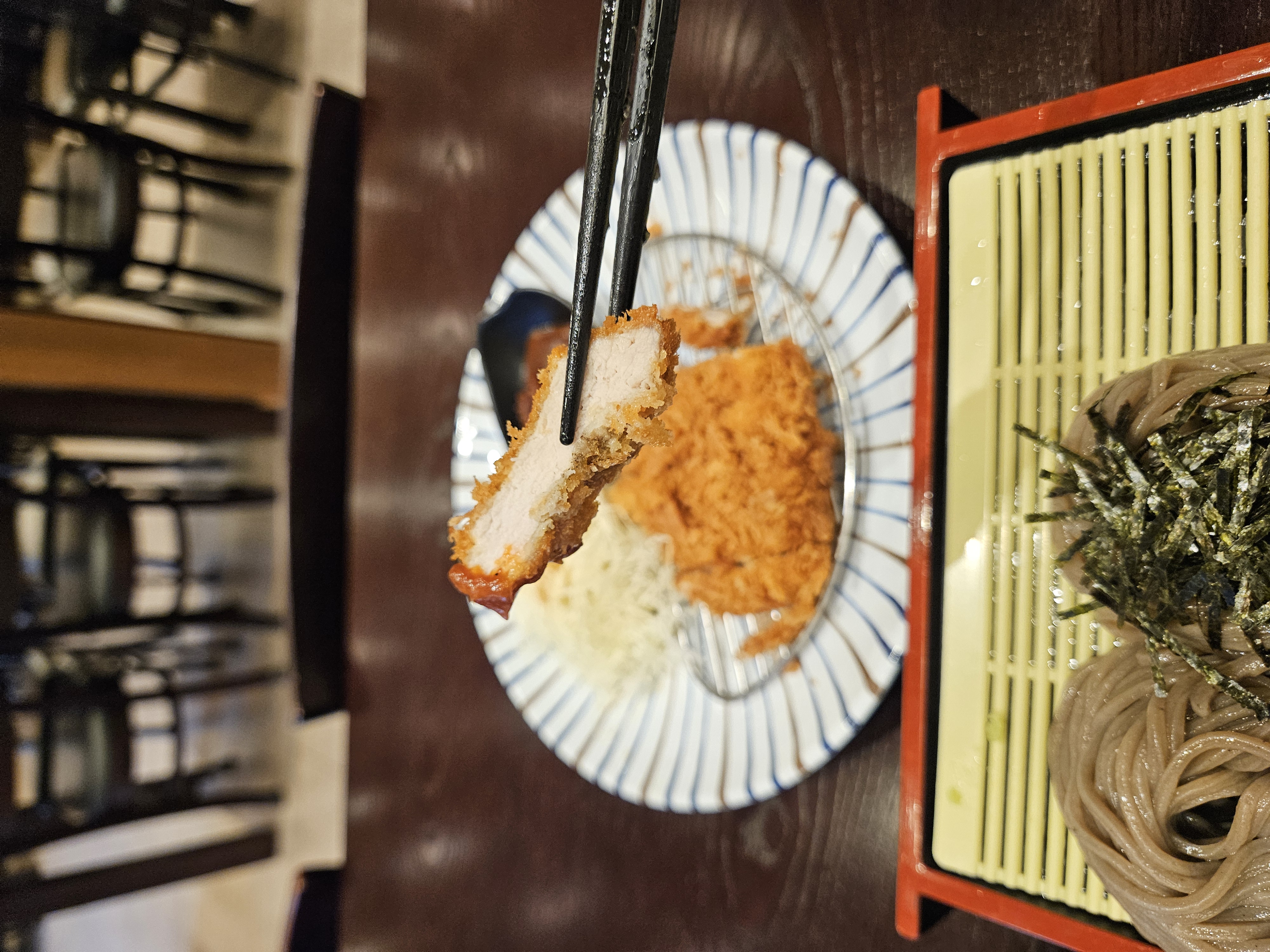 바삭하게 튀겨진 돈가스를 한 점 집어 소바와 같이 먹으면 내가 좋아하는 소바 + 돈가스 콤보 완성.