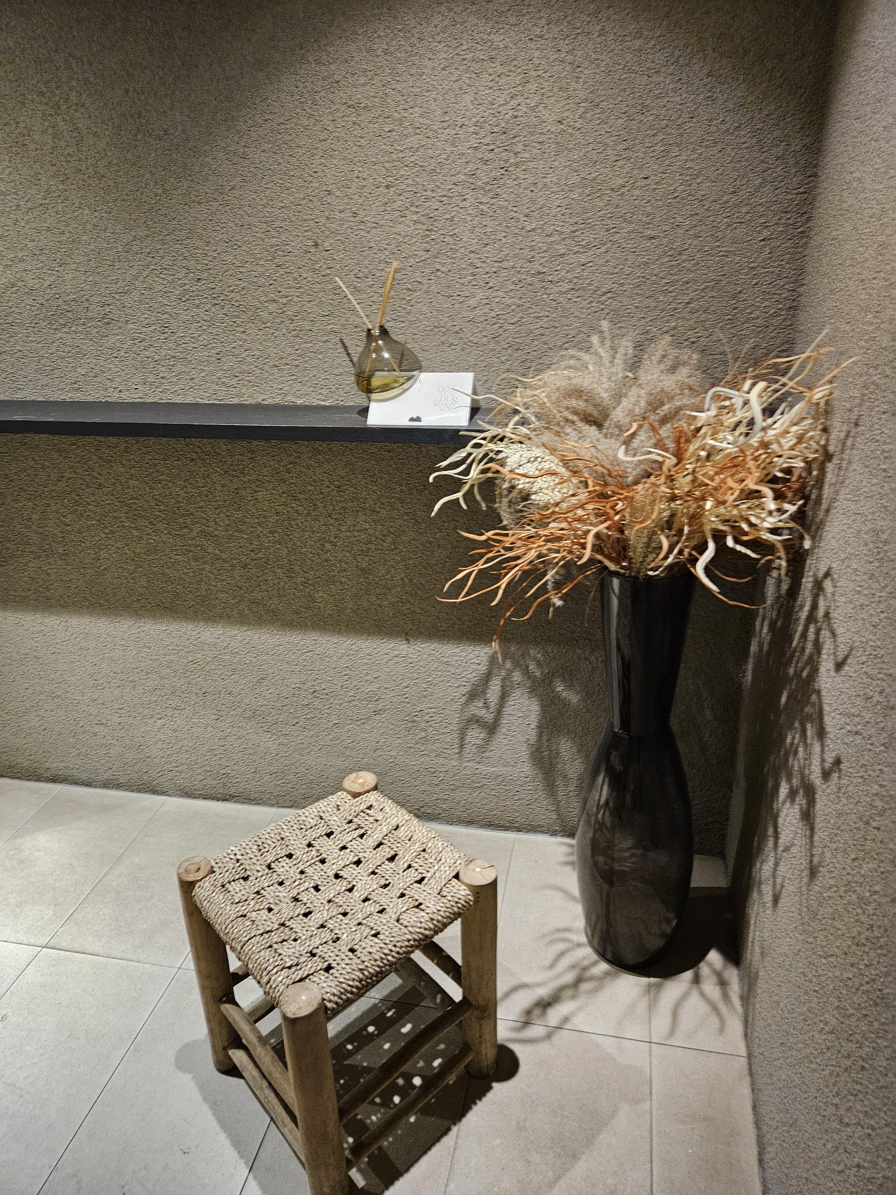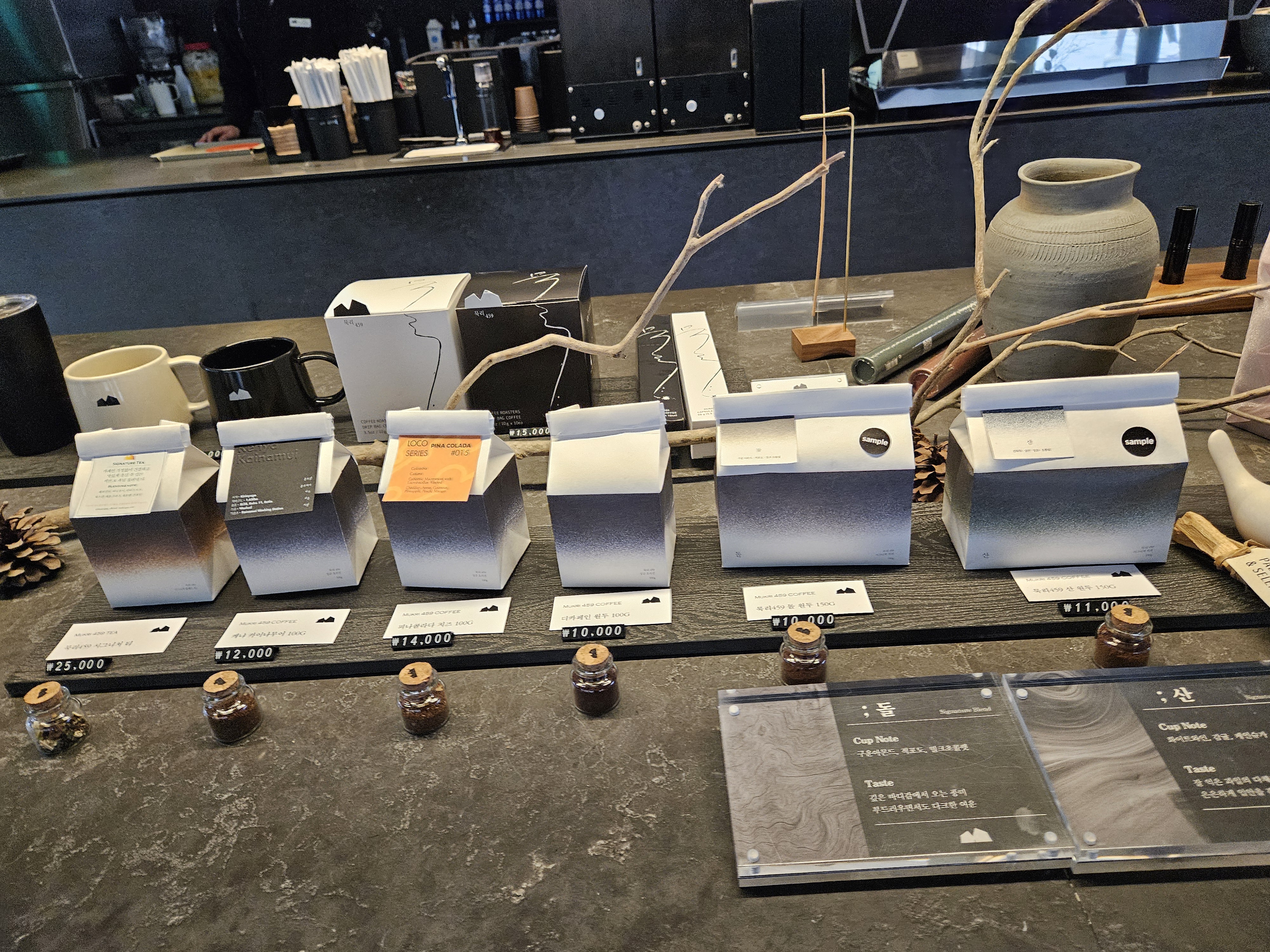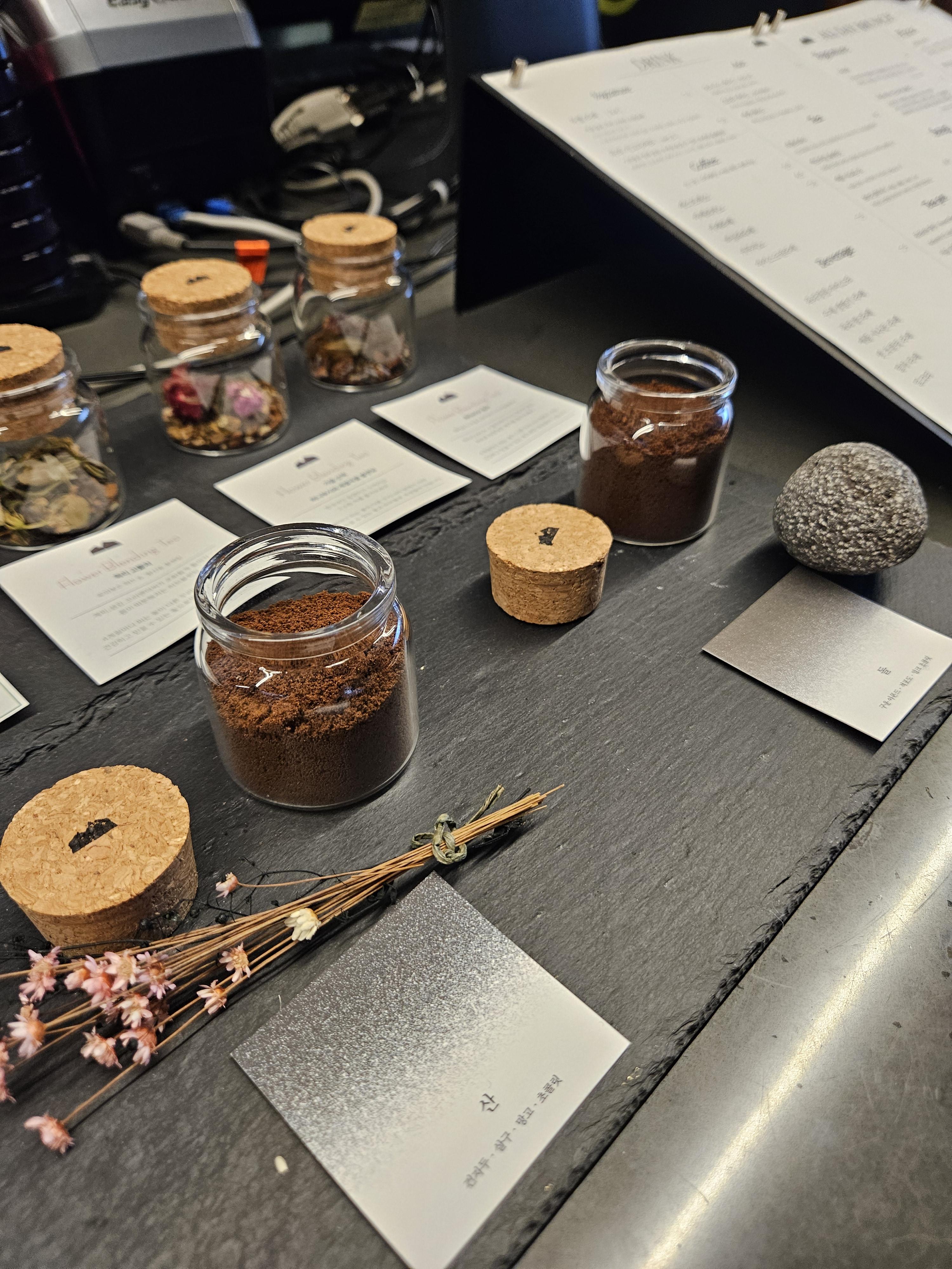 매장은 회전문을 밀면 카운터 겸 제조 공간 양쪽으로 공간이 나뉘어있다. 들어가서 우측엔 테이블과 의자가 있는 일반적인 스타일의 노멀 한 공간이고 왼쪽은 대형 너럭바위 벤치에 방석, 나무기둥을 낮게 잘라 테이블 용도로 사용할 수 있게 만든 조금은 불편하지만 멋스러운 공간으로 꾸며져 있었다.