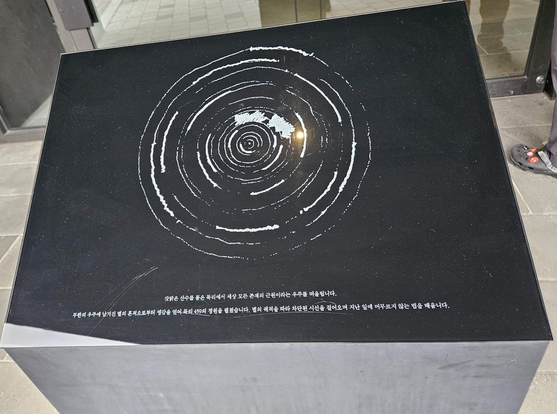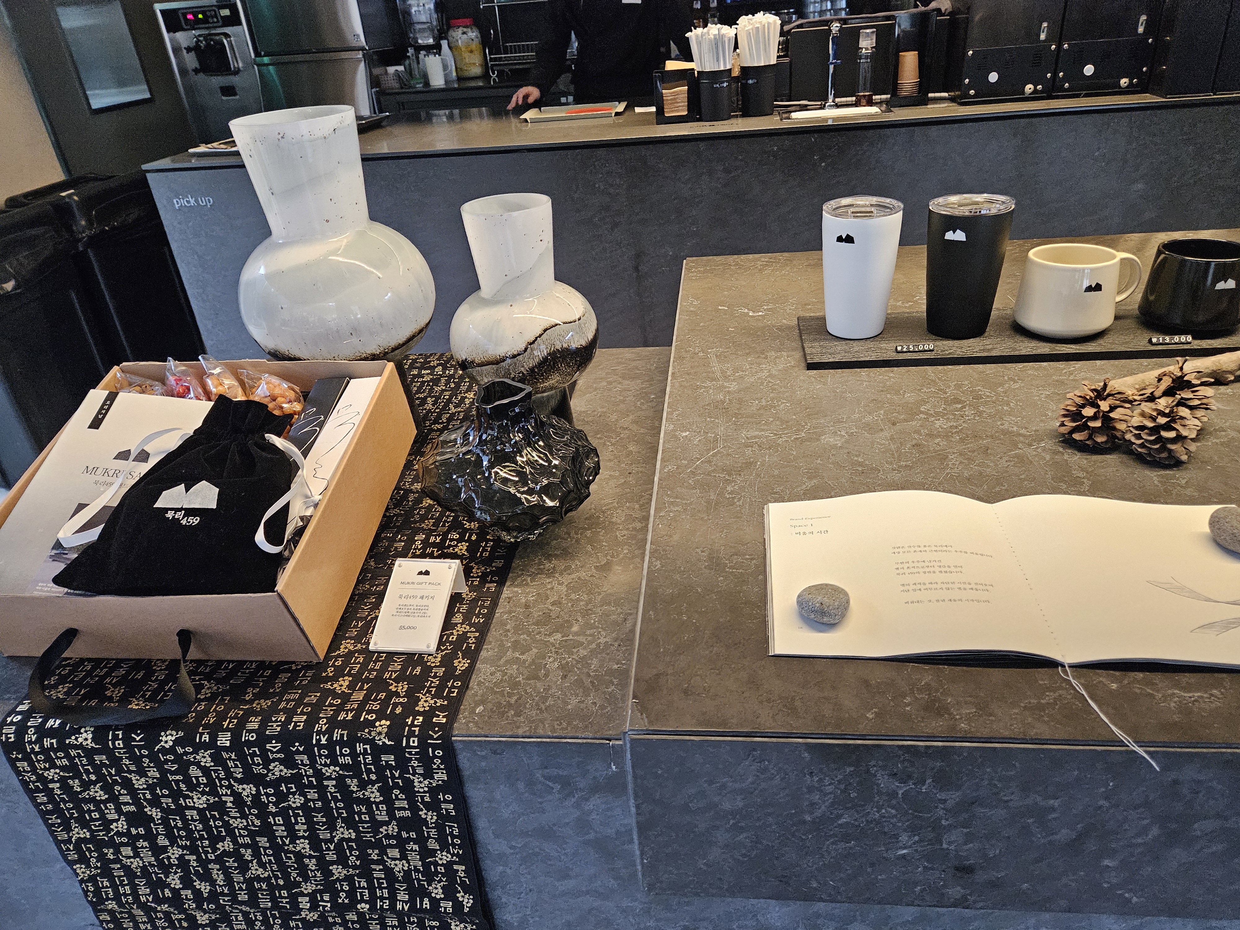 매장 안에 조형물과 여럿이 앉을 수 있는 벤치는 너럭바위로? 제작하여 먹의 농담이 빚어낸 산수화를 표현하고자 했나 보다.