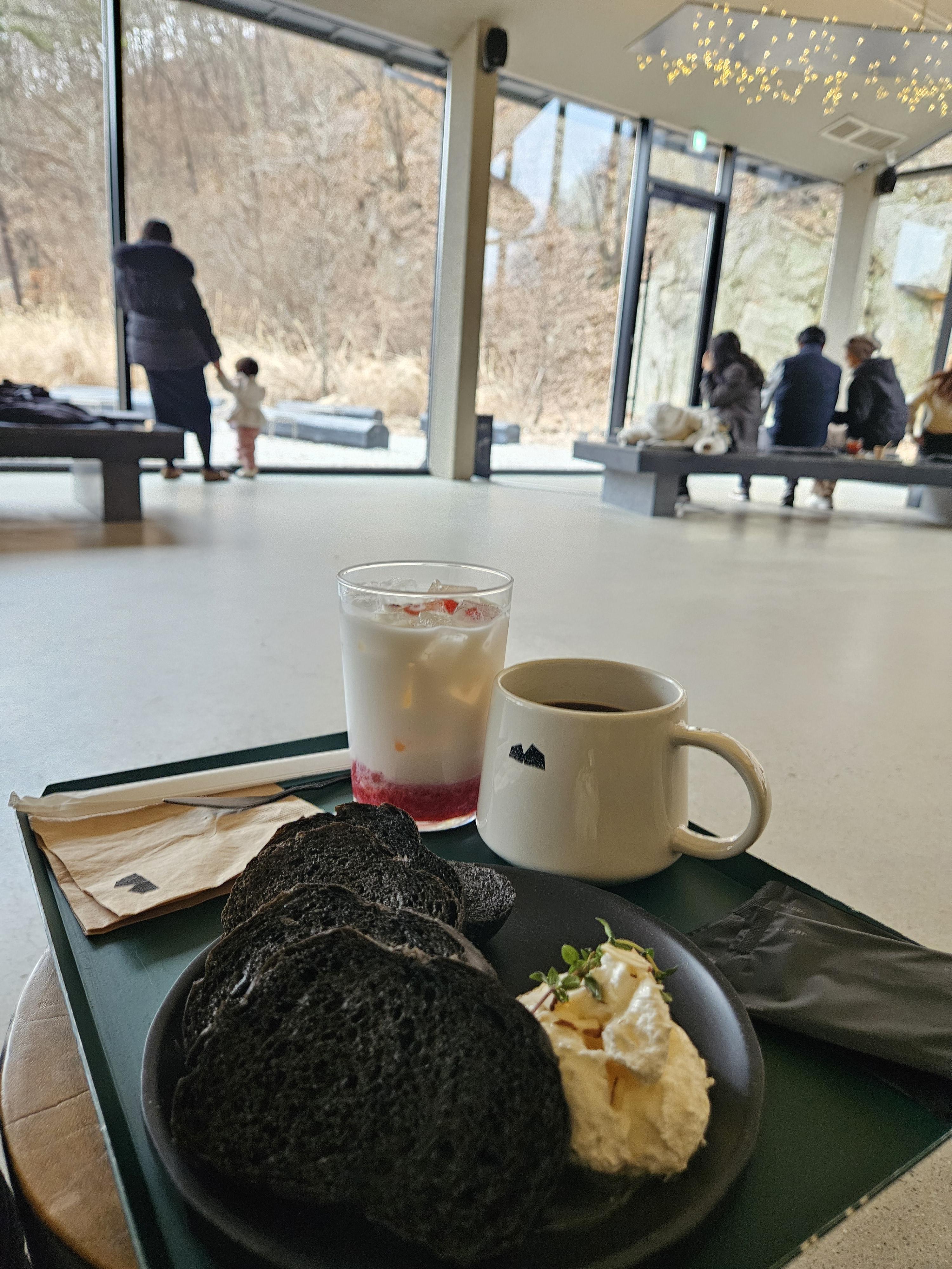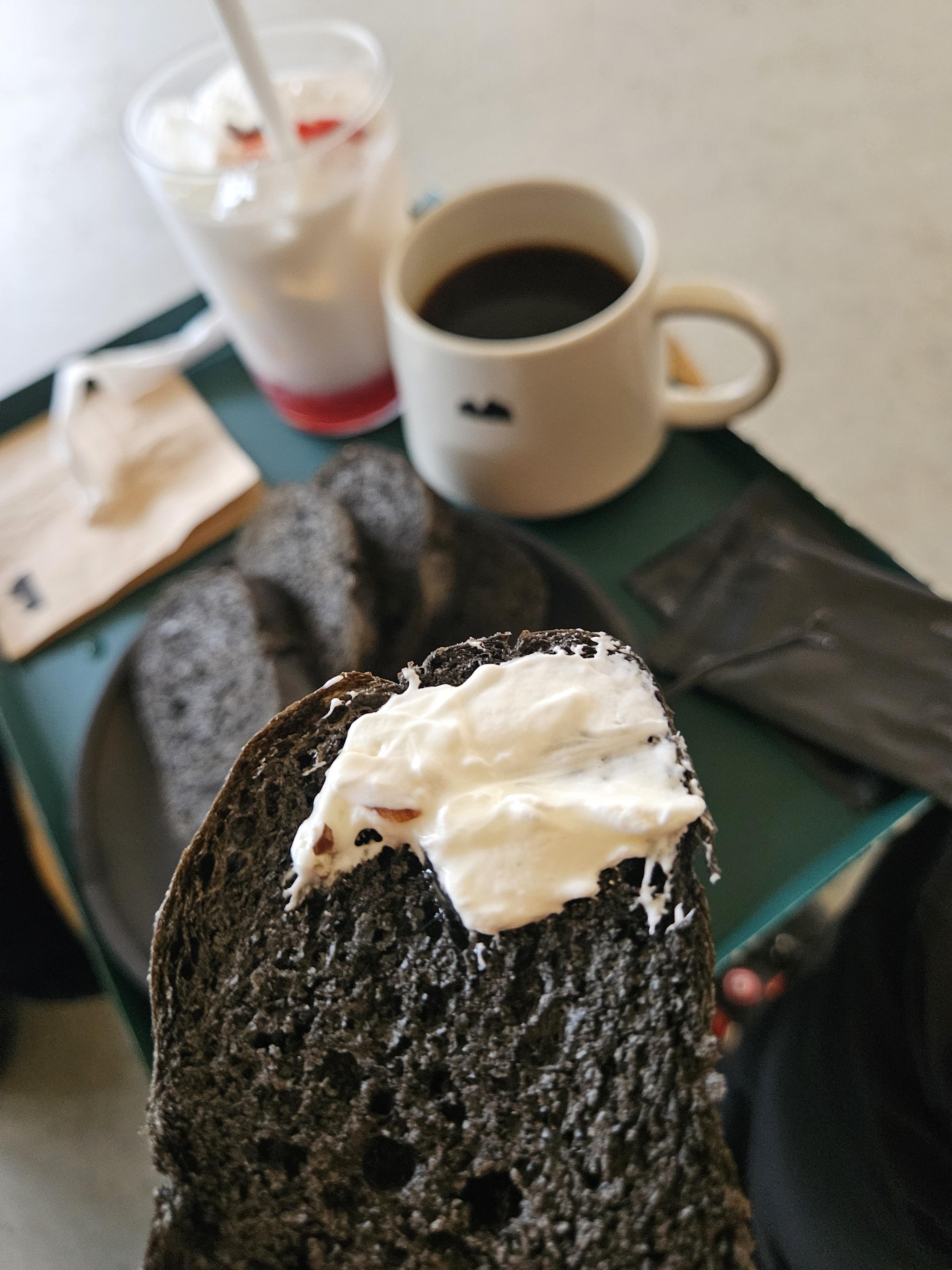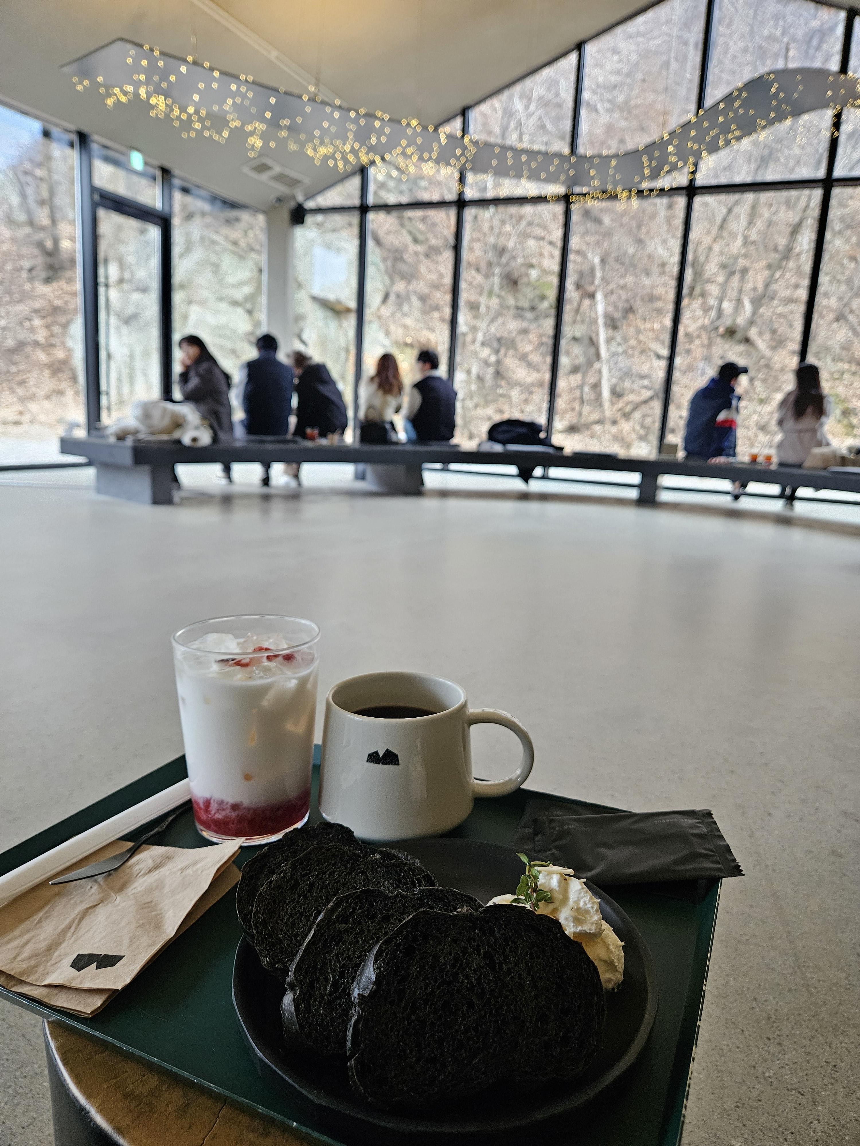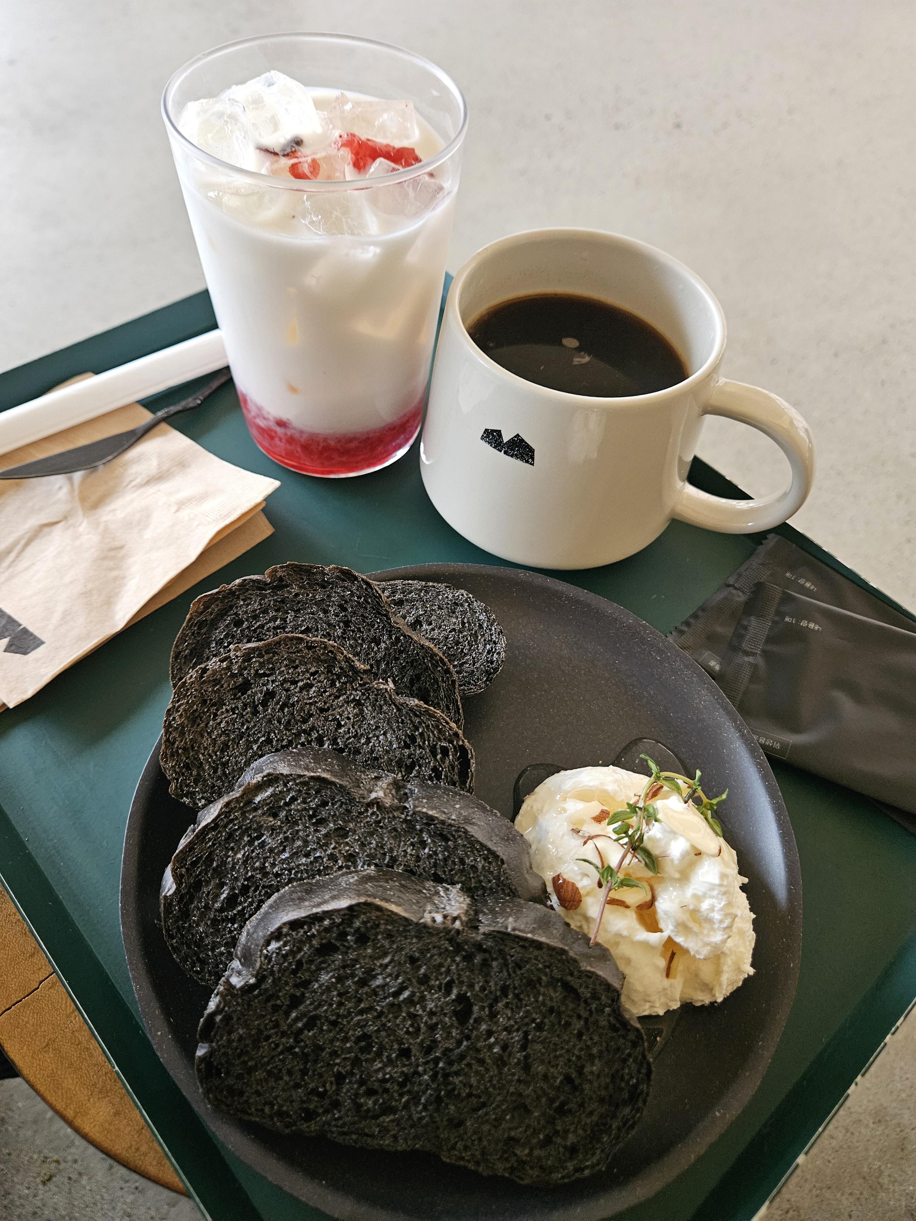묵리459 컨셉에 걸맞게 묵리 카이막은 먹물 브레드 4-5조각에 카이막 2 스쿱 정도에 꿀과 아몬드 슬라이스, 허브를 올려 검은 플레이트에 담겨 제공됐다. 커피는 머그잔, 생딸기 라떼는 텀블러 사이즈 투명 잔에 나왔다.