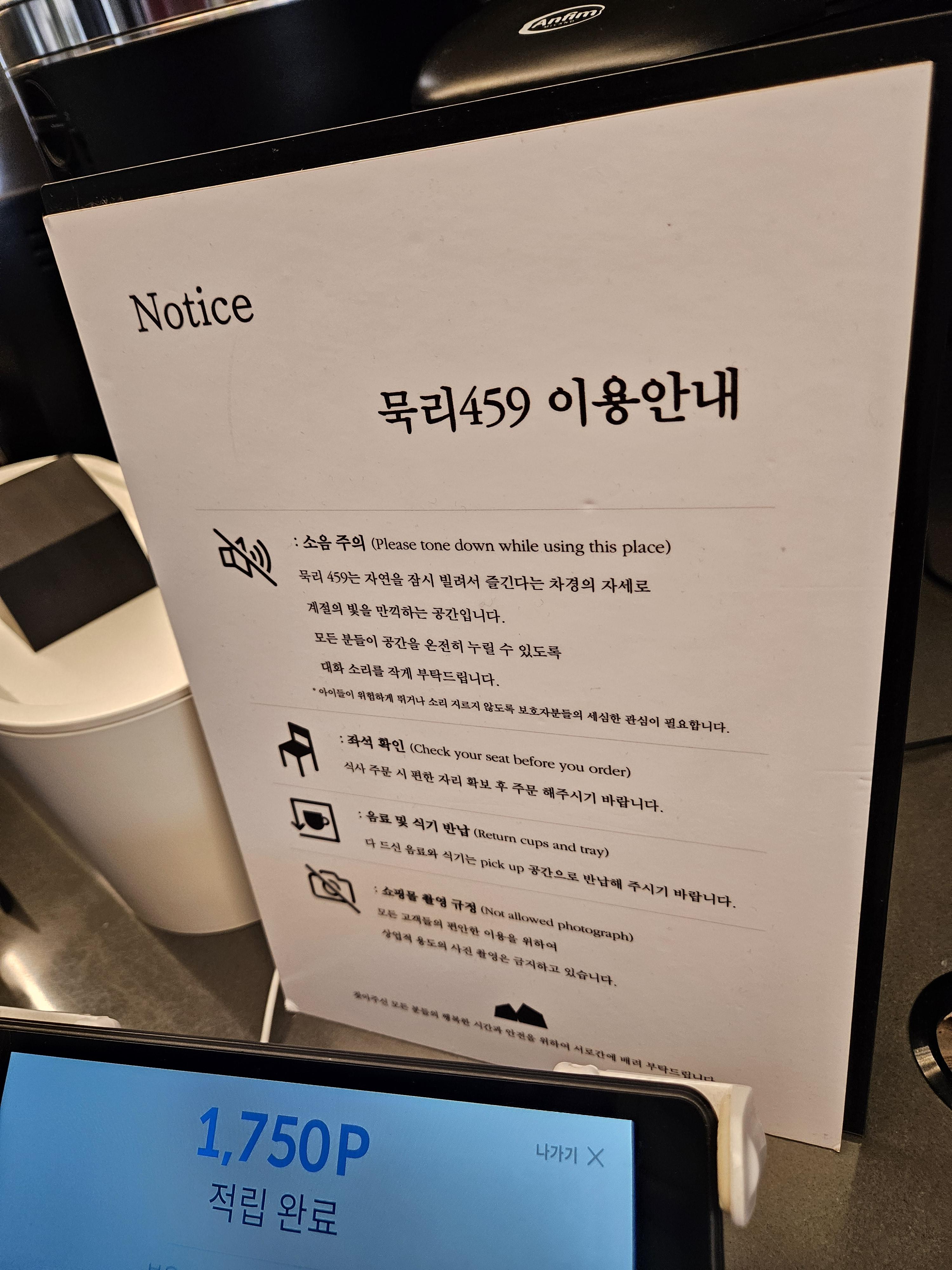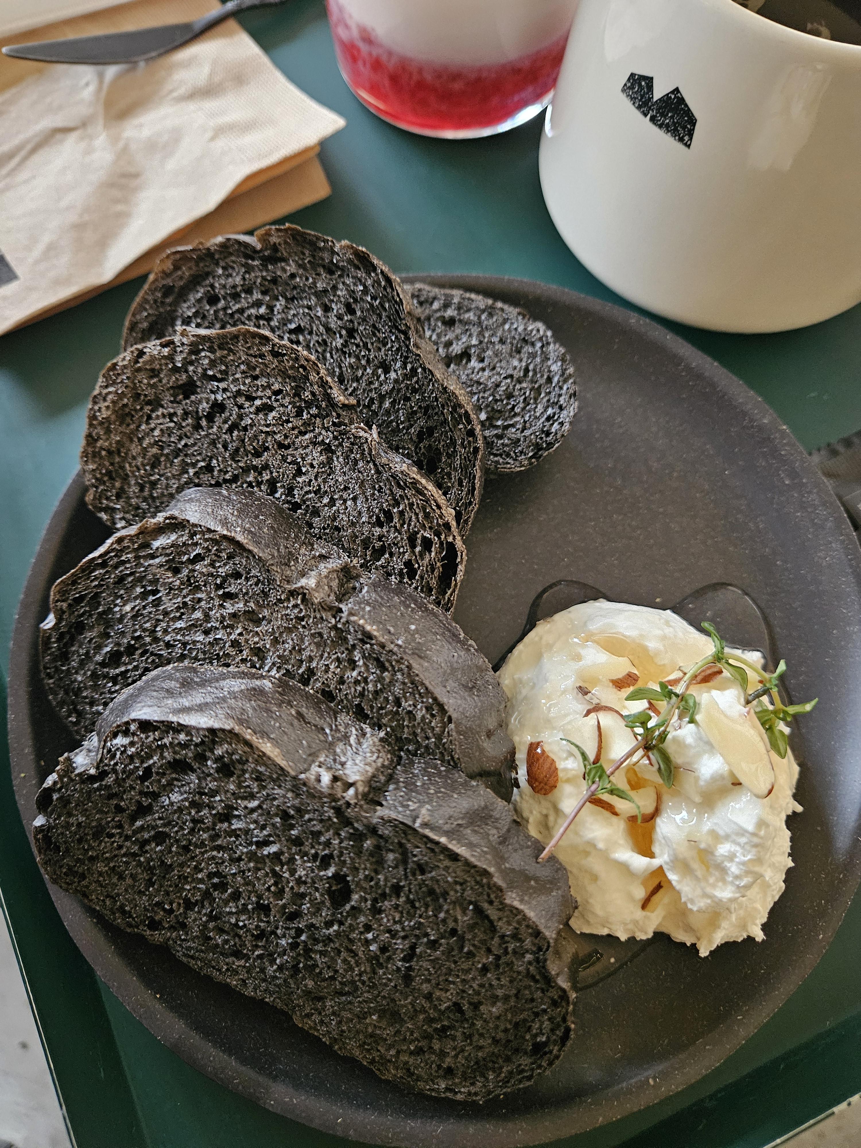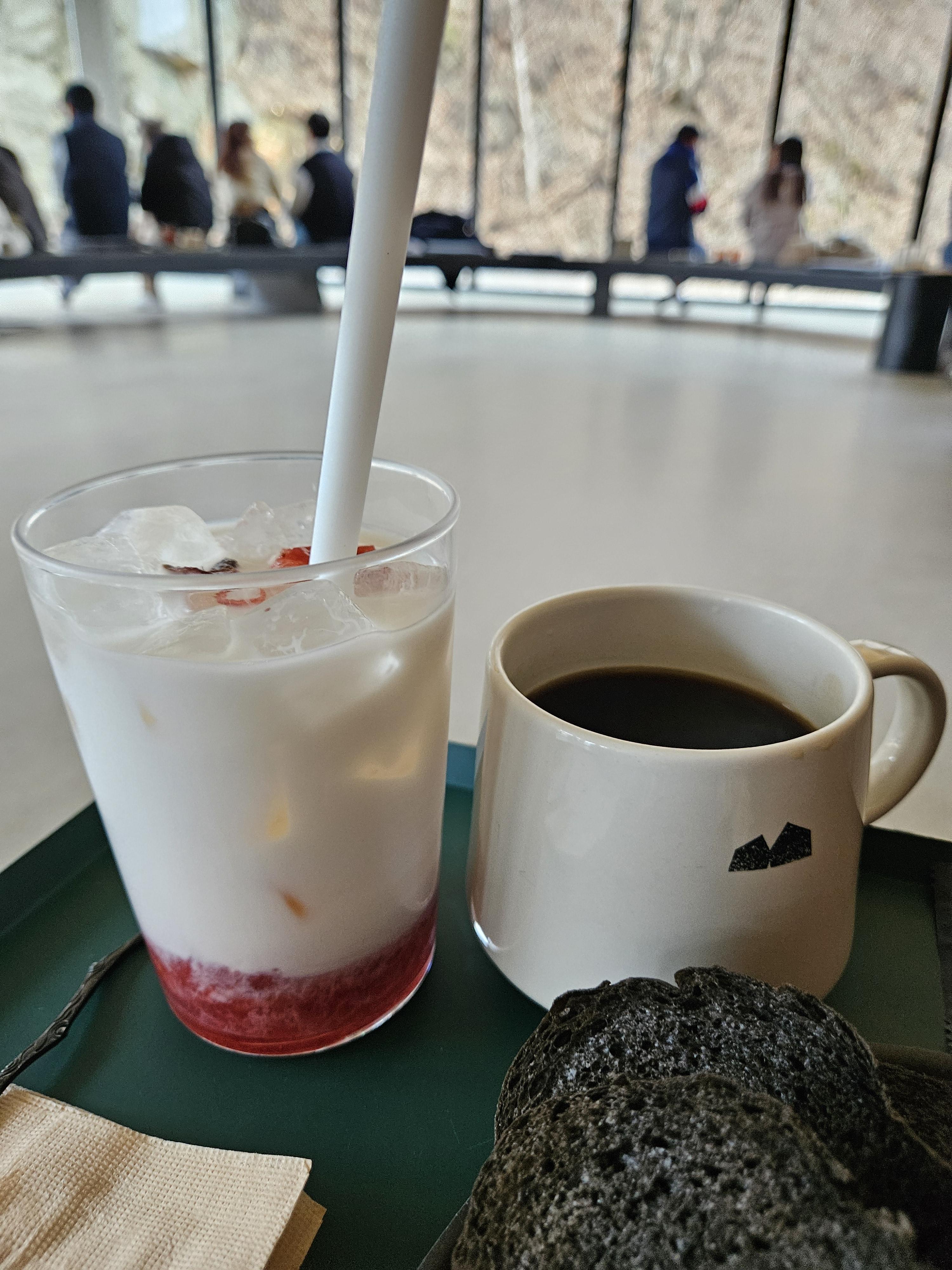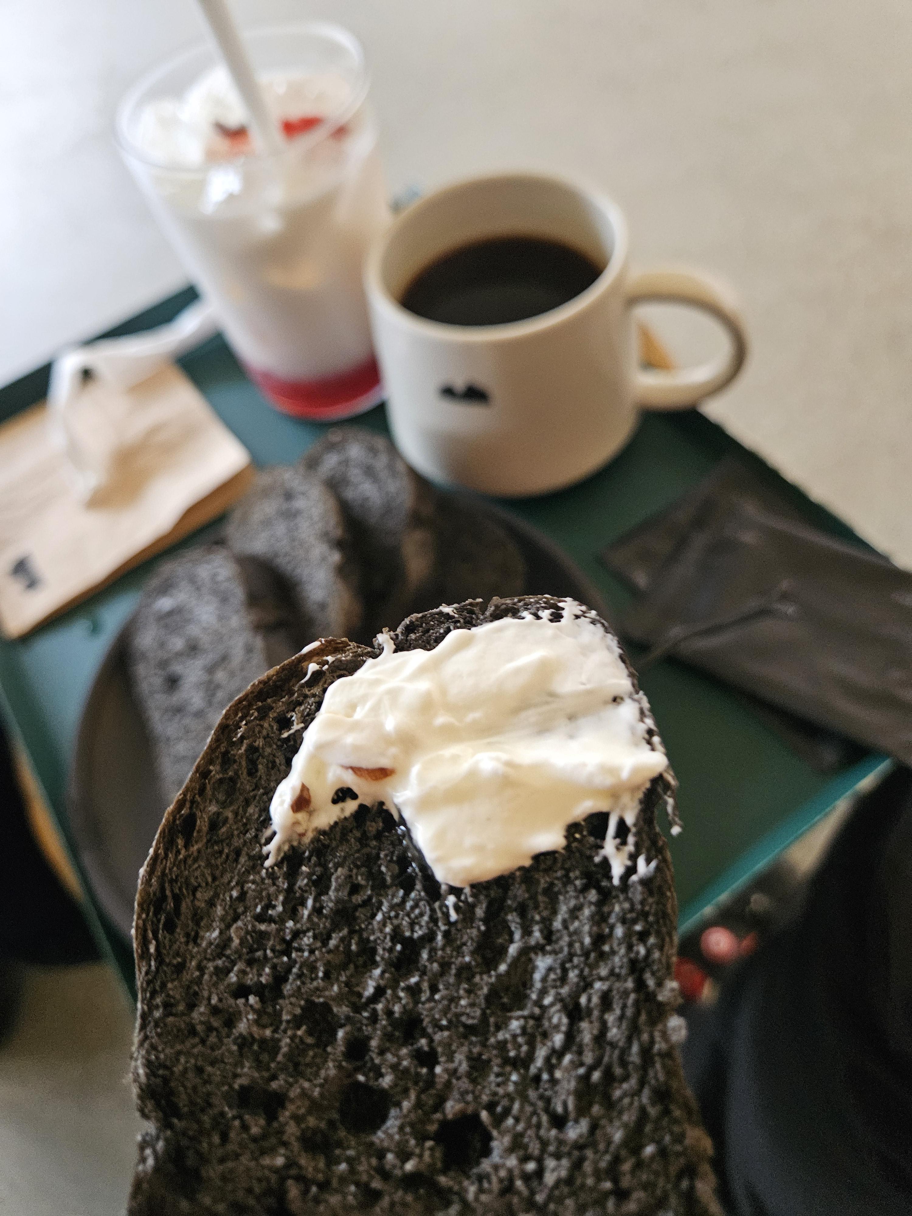 묵리459 컨셉에 걸맞게 묵리 카이막은 먹물 브레드 4-5조각에 카이막 2 스쿱 정도에 꿀과 아몬드 슬라이스, 허브를 올려 검은 플레이트에 담겨 제공됐다. 커피는 머그잔, 생딸기 라떼는 텀블러 사이즈 투명 잔에 나왔다.