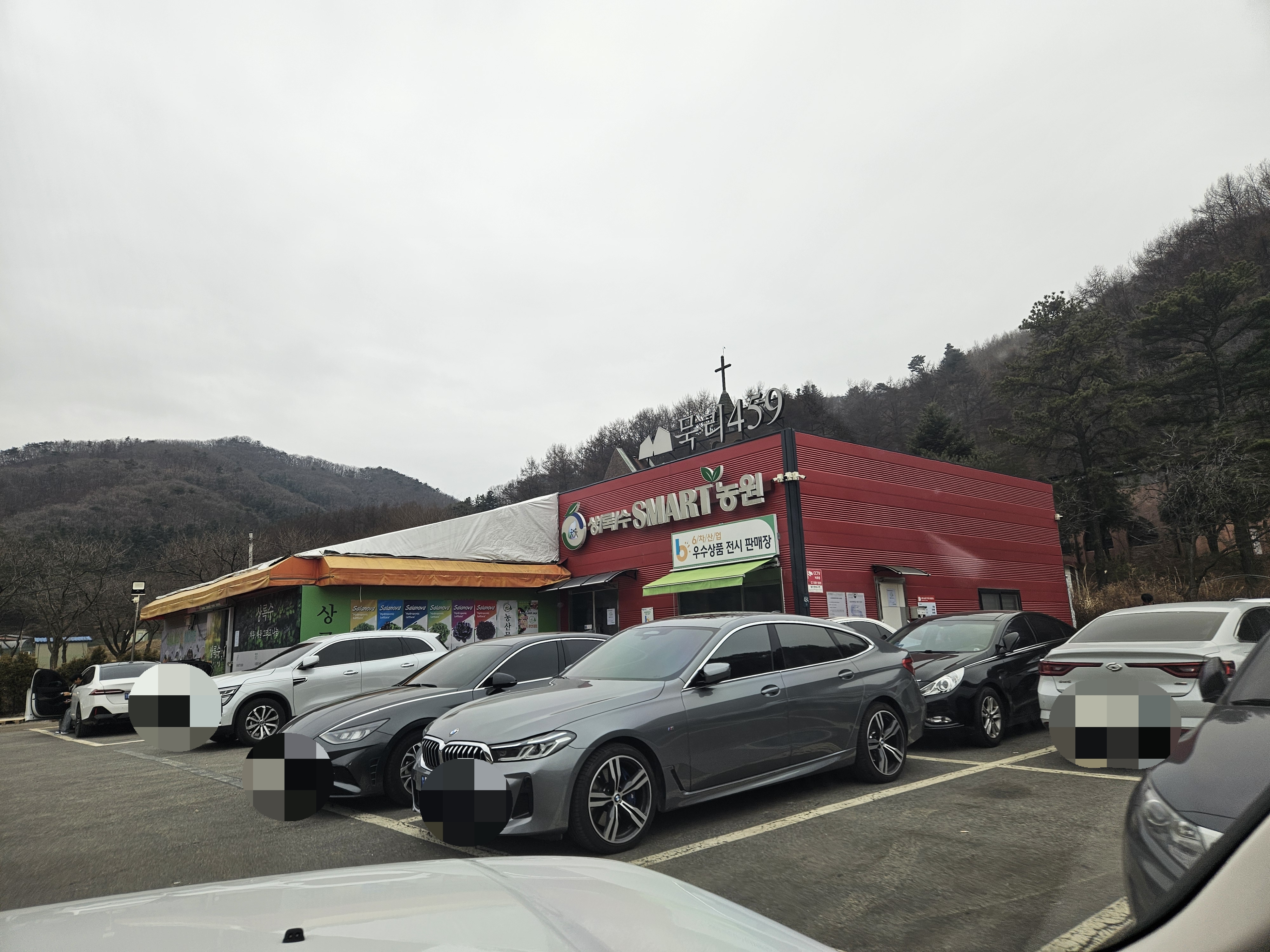 위치: 주차 차단바 설치된 빨간 상록수농원 건물 앞 주차장 이용 후 50m 묵리 459로 이동