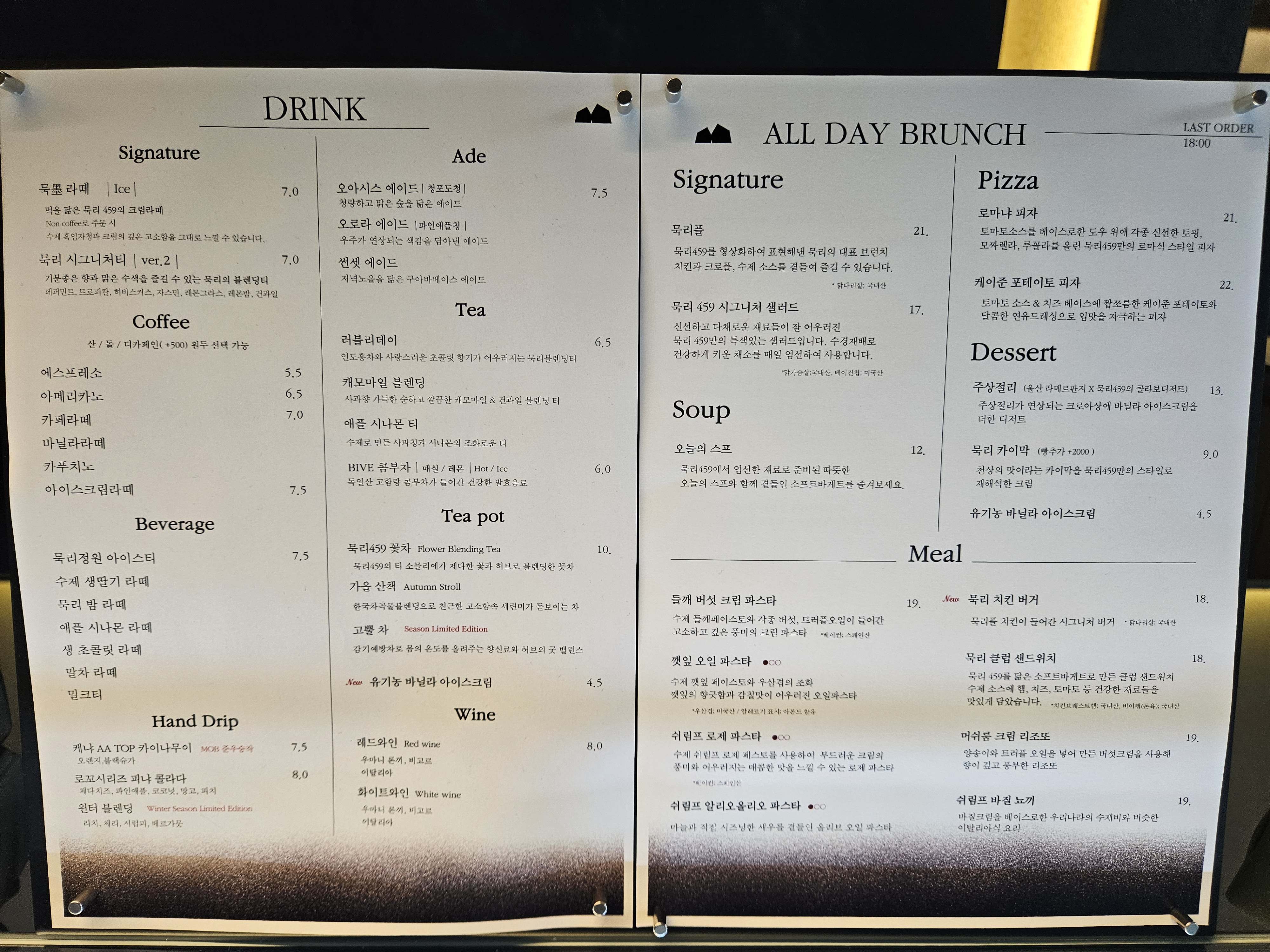 메뉴는 All day brunch와 Drink 메뉴로 나뉜다.